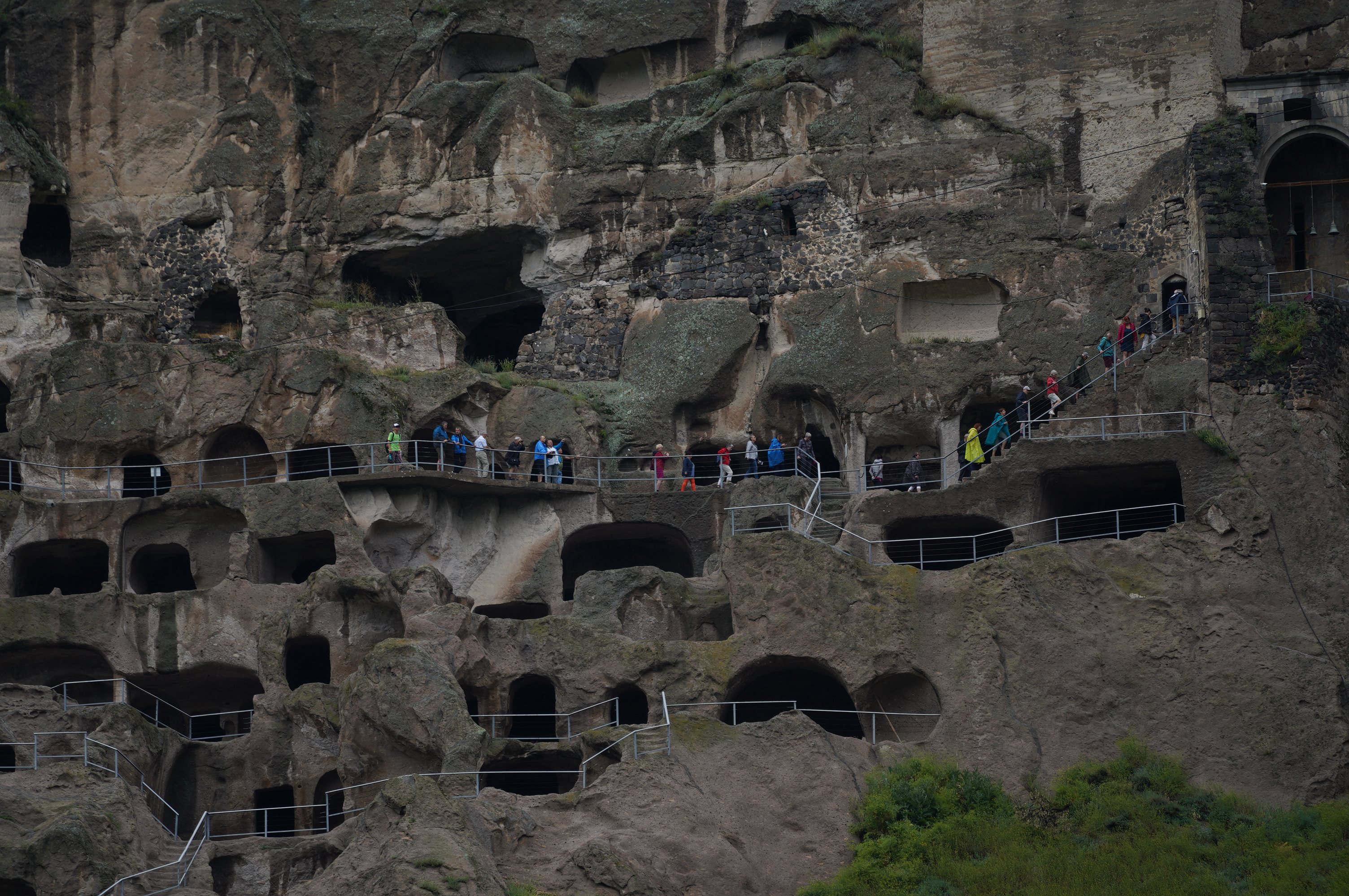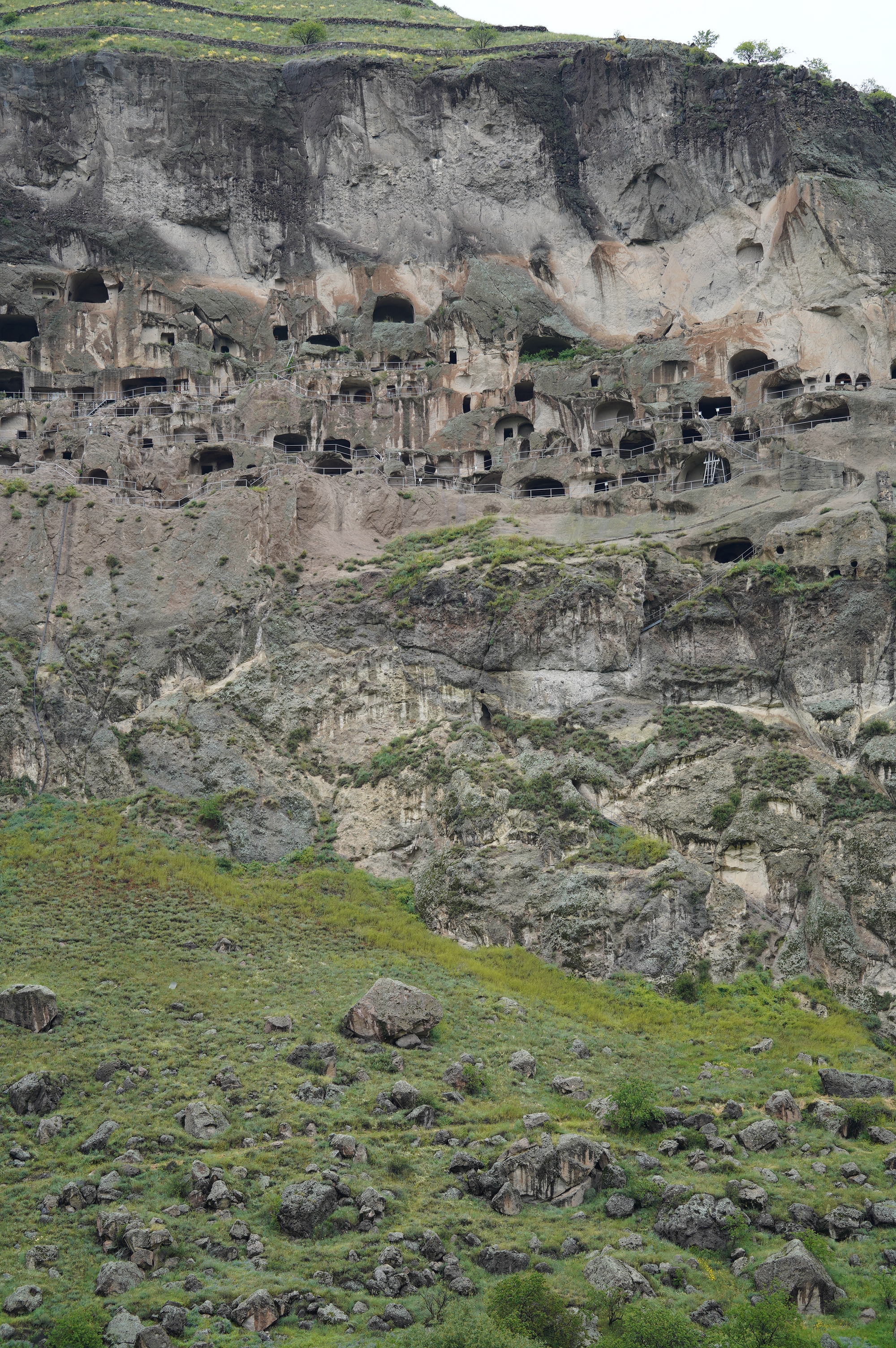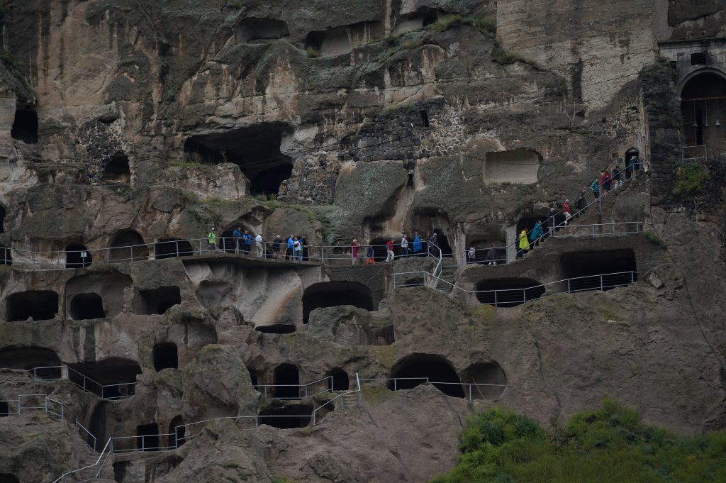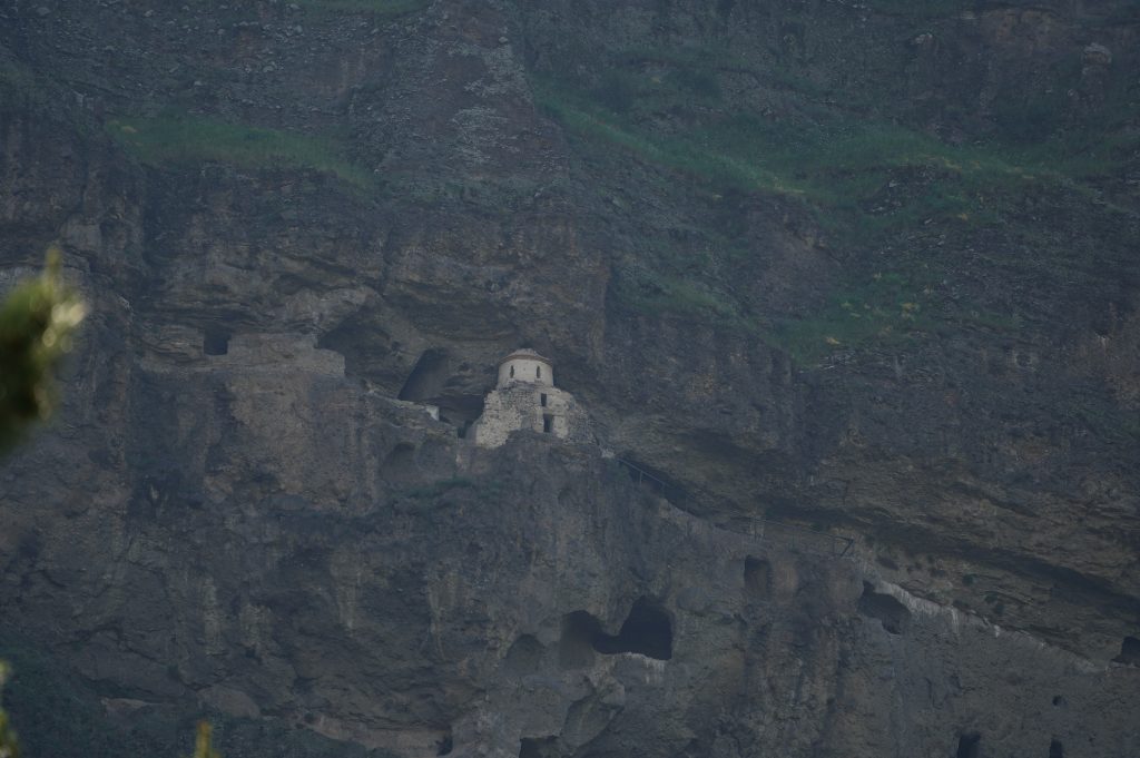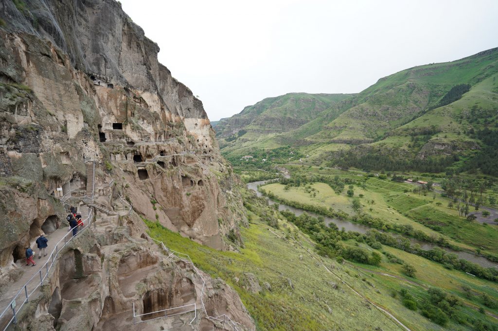 der Abgang in mehreren Tunneltreppensuper Stellplatz die erste Nacht in Georgiender Weinberg direkt unterhalb des HöhlenbergesWanis Kwabebi (Wegen Steinschlaggefahr darf man nicht mehr hinaufsteigen)KuratalFestung Khertvisi am TaleingangBlick auf die 691 Richtung Westen, Richtung BojumiBlick zurück ins Kura Tal