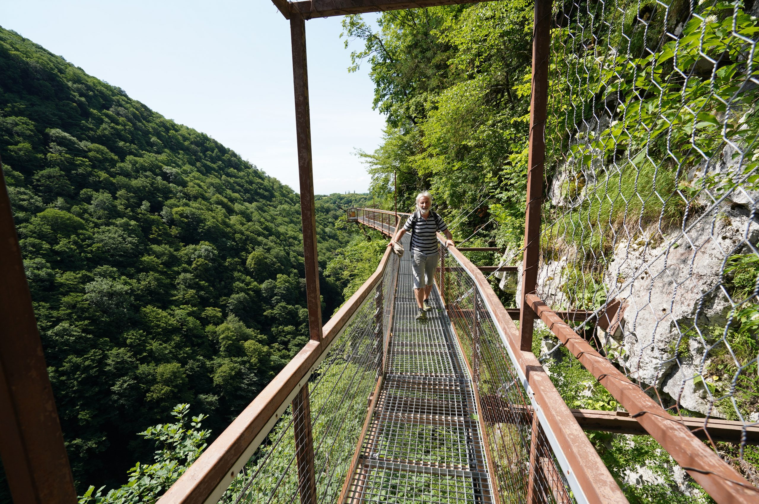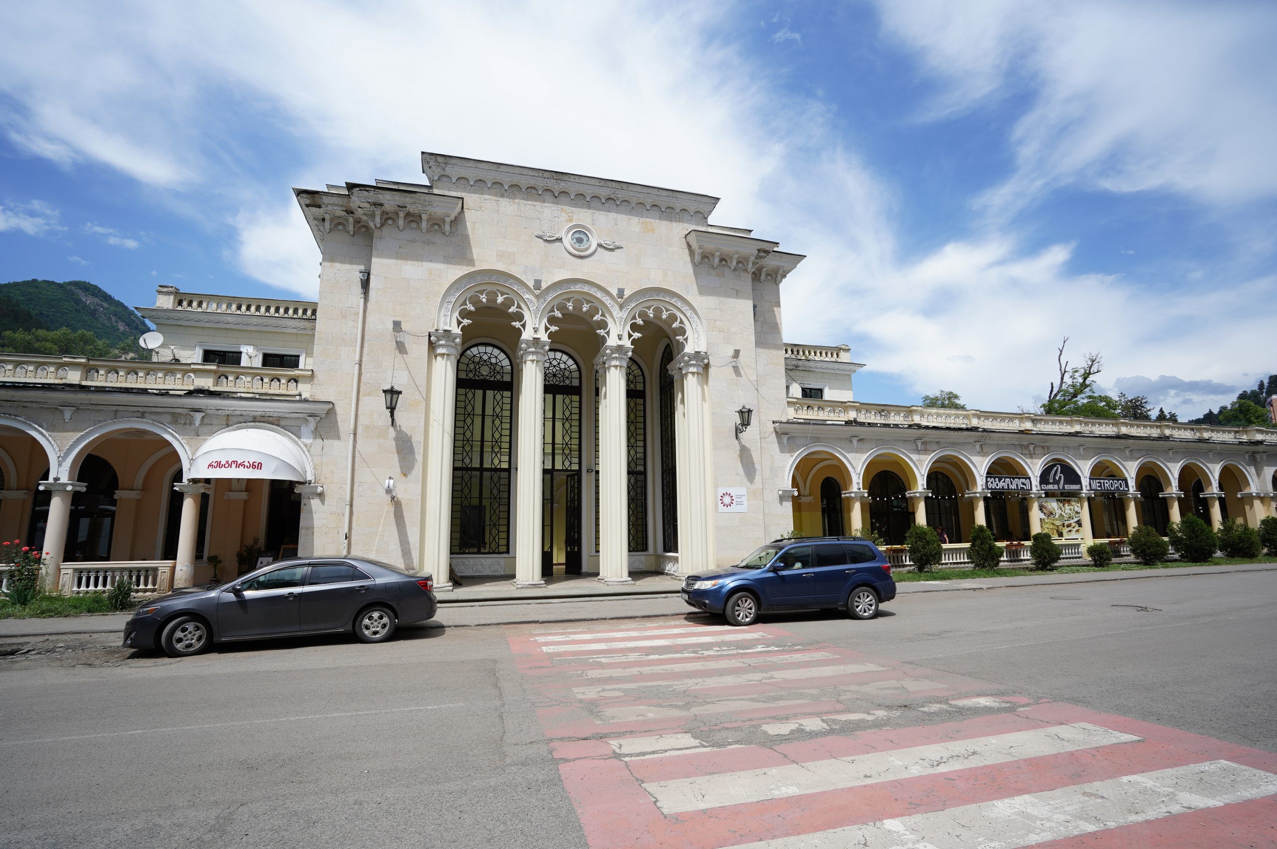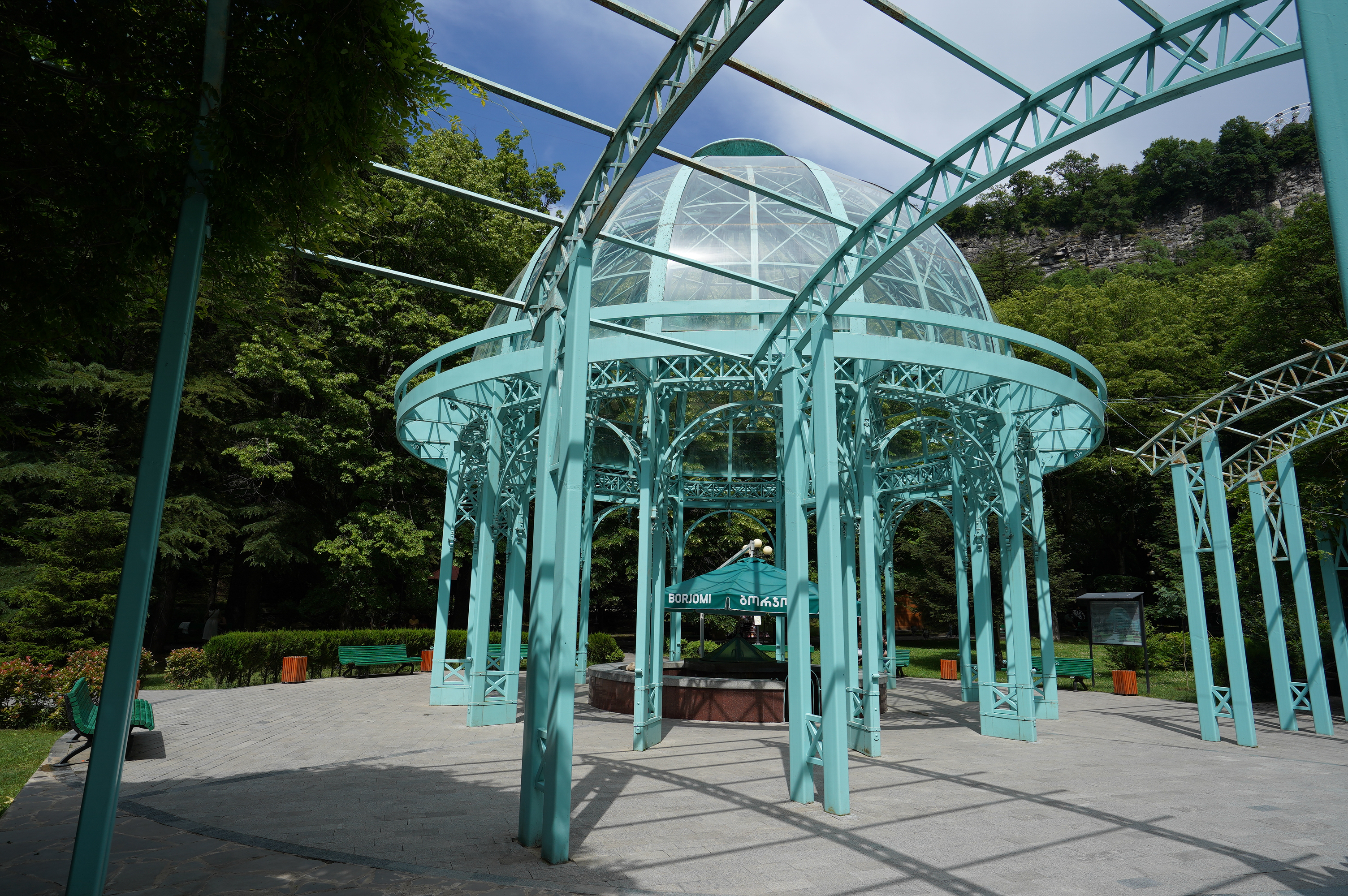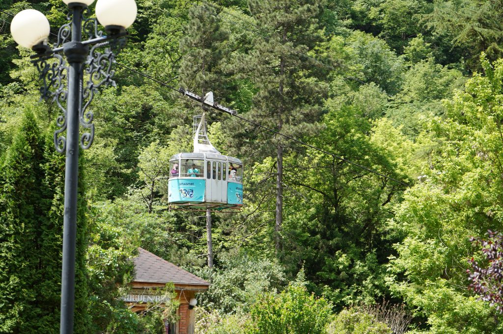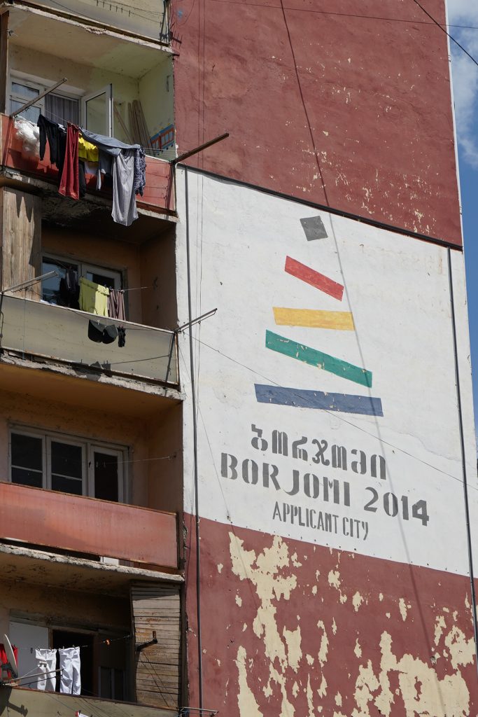 …der prächtige Bahnhof…nur noch Kulisse.Der Fahrplan hängt noch im Bahnhof…von hier fuhren Züge direkt bis Moskauein paar Luxushotels sind entstanden… für die Kundschaft aus Dubai oder Saudi Arabienunter diesen Pavillon sprudelt das Mineralwasser.es hat ca. 32 Grad und Schwefelgeruch….nicht wirklich leckerdie so genannte Liebesbrückehinter dem Kurpark geht der schöne Waldweg zum Thermalbad…hier im Thermalbad waren fast ausschließlich Georgierein Großteil des Kurparks ist ein Freizeitpark…mit der Gondel auf das Plateau über Borjomi…nein nicht mit Helm in der Gondel…war mit Rad unterwegs und nur von der Bergstation hat man die Sicht auf den Ort….ansonsten sieht es eher so aus