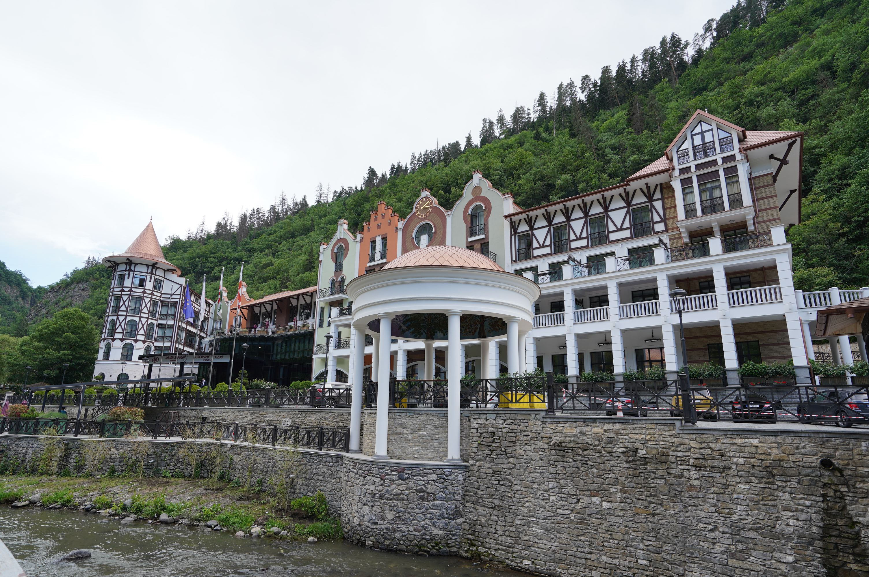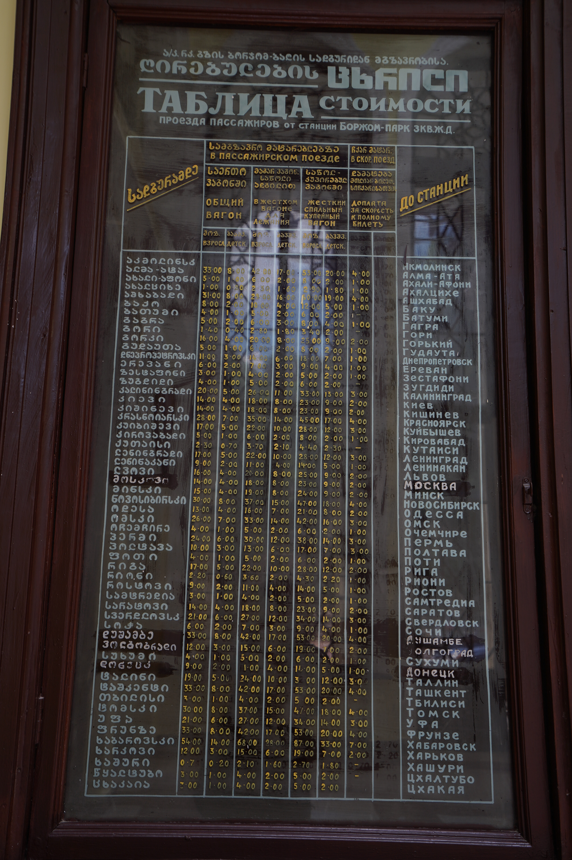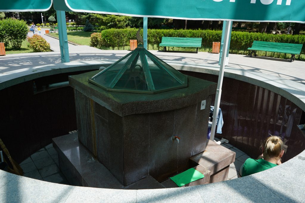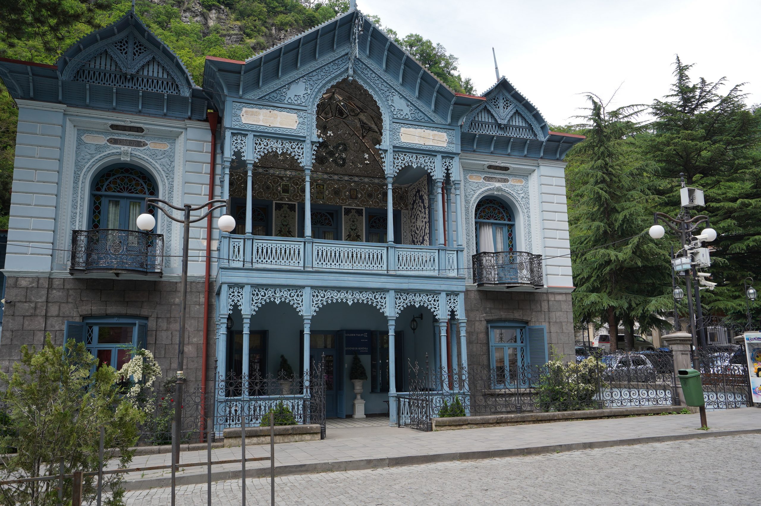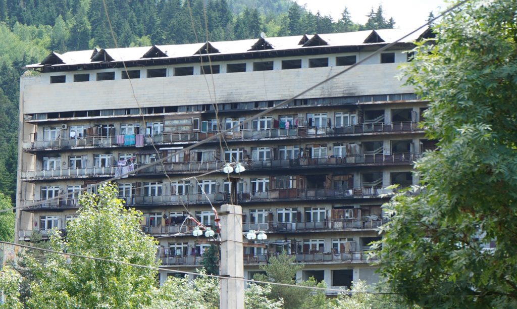 …der prächtige Bahnhof…nur noch Kulisse.Der Fahrplan hängt noch im Bahnhof…von hier fuhren Züge direkt bis Moskauein paar Luxushotels sind entstanden… für die Kundschaft aus Dubai oder Saudi Arabienunter diesen Pavillon sprudelt das Mineralwasser.es hat ca. 32 Grad und Schwefelgeruch….nicht wirklich leckerdie so genannte Liebesbrückehinter dem Kurpark geht der schöne Waldweg zum Thermalbad…hier im Thermalbad waren fast ausschließlich Georgierein Großteil des Kurparks ist ein Freizeitpark…mit der Gondel auf das Plateau über Borjomi…nein nicht mit Helm in der Gondel…war mit Rad unterwegs und nur von der Bergstation hat man die Sicht auf den Ort….ansonsten sieht es eher so aus