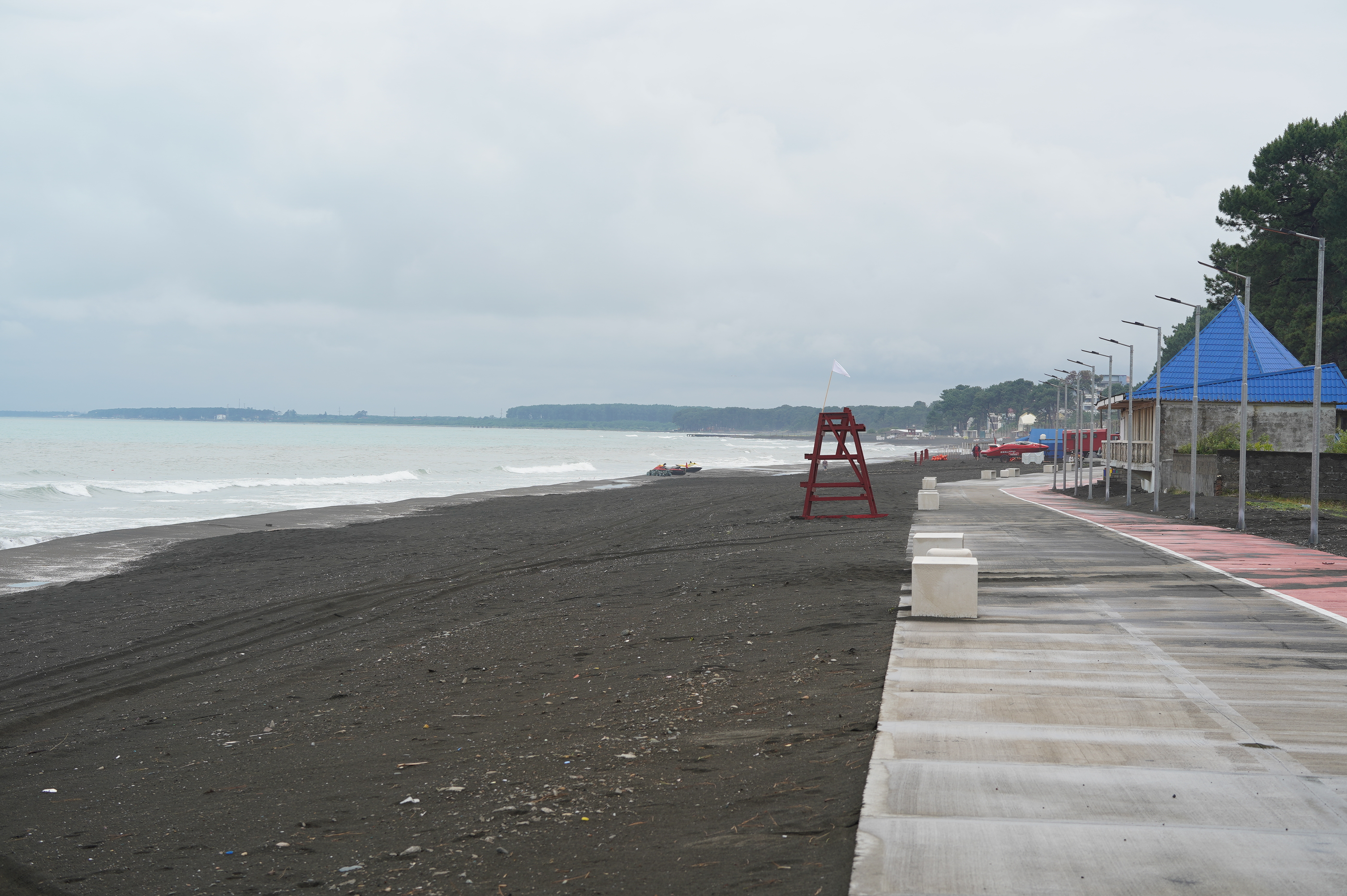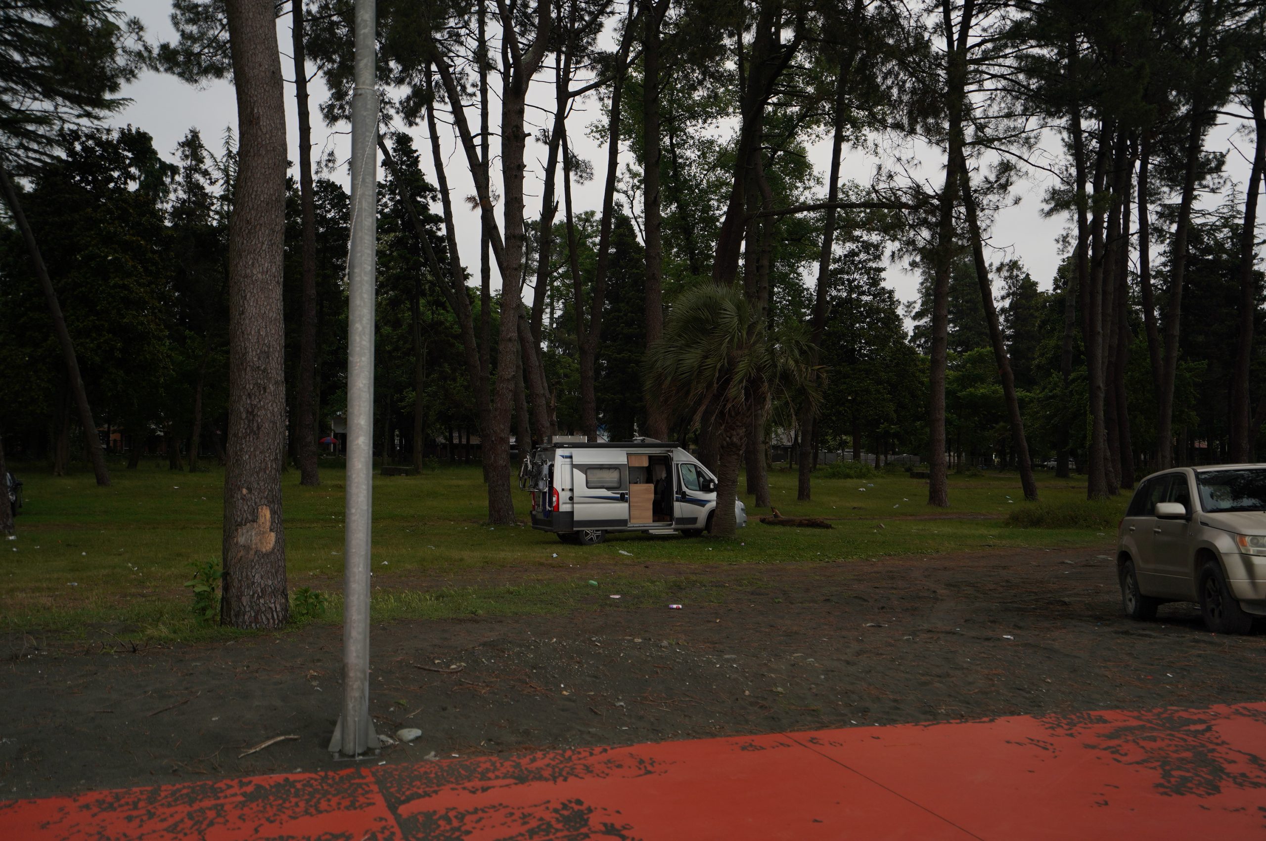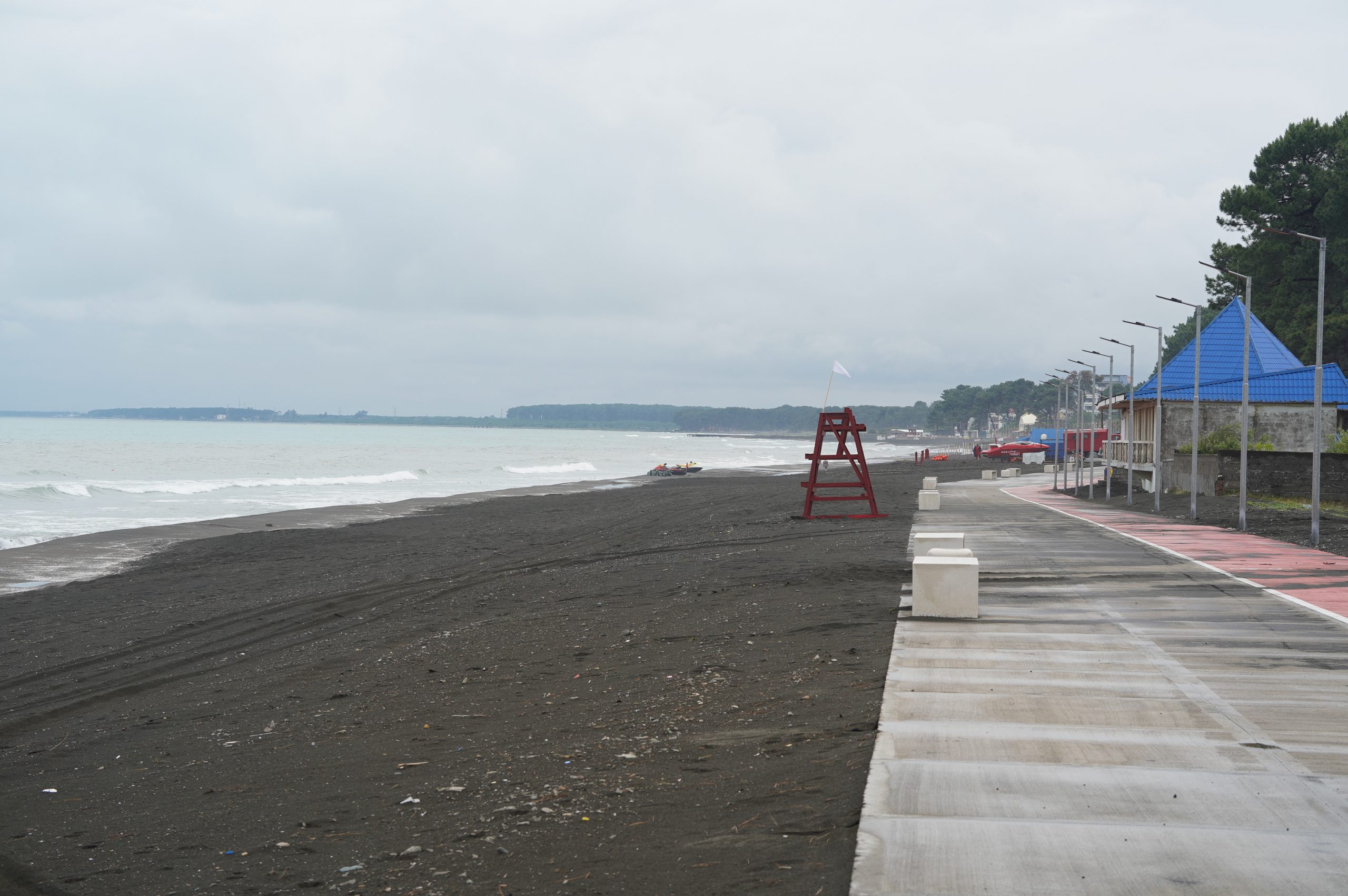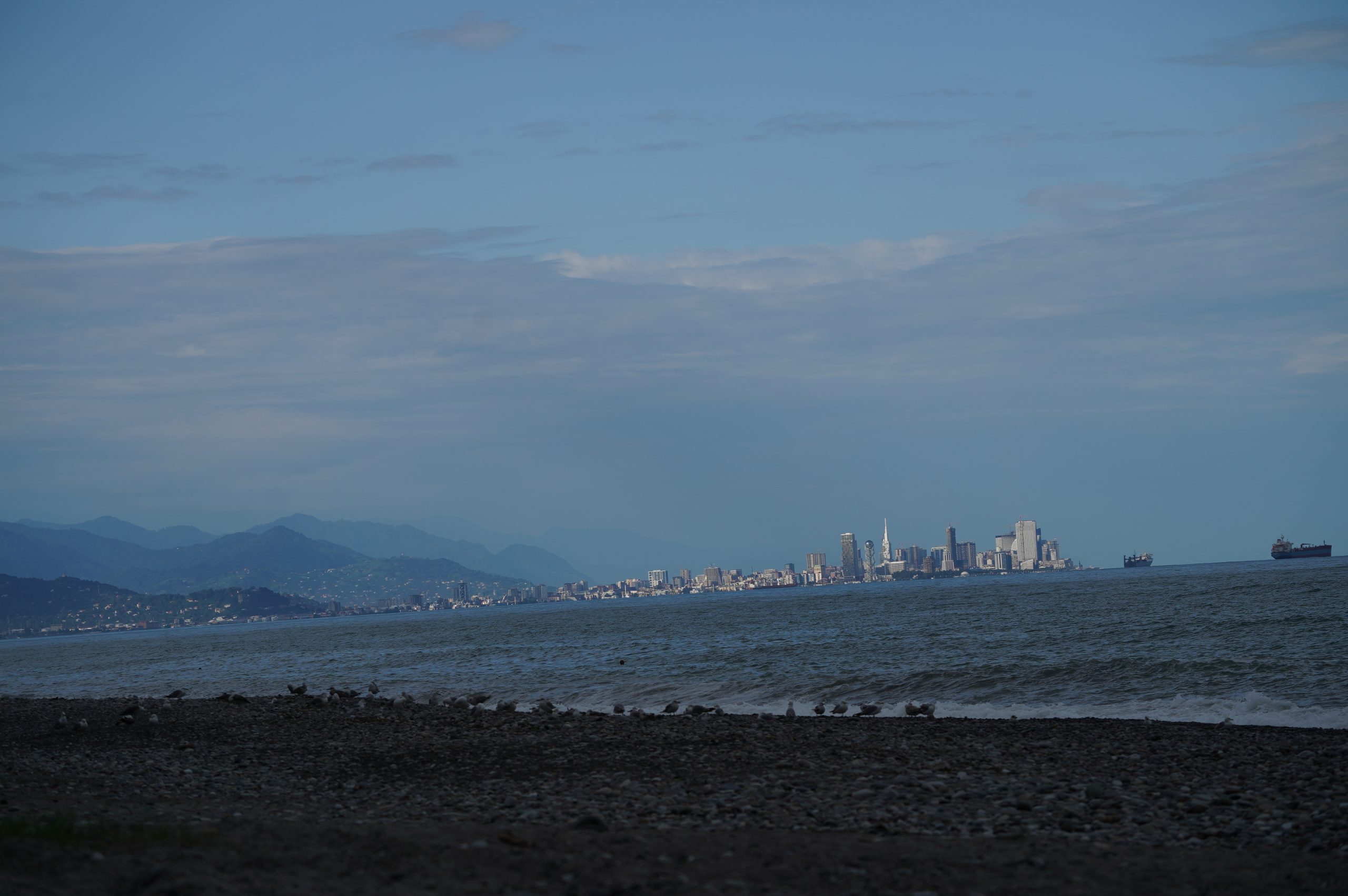 Über die Hafenstadt Poti bin ich dann am Abend am schwarzen Meer angekommen, an der Ureki Beach. Dort gibt es einige Hotels, aber vieles ist wie überall ziemlich verkommen. An einen frei zugänglichen Park direkt am Meer habe ich mir einen Übernachtungsplatz gesucht. Feiner schwarzer Sand und recht sauber.