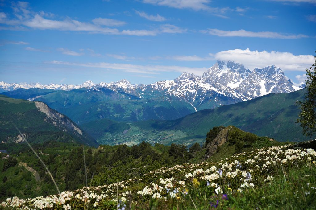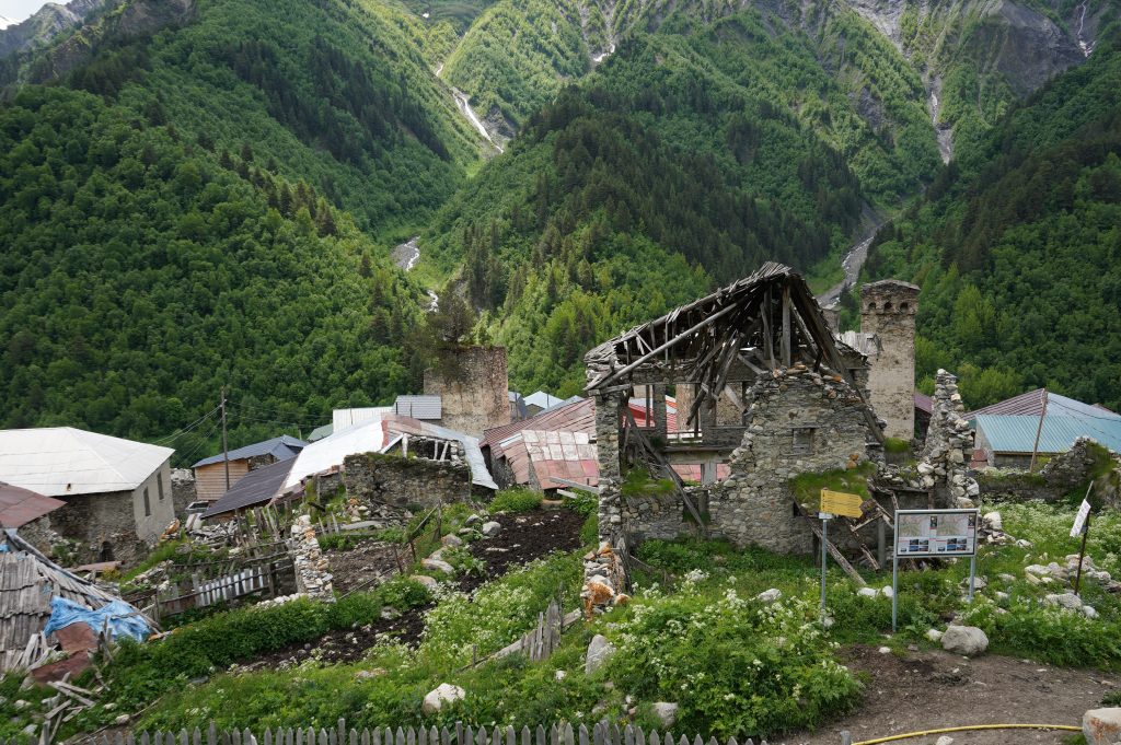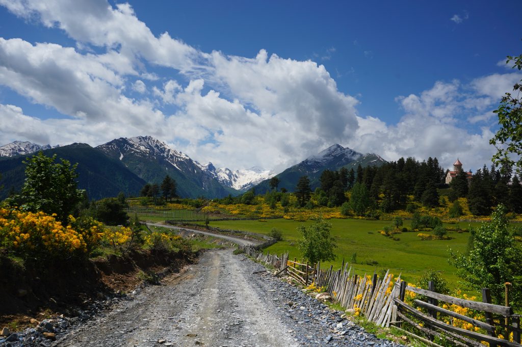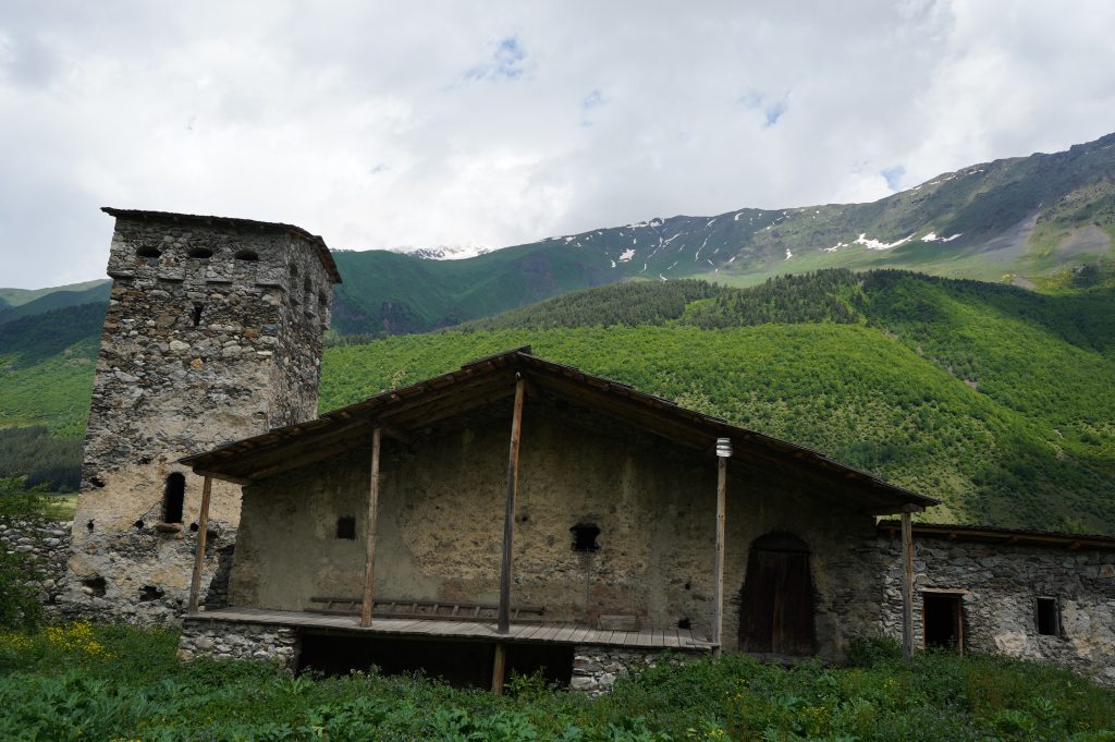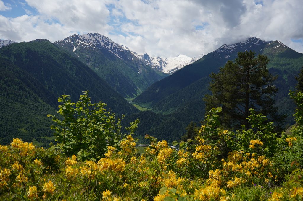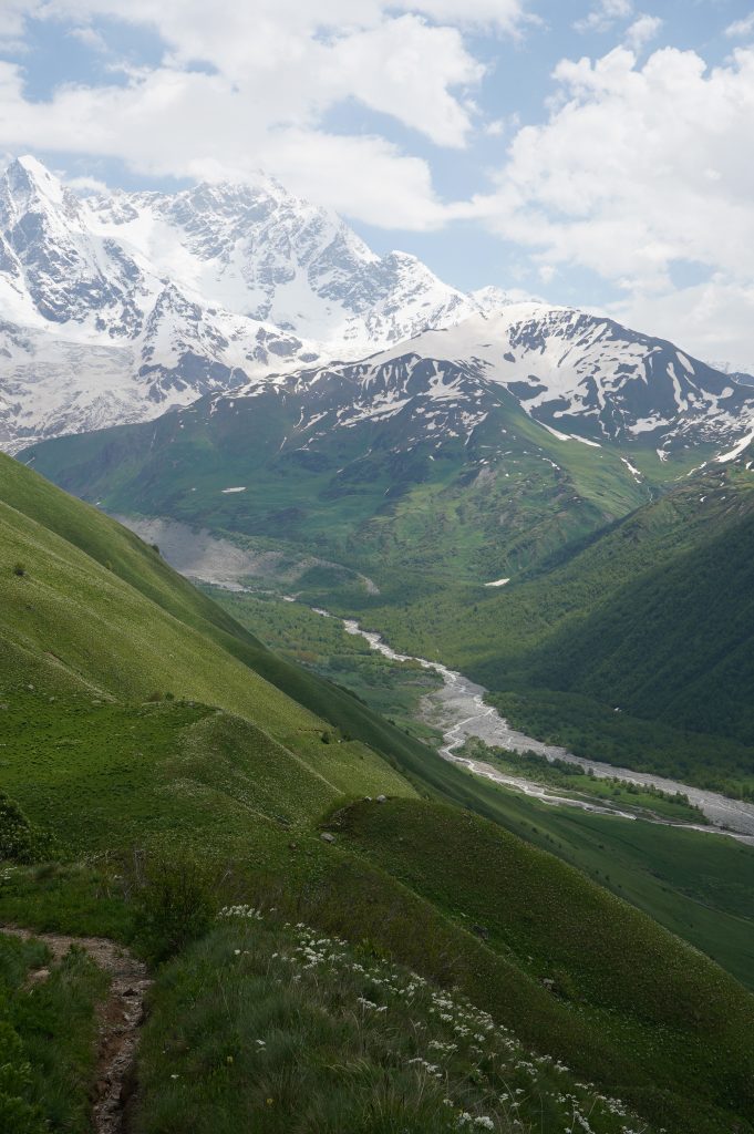 das Wetter bessert sich, langsam werden die Berge sichtbardass Flüsse bzw. Bäche über die Straße fließen ist ganz normalSchotterweg nach Tsvirmi. Wunderschöne BlütenprachtBlick in das Enguri-Tal Richtung UschguliZhambeshialtes Haus von ZhambeshiMestia, Blick von der Kirche