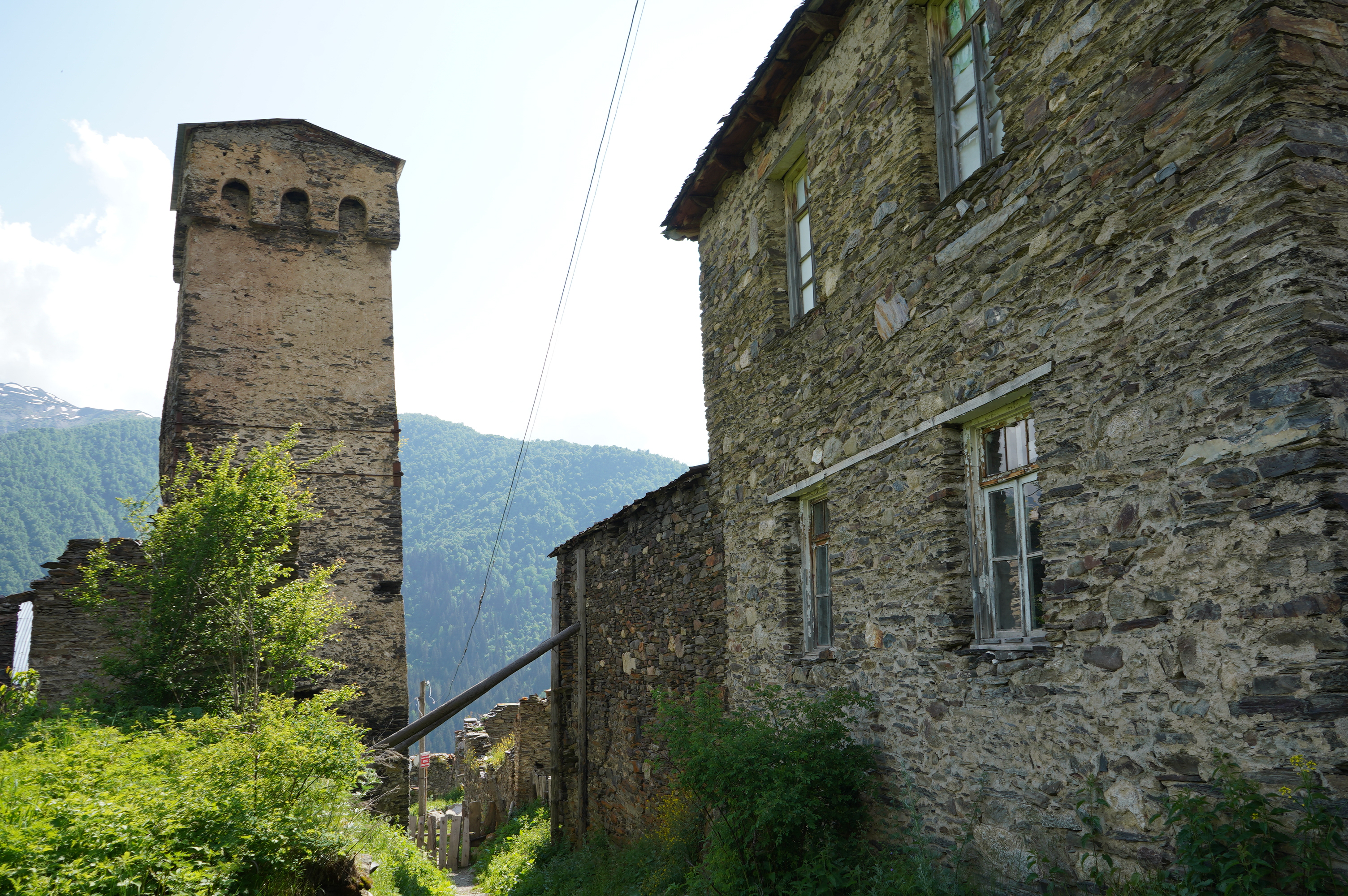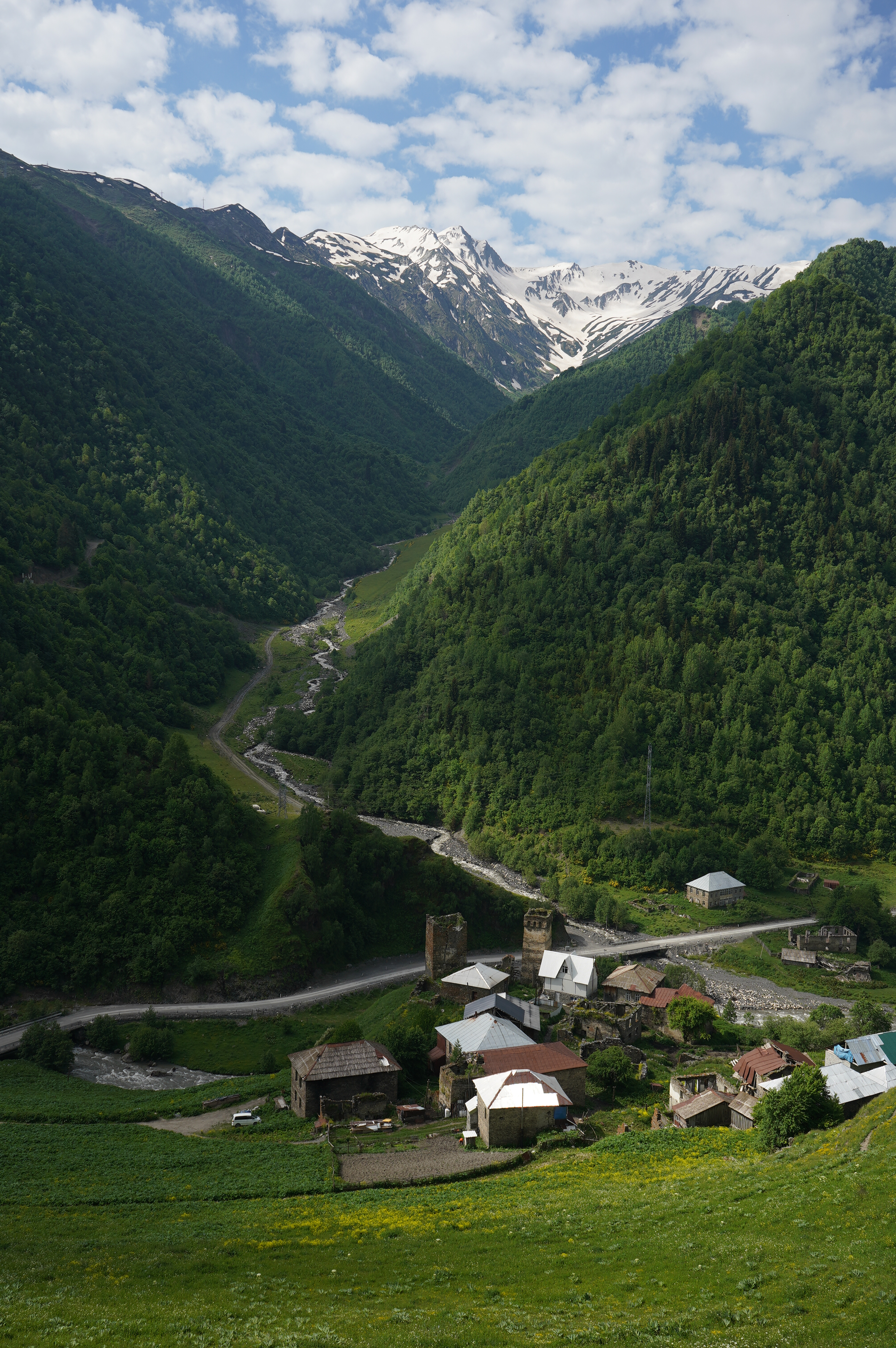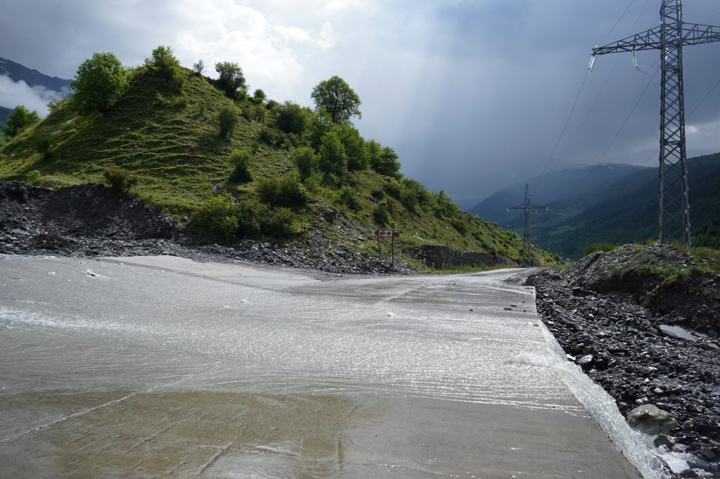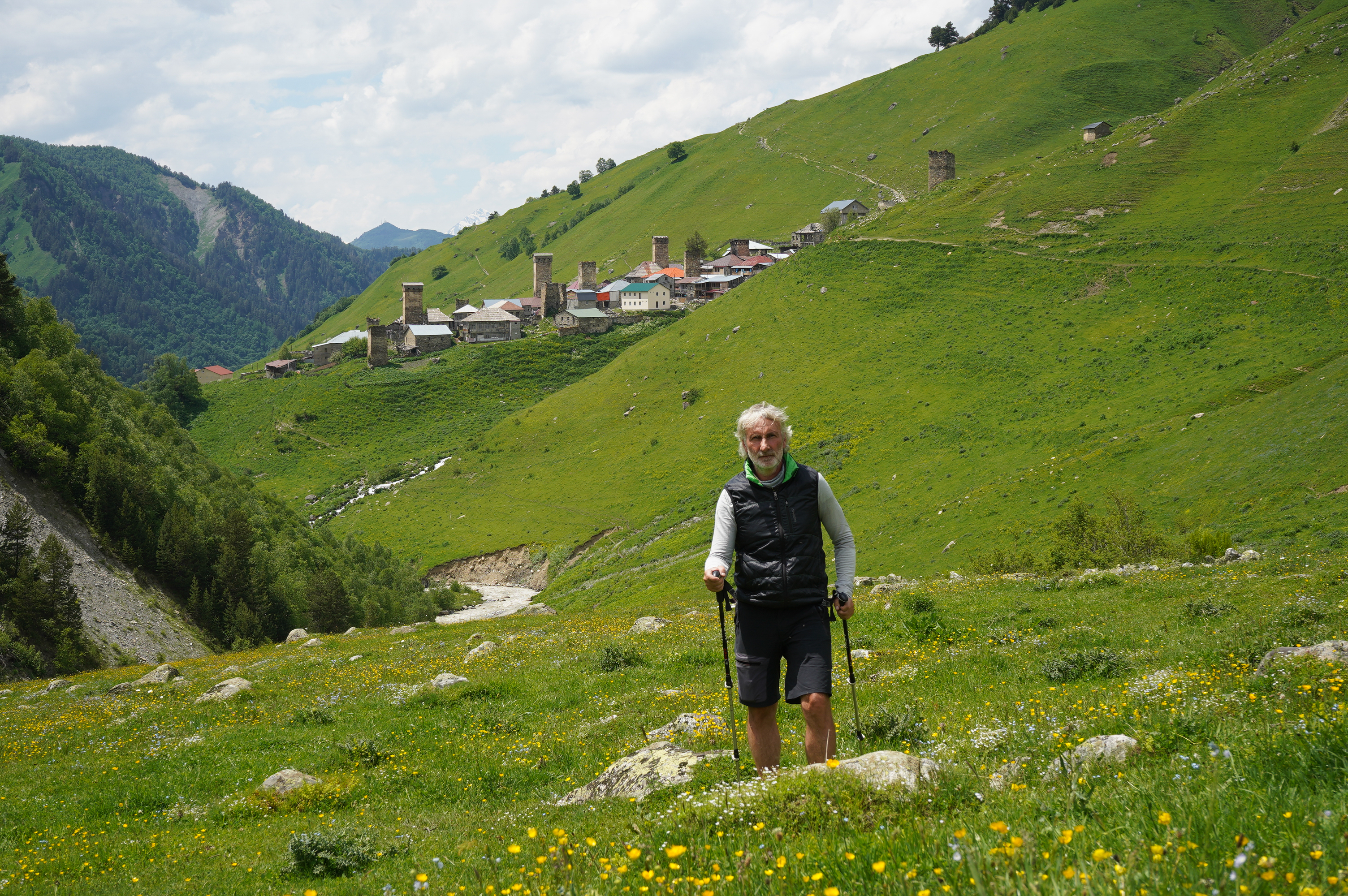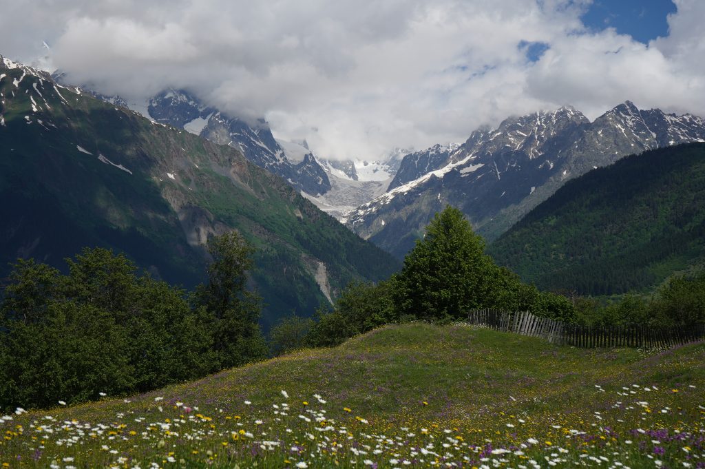 das Wetter bessert sich, langsam werden die Berge sichtbardass Flüsse bzw. Bäche über die Straße fließen ist ganz normalSchotterweg nach Tsvirmi. Wunderschöne BlütenprachtBlick in das Enguri-Tal Richtung UschguliZhambeshialtes Haus von ZhambeshiMestia, Blick von der Kirche