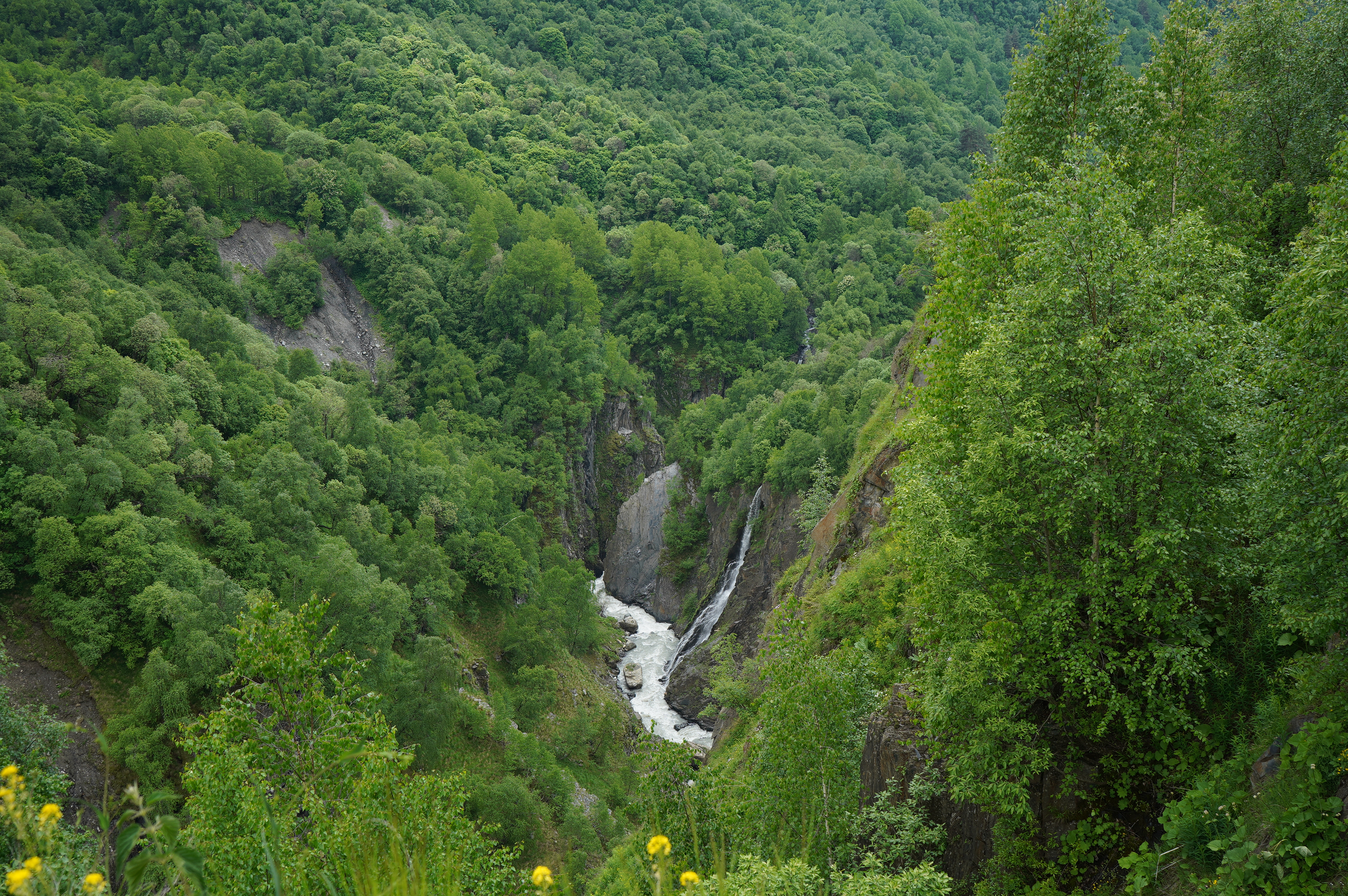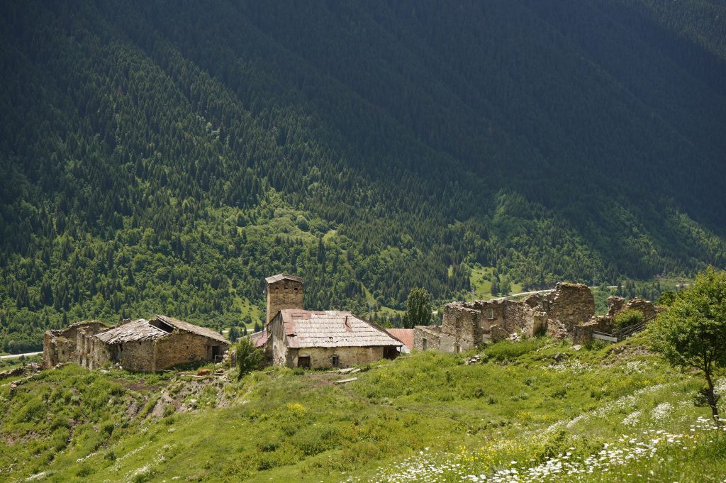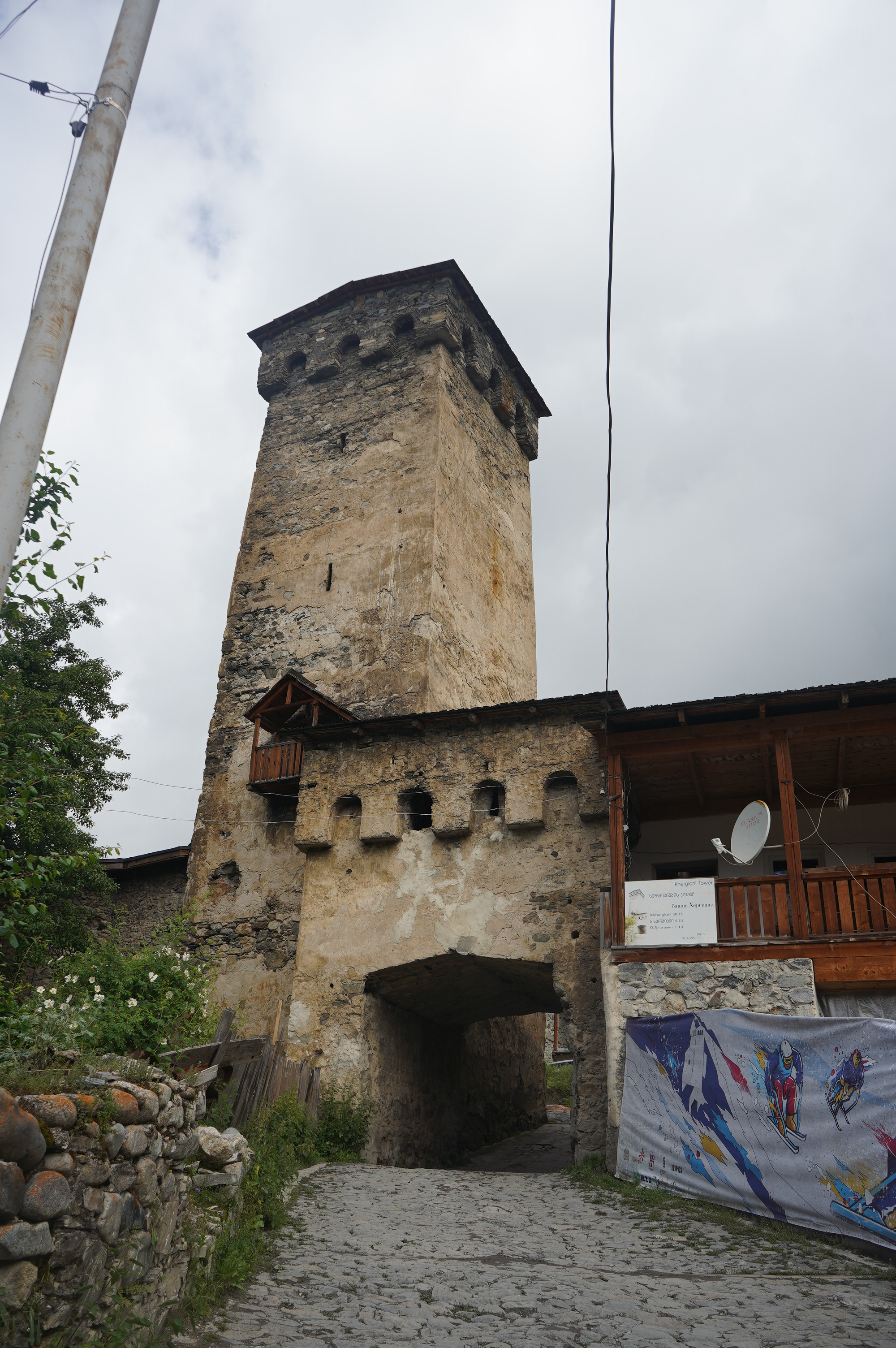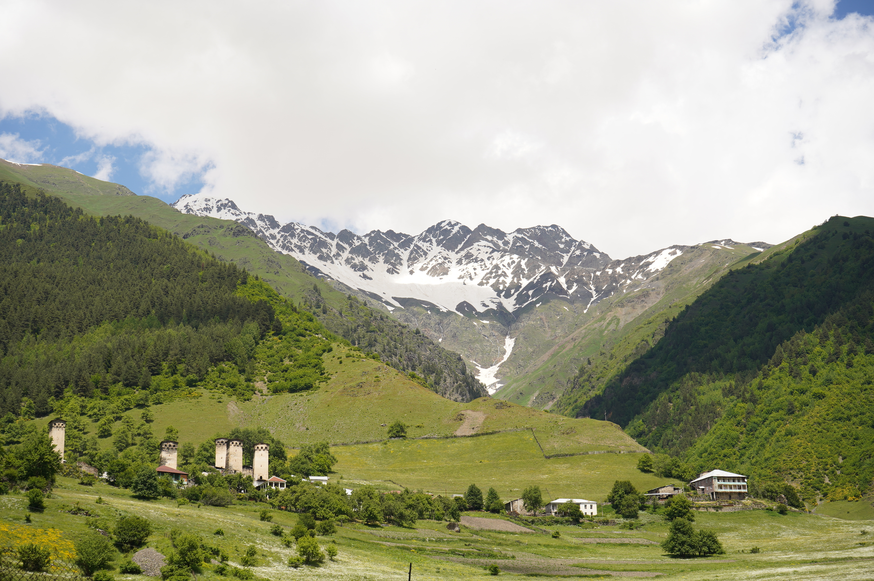 das Wetter bessert sich, langsam werden die Berge sichtbardass Flüsse bzw. Bäche über die Straße fließen ist ganz normalSchotterweg nach Tsvirmi. Wunderschöne BlütenprachtBlick in das Enguri-Tal Richtung UschguliZhambeshialtes Haus von ZhambeshiMestia, Blick von der Kirche
