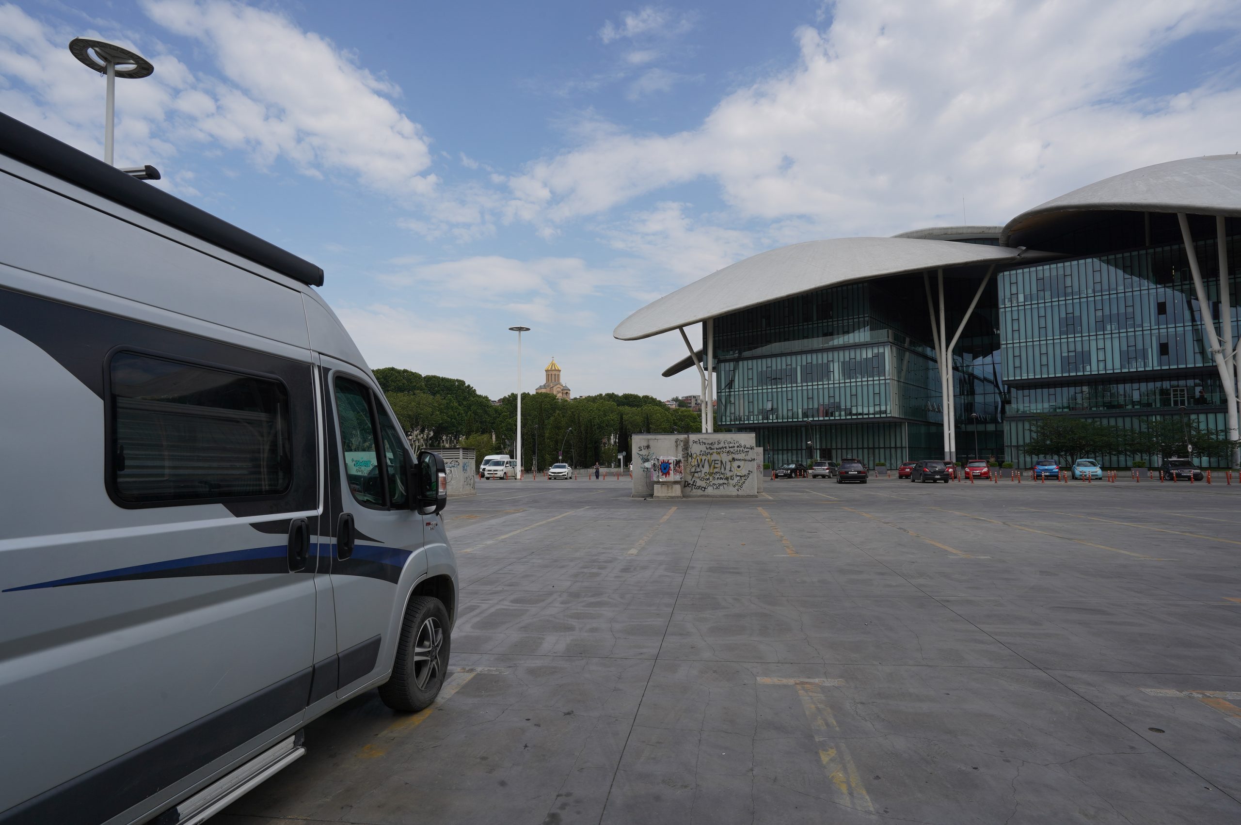 25.06.2022 Ankunft in Tbilisi. Der Parkplatz an der Public service hall war fast leer. Sehr zentral, alles zu Fuß zu erreichen.