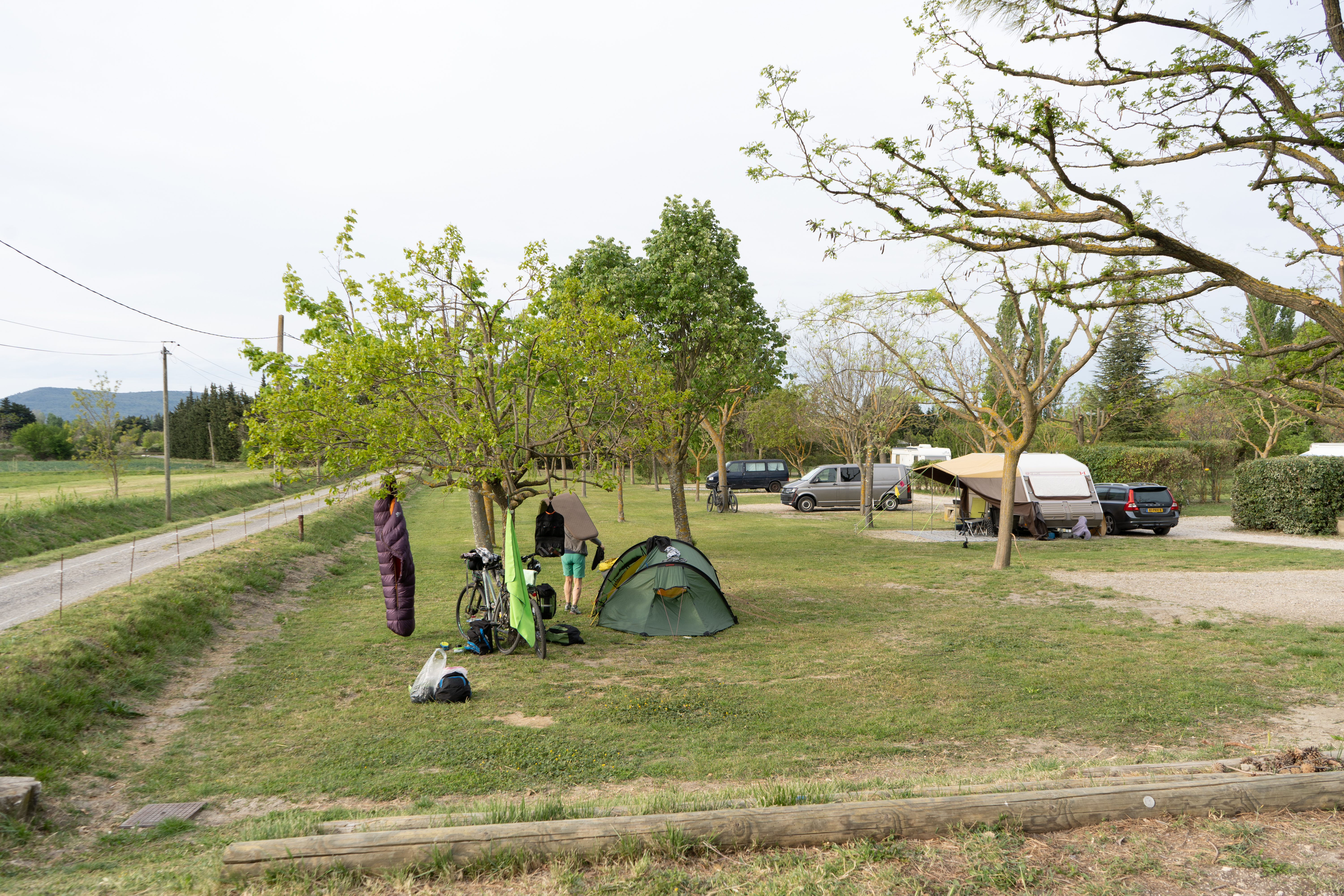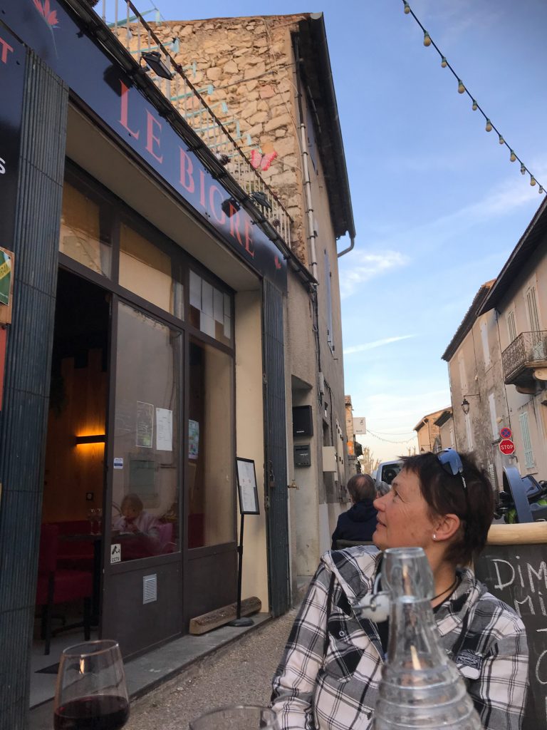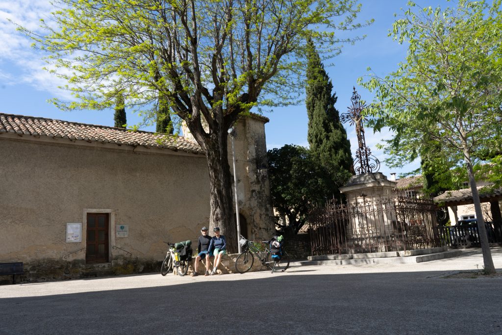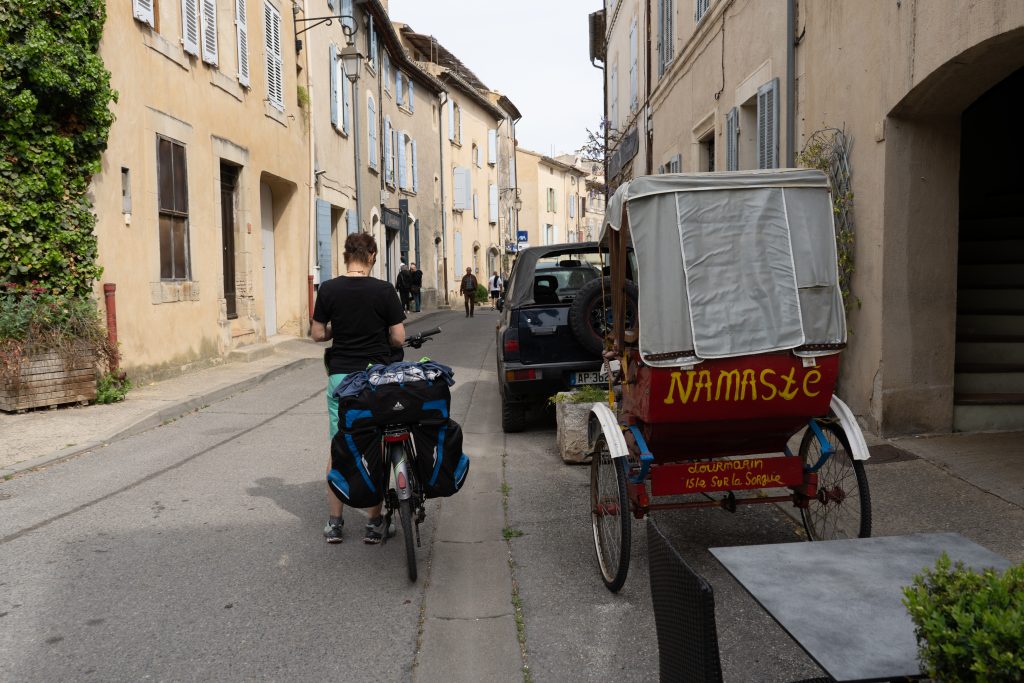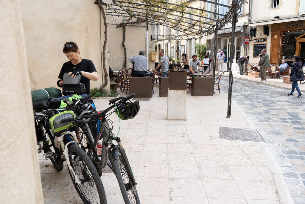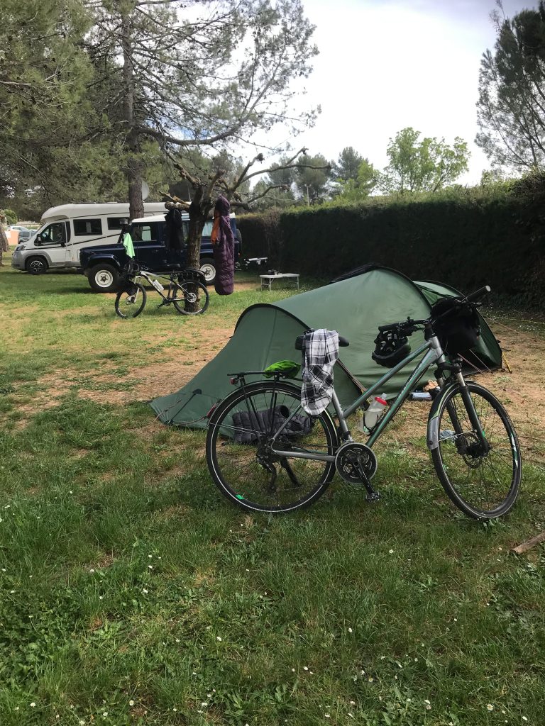 21.04.2023 Erste Etappe von Suze la Rousse über Carpentras, L’Isle-sur-la-Sorgue und Cavaillon nach Merindol. Unser Zelt haben wir am nahe gelegenen Campingplatz AIRE NATURELLE DES ARGILES aufgestellt. Es war schon spät und der Hunger groß und so sind wir gleich mit den Rädern ins Dorf zum Essen gefahren. Im „le Bigre“ haben wir gut gesessen und gegessen und natürlich Wein verkostet. Zurück zum Zelt ging es dann schon im Dunkeln.