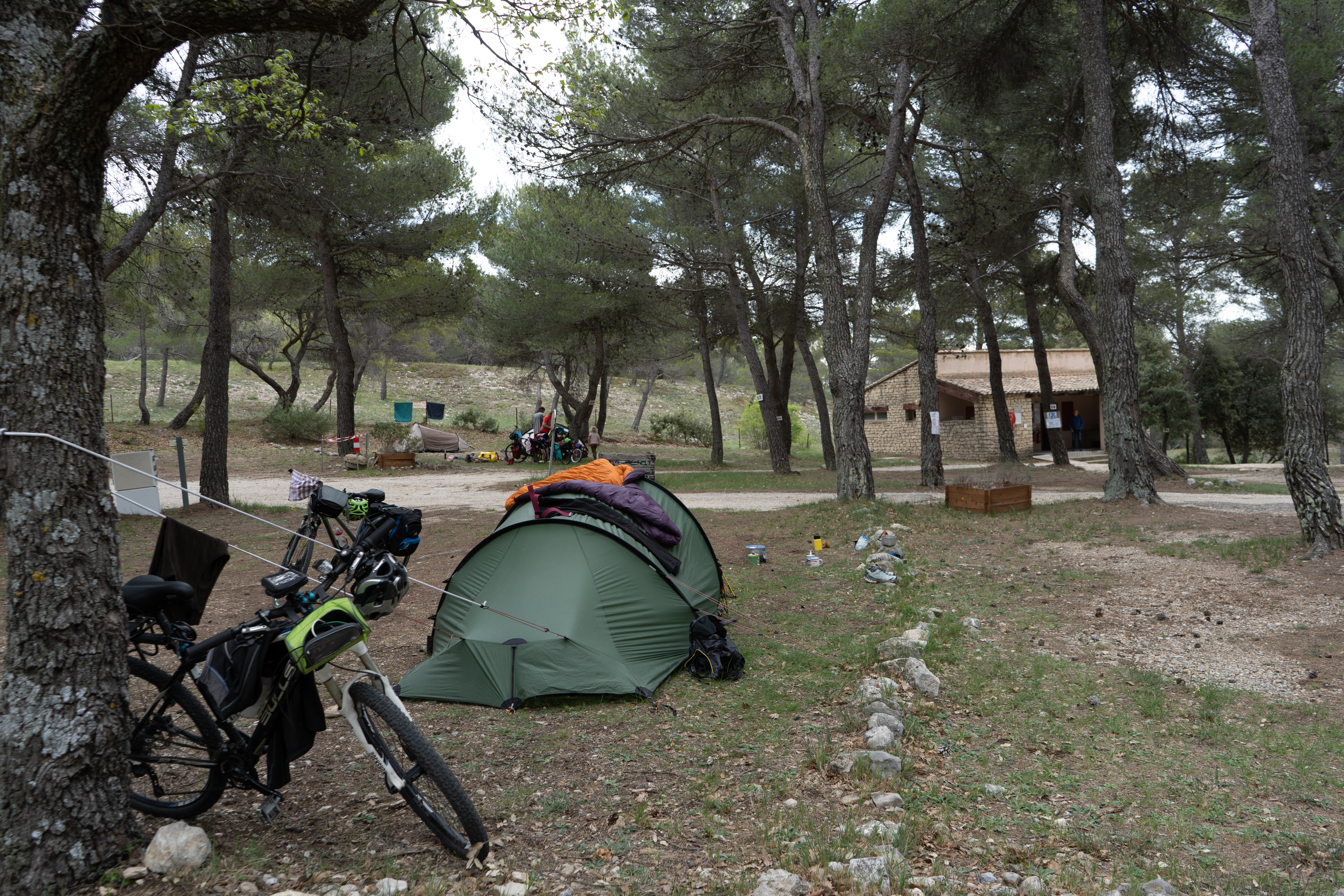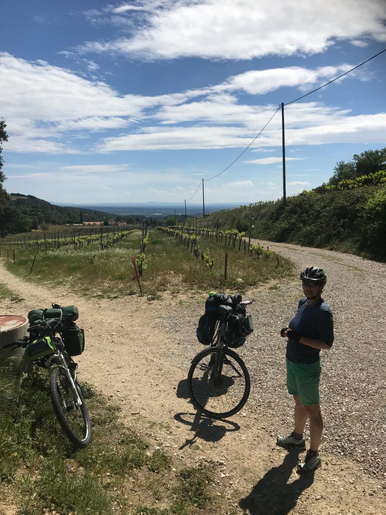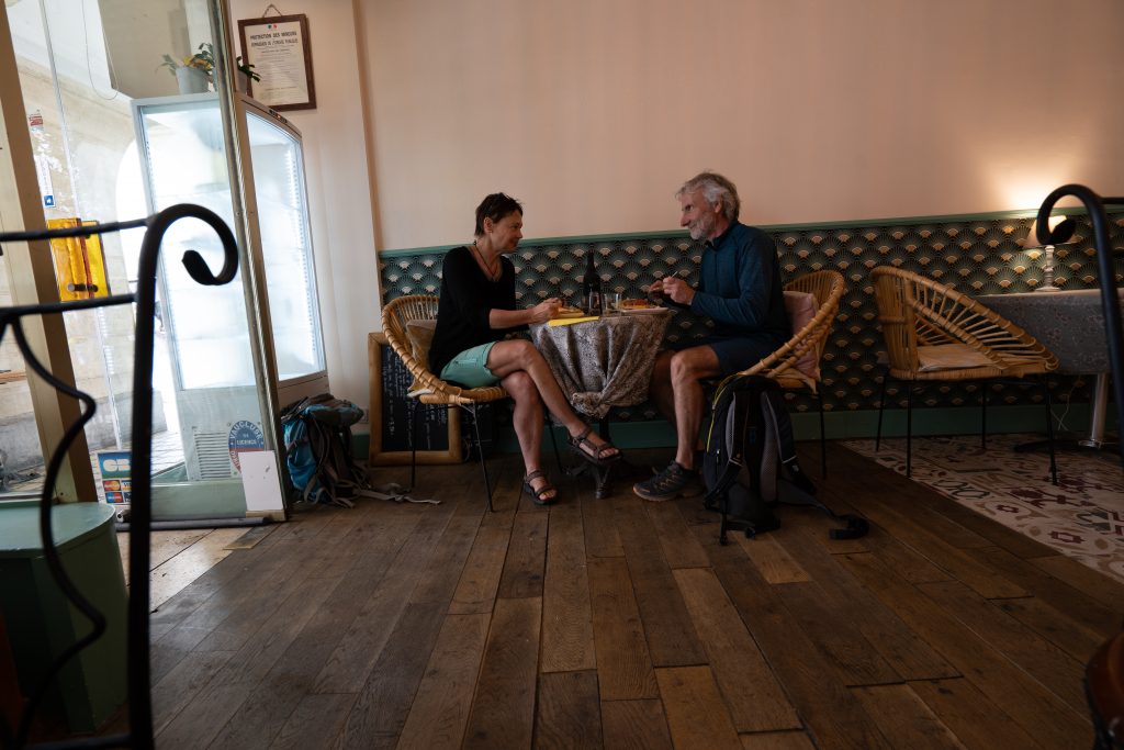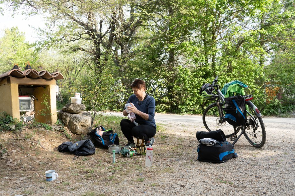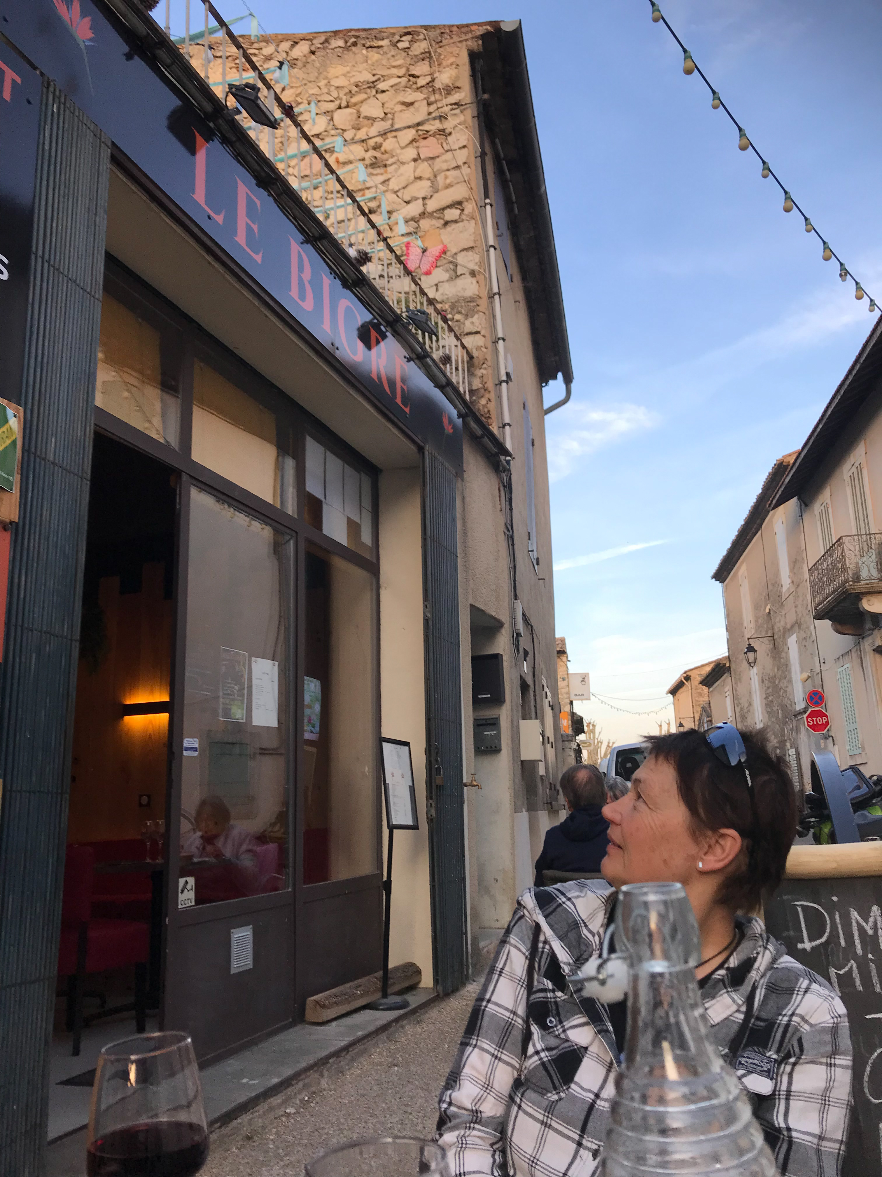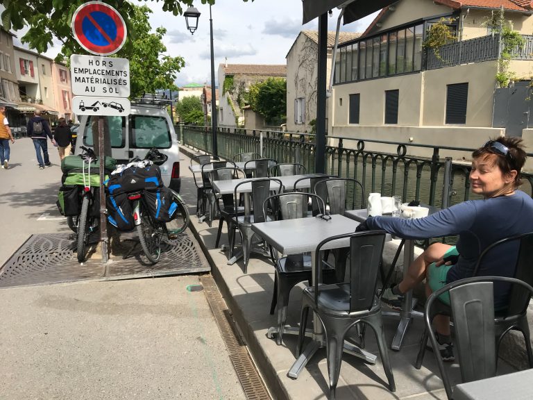 21.04.2023 Erste Etappe von Suze la Rousse über Carpentras, L’Isle-sur-la-Sorgue und Cavaillon nach Merindol. Unser Zelt haben wir am nahe gelegenen Campingplatz AIRE NATURELLE DES ARGILES aufgestellt. Es war schon spät und der Hunger groß und so sind wir gleich mit den Rädern ins Dorf zum Essen gefahren. Im „le Bigre“ haben wir gut gesessen und gegessen und natürlich Wein verkostet. Zurück zum Zelt ging es dann schon im Dunkeln.