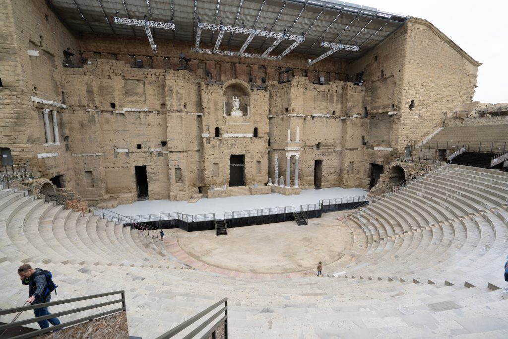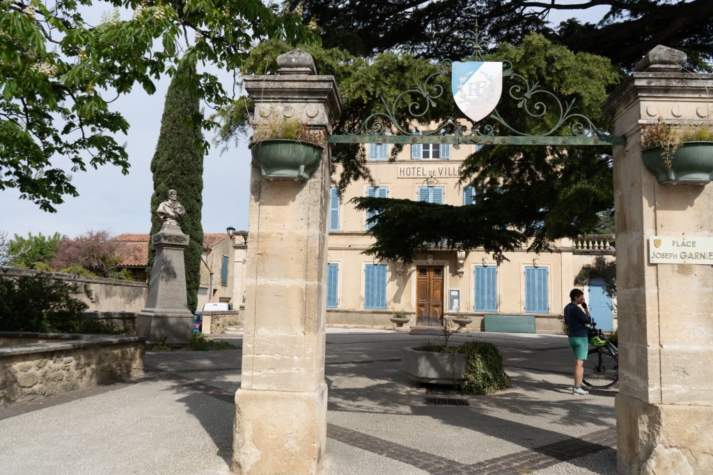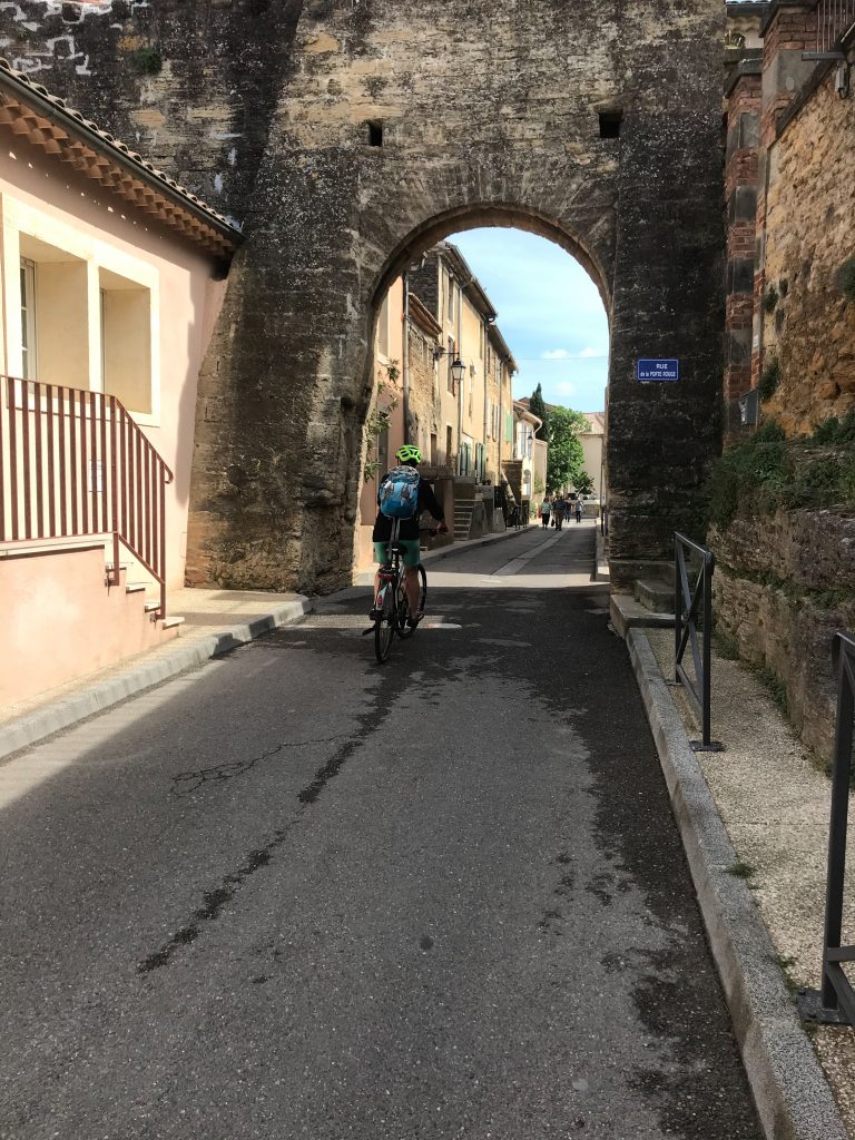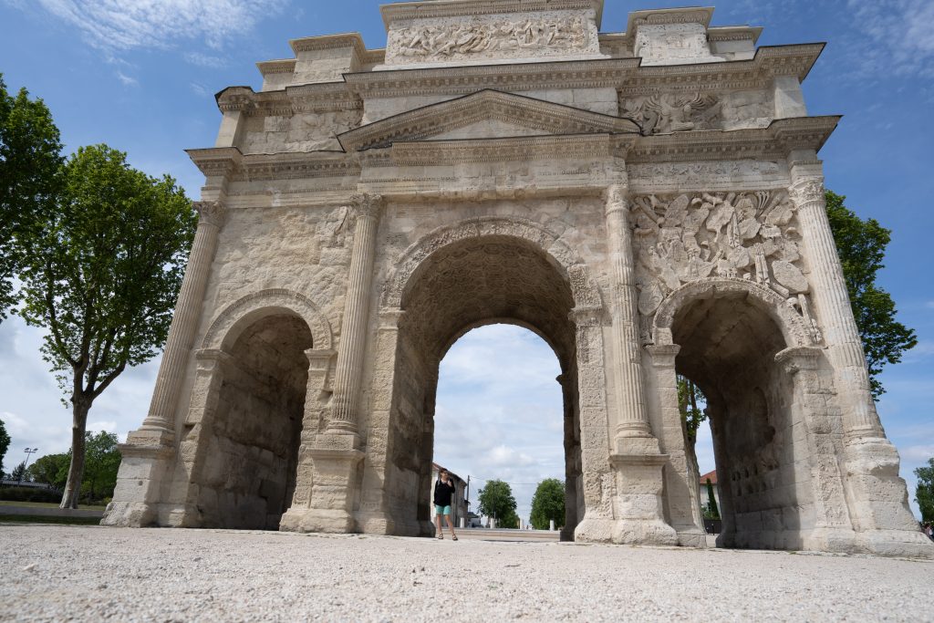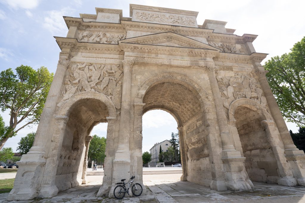 29.04.2023 Radtour nach Orange. Der Hinweg auf der Westseite der Rhone über Roquemaure, zurück auf der Ostseite über Châteauneuf-du-Pape. In Châteauneuf-du-Pape, dem Weinmekka an der Rhone, haben wir uns dann ein gutes Tröpfchen für unseren letzten Abend gekauft. Die Hauptattraktionen von Orange sind das antike Theater und der Arc de Triomphe.