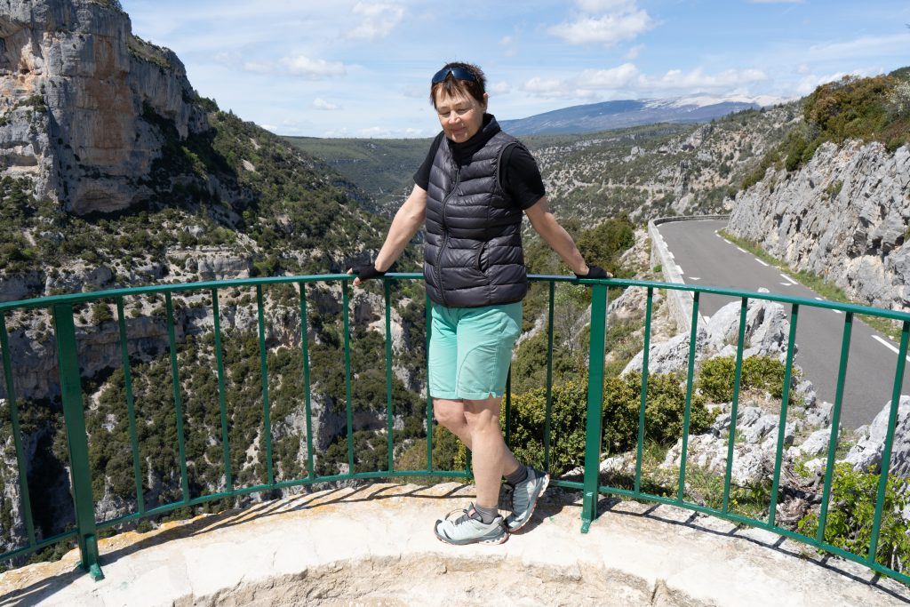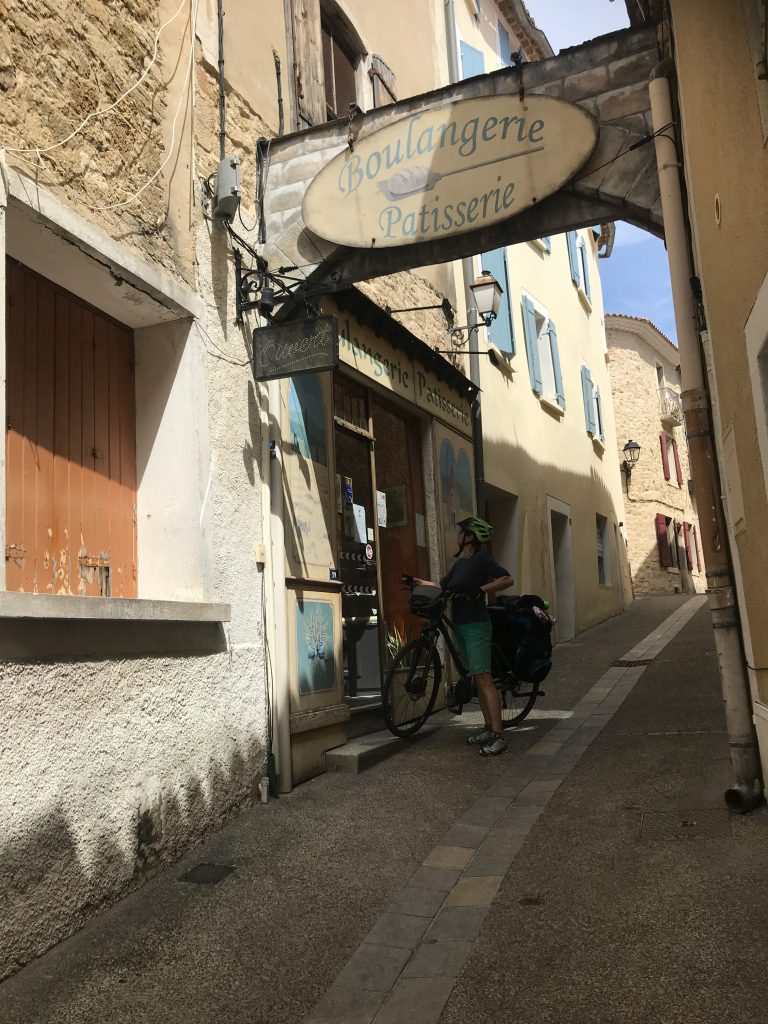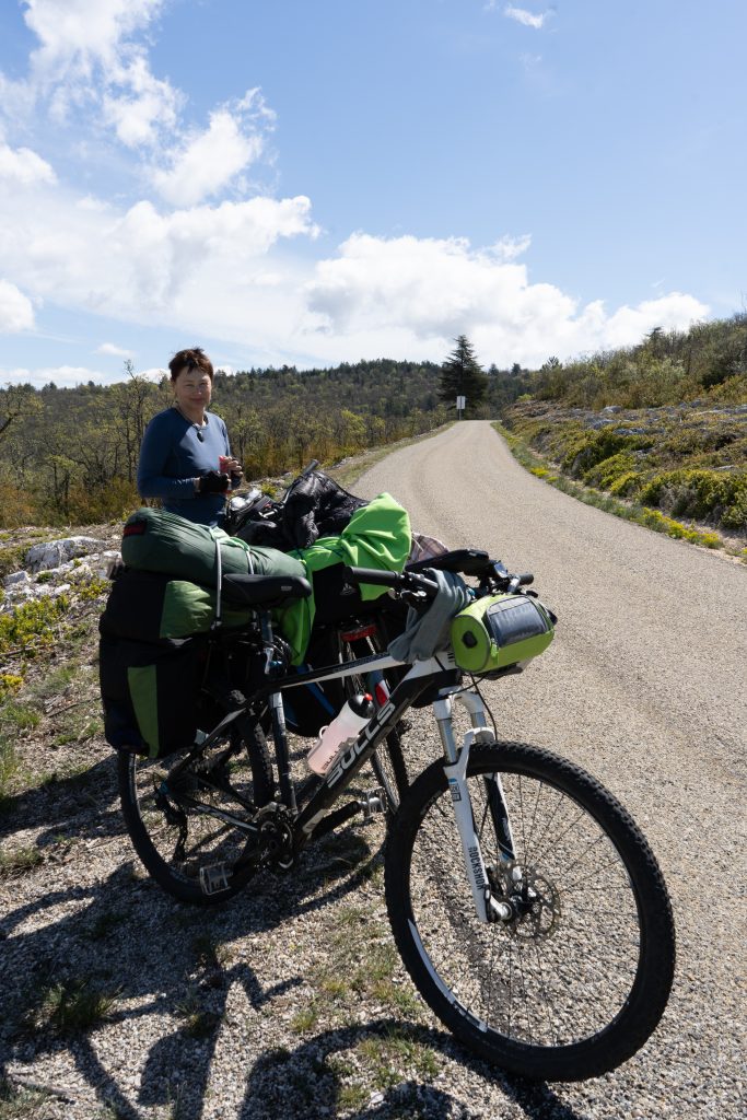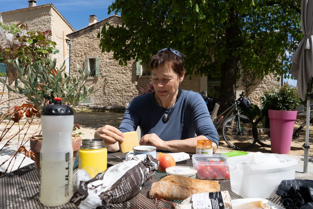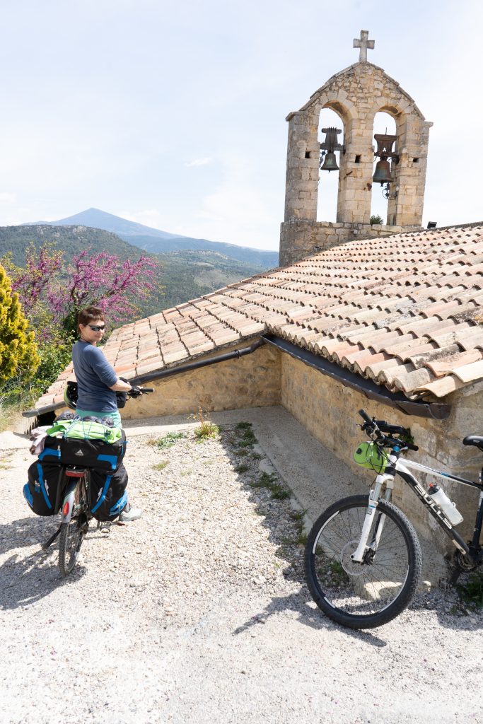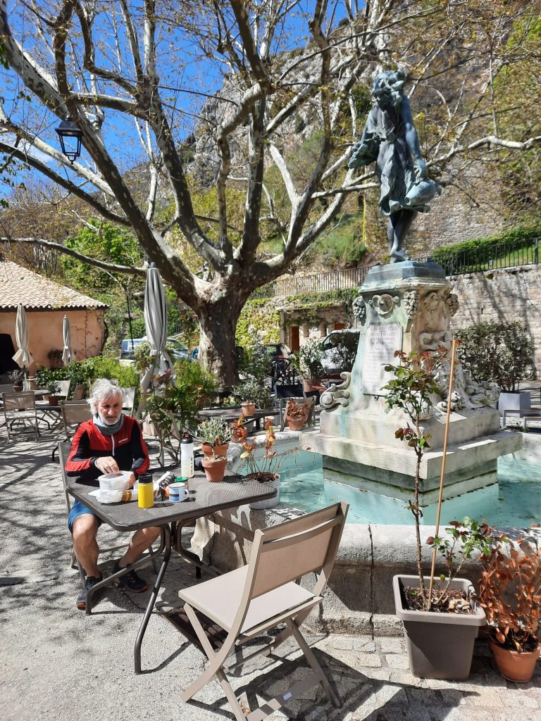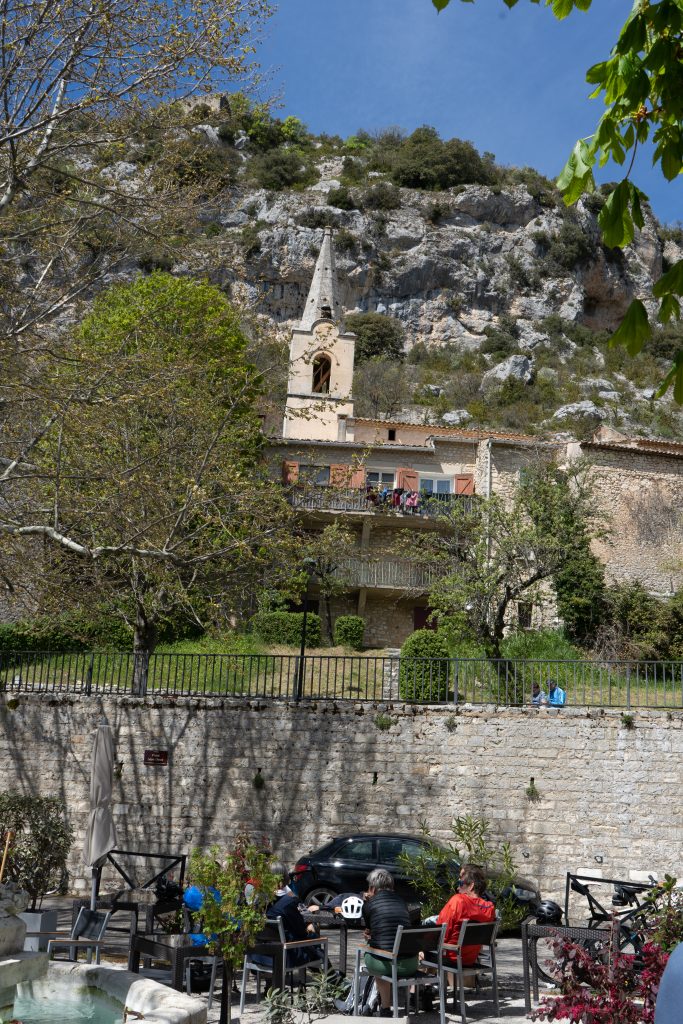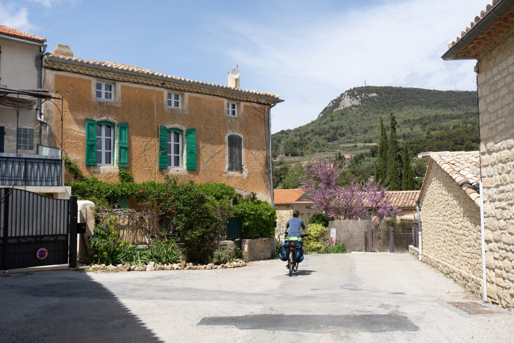 24.04.2023 vierte Etappe von Murs über Monieux, durch die Nesque- Schlucht nach Villes sur Auzon. Wahrscheinlich die schönste Etappe. Zunächst über den Col de la Ligne. Mittagspause im beschaulichen Örtchen Monieux. Es war Montag, das einzige Restaurant war geschlossen, so konnten wir uns auf deren Terrasse gemütlich machen. Später ging es dann fast nur noch abwärts durch die Schlucht. Den Mont Ventoux hatten wir oft im Blick. Wieder haben wir uns auf den Municipal Campingplatz niedergelassen.