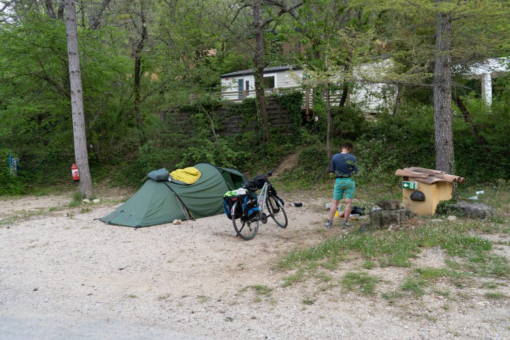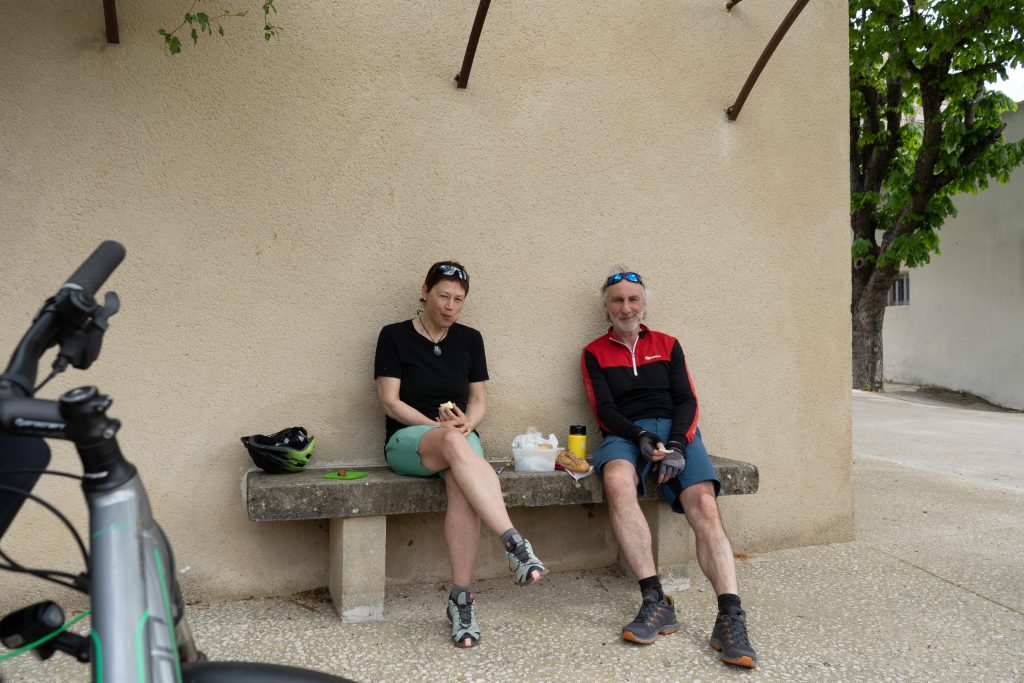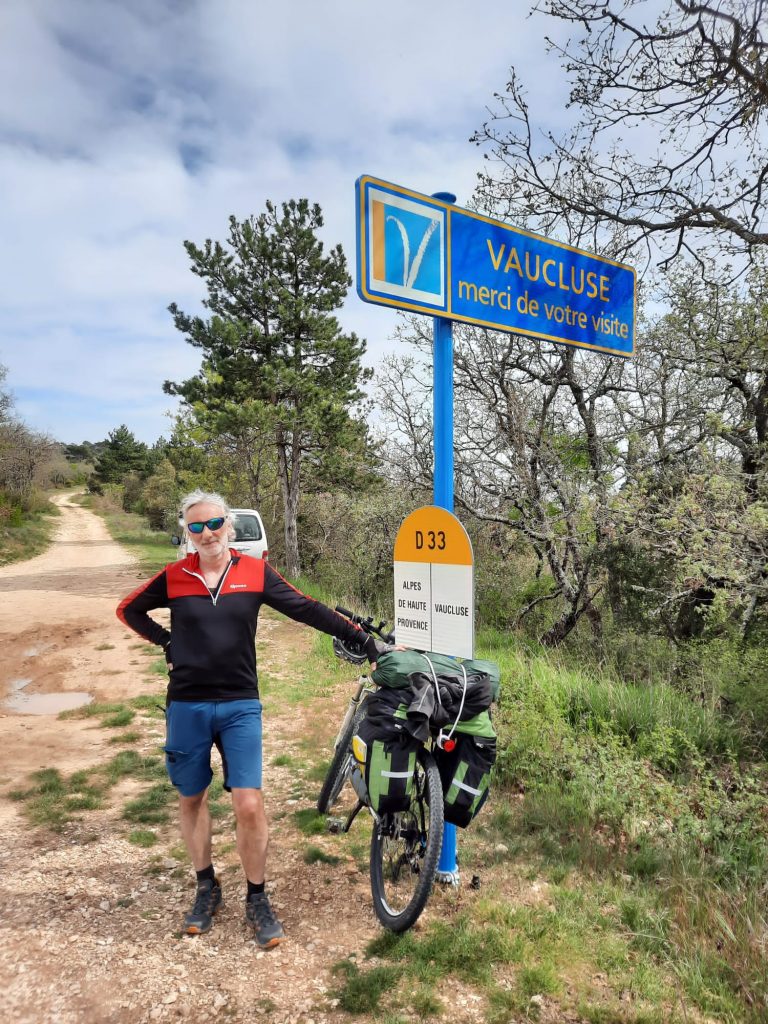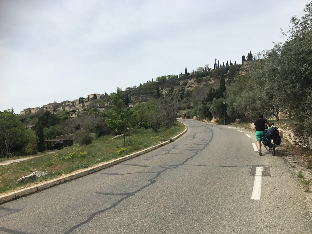 22.04.2023 zweite Etappe von Merindol über Lourmarin, Saint-Martin-de-la-Brasque, Vitrolles-en-Luberon und Cereste nach Apt. Heut waren wir besonders kaputt. Anstrengende Bergetappe. Im Supermarkt in Apt noch Bier und Baguette gekauft und dann den letzten Anstieg zum Campingplatz „Le Luberon“ gemeistert.