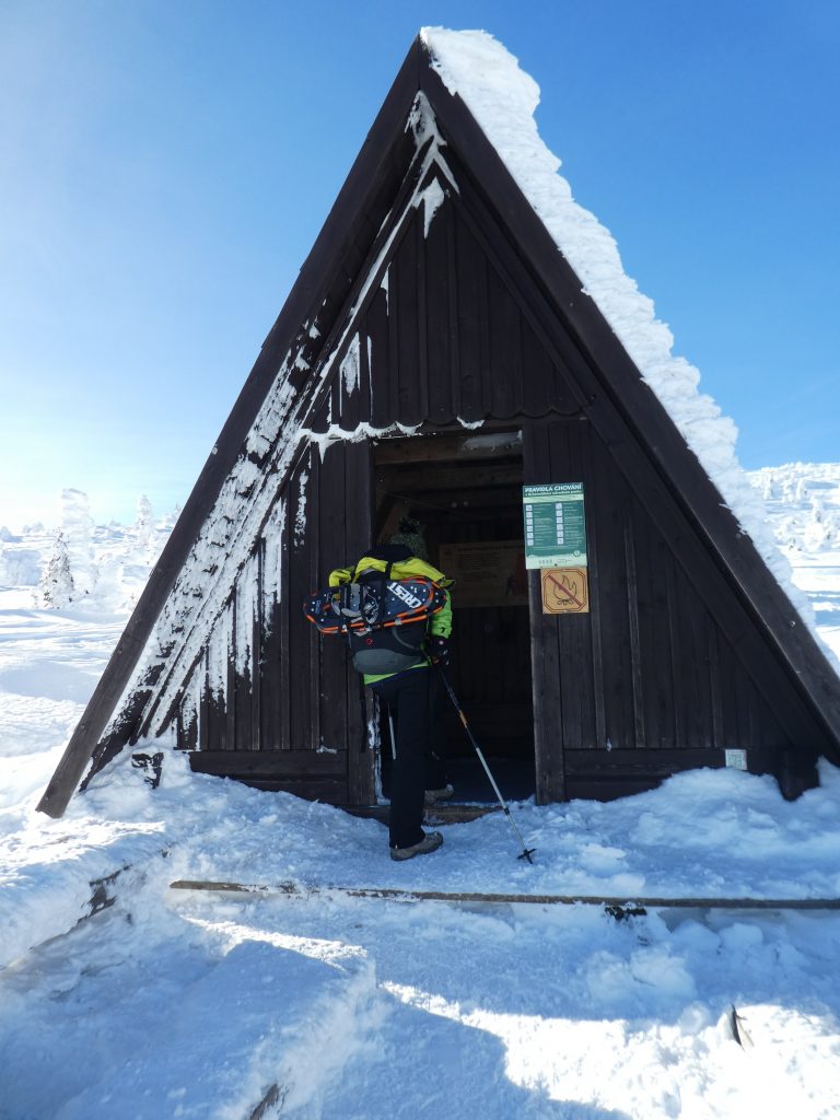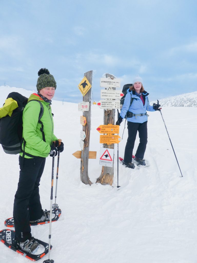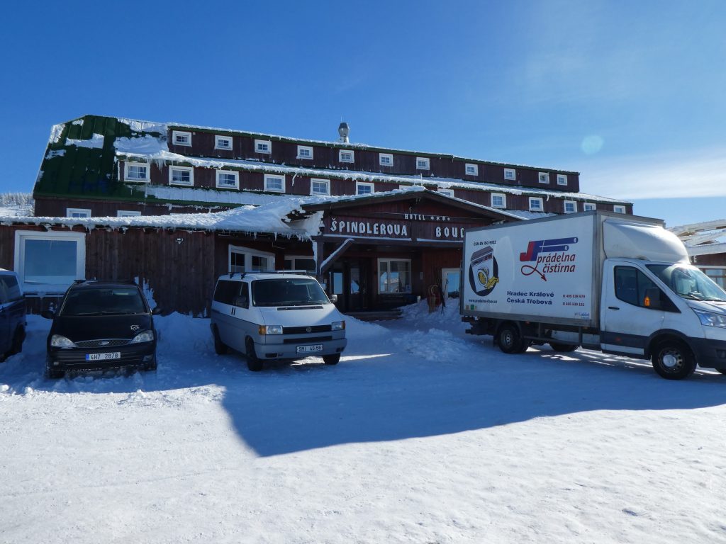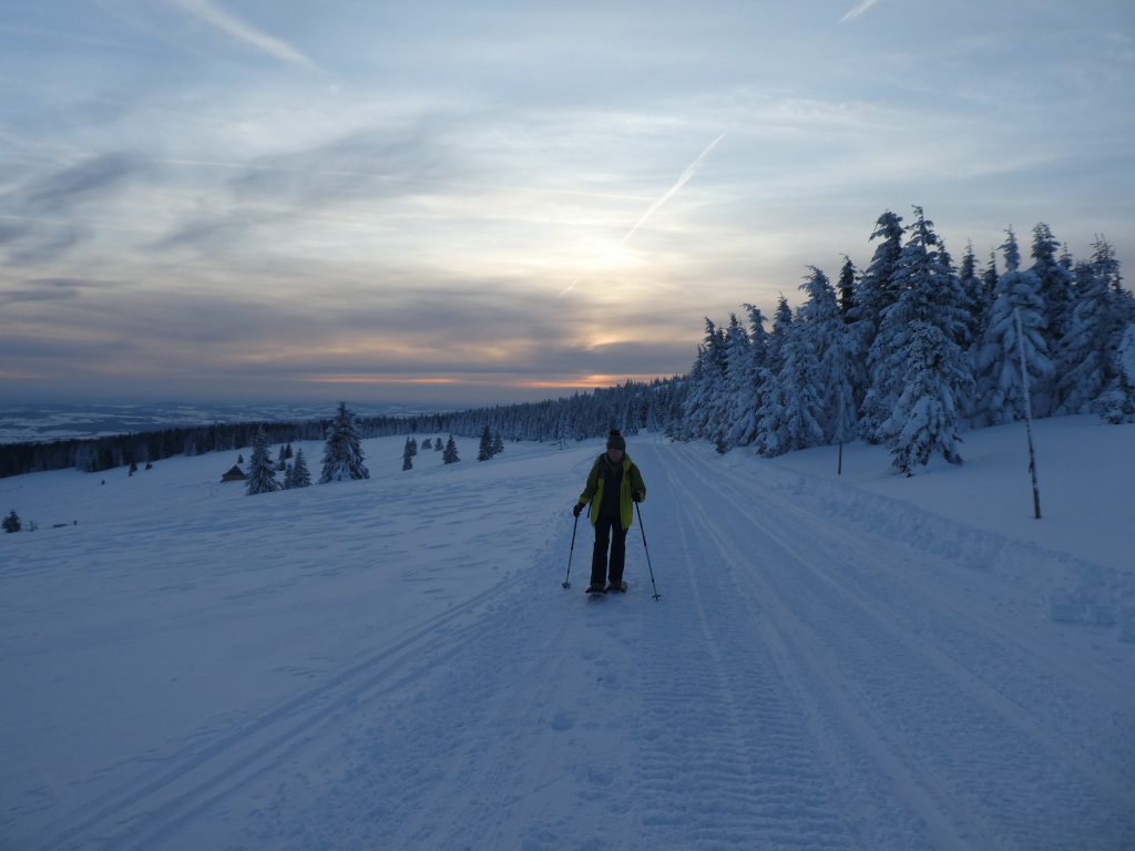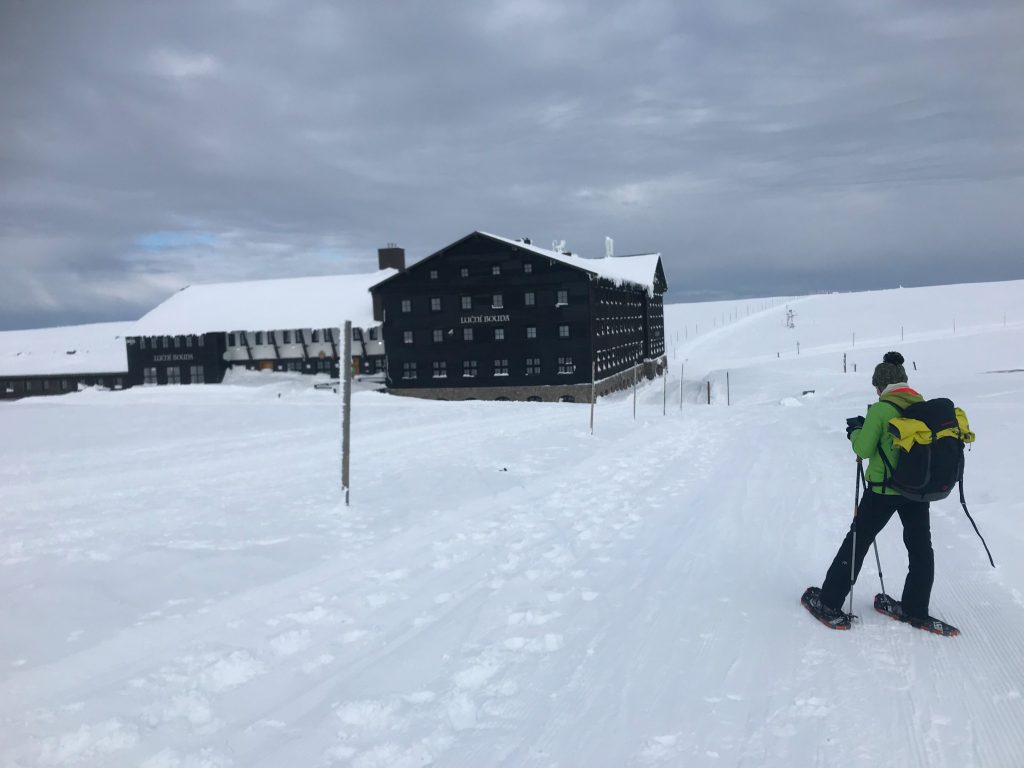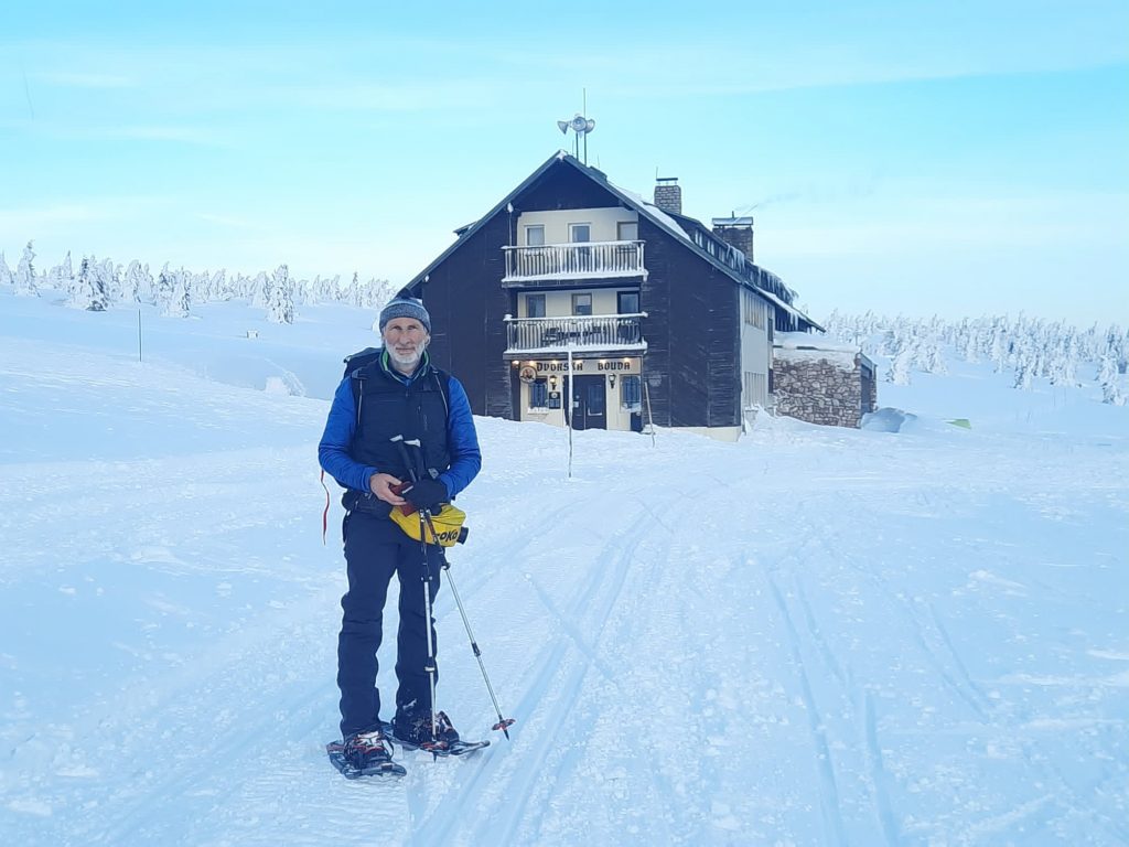 4- tägige Schneeschuhwanderung von Spindlermühle zur Dvorska-Baude, zur Teichbaude, zur Martinsbaude und zurück nach Spindlermühle. Start am Sonntag, den 5.2.2023. Nach langen suchen und warten hatten wir dann auch einen Parkplatz gefunden, am Hromovka-Lift, und der war auch noch kostenlos. Nach einer kleinen Stärkung, Rucksackpacken und Umziehen, gehen wir gegen 13:00 los, über Wanderwege und Skipiste zunächst hoch zur Planur, die Gipfelstation. Weiter auf engeren und einsameren Wegen zur Keilbaude, wo wir auf eine der Hauptloipen stoßen. Diese verlassen wir aber gleich wieder, und über einen kleinen Hügel erreichen wir ca 17:00Uhr die Dvorska-Baude. Steffi hatte sich etwas später entschlossen uns anzuschließen, hatte keinen Platz mehr bekommen auf der Dvorska , sie hat auf der Mala Rennerovka Baude genächtigt, nur wenige hundert Meter entfernt. Insgesamt hatten wir an diesen Nachmittag über 600 Höhenmeter zu überwinden.