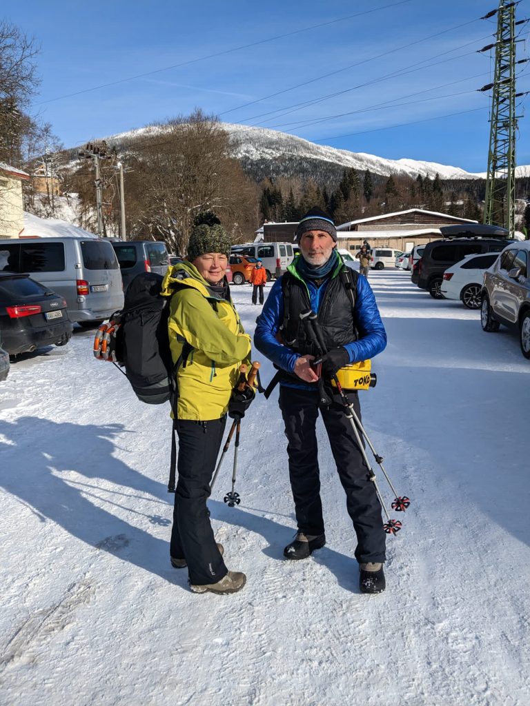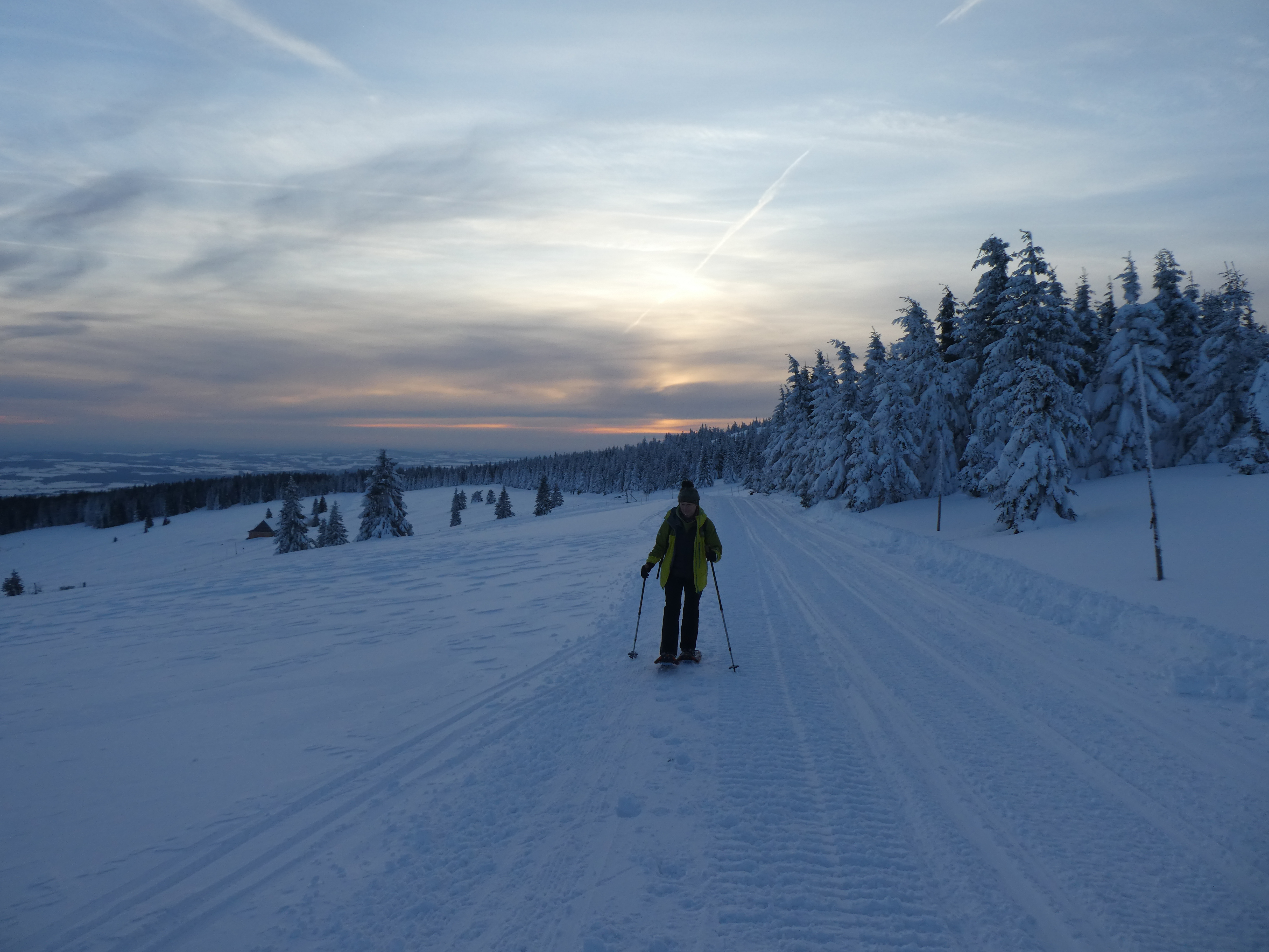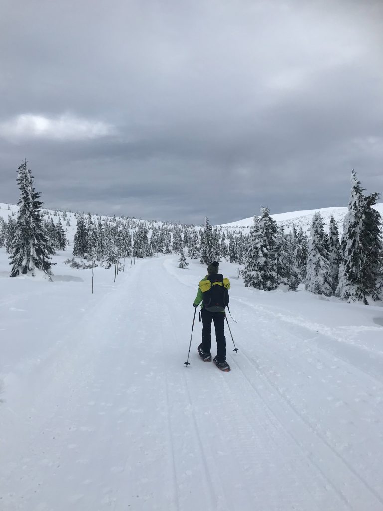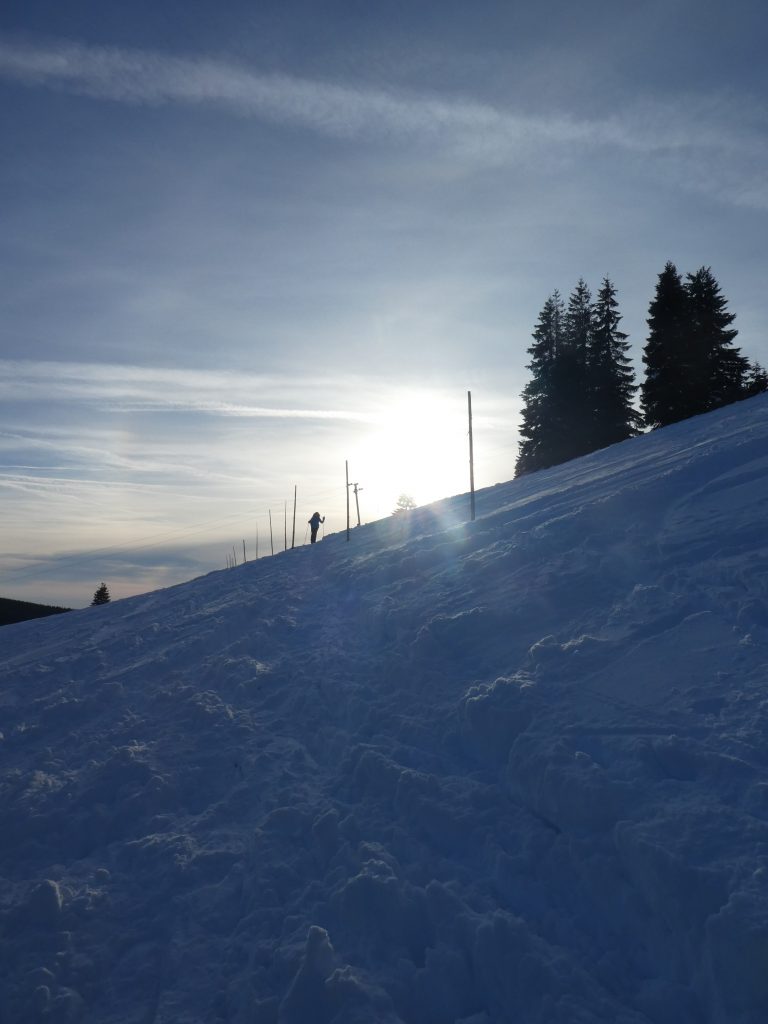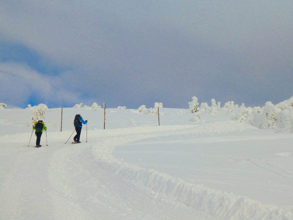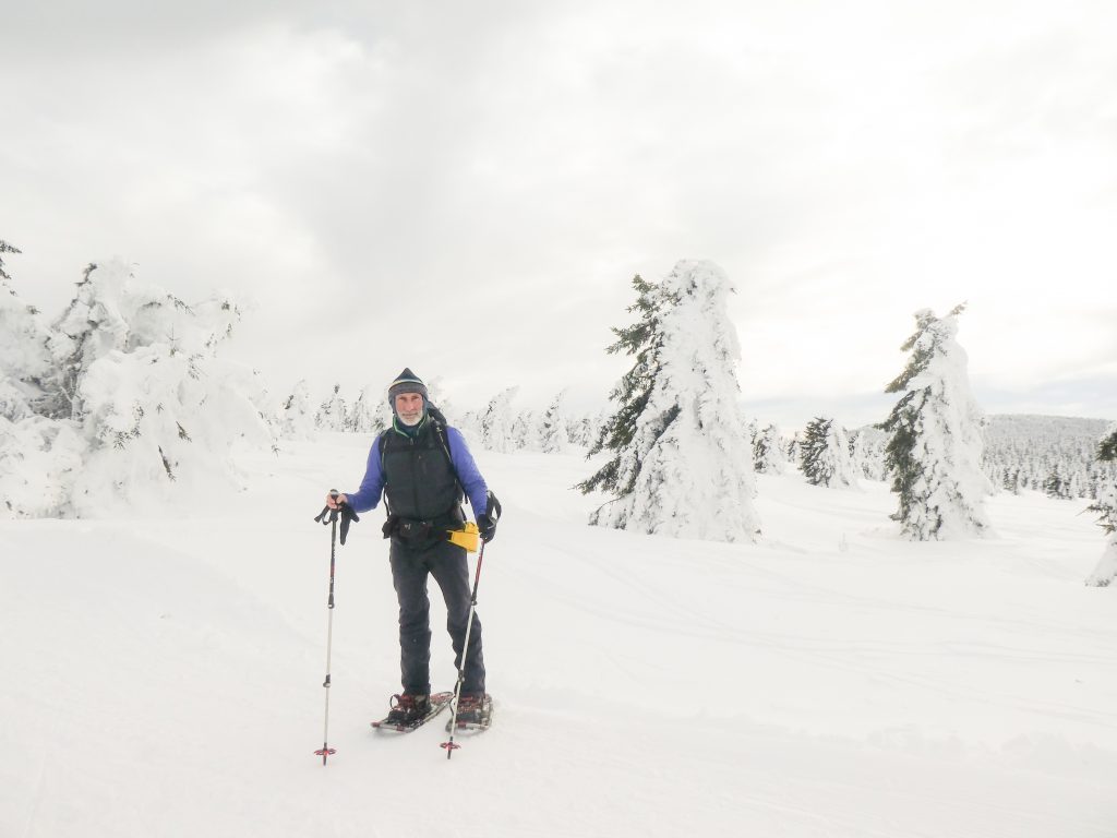4- tägige Schneeschuhwanderung von Spindlermühle zur Dvorska-Baude, zur Teichbaude, zur Martinsbaude und zurück nach Spindlermühle. Start am Sonntag, den 5.2.2023. Nach langen suchen und warten hatten wir dann auch einen Parkplatz gefunden, am Hromovka-Lift, und der war auch noch kostenlos. Nach einer kleinen Stärkung, Rucksackpacken und Umziehen, gehen wir gegen 13:00 los, über Wanderwege und Skipiste zunächst hoch zur Planur, die Gipfelstation. Weiter auf engeren und einsameren Wegen zur Keilbaude, wo wir auf eine der Hauptloipen stoßen. Diese verlassen wir aber gleich wieder, und über einen kleinen Hügel erreichen wir ca 17:00Uhr die Dvorska-Baude. Steffi hatte sich etwas später entschlossen uns anzuschließen, hatte keinen Platz mehr bekommen auf der Dvorska , sie hat auf der Mala Rennerovka Baude genächtigt, nur wenige hundert Meter entfernt. Insgesamt hatten wir an diesen Nachmittag über 600 Höhenmeter zu überwinden.