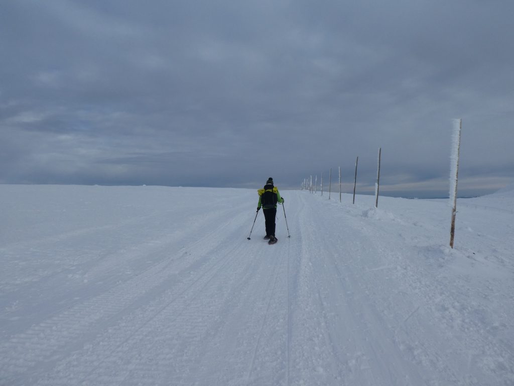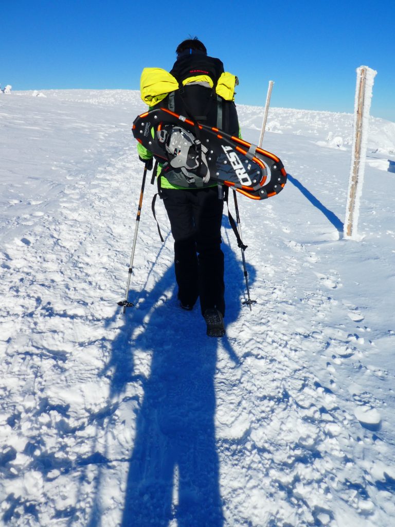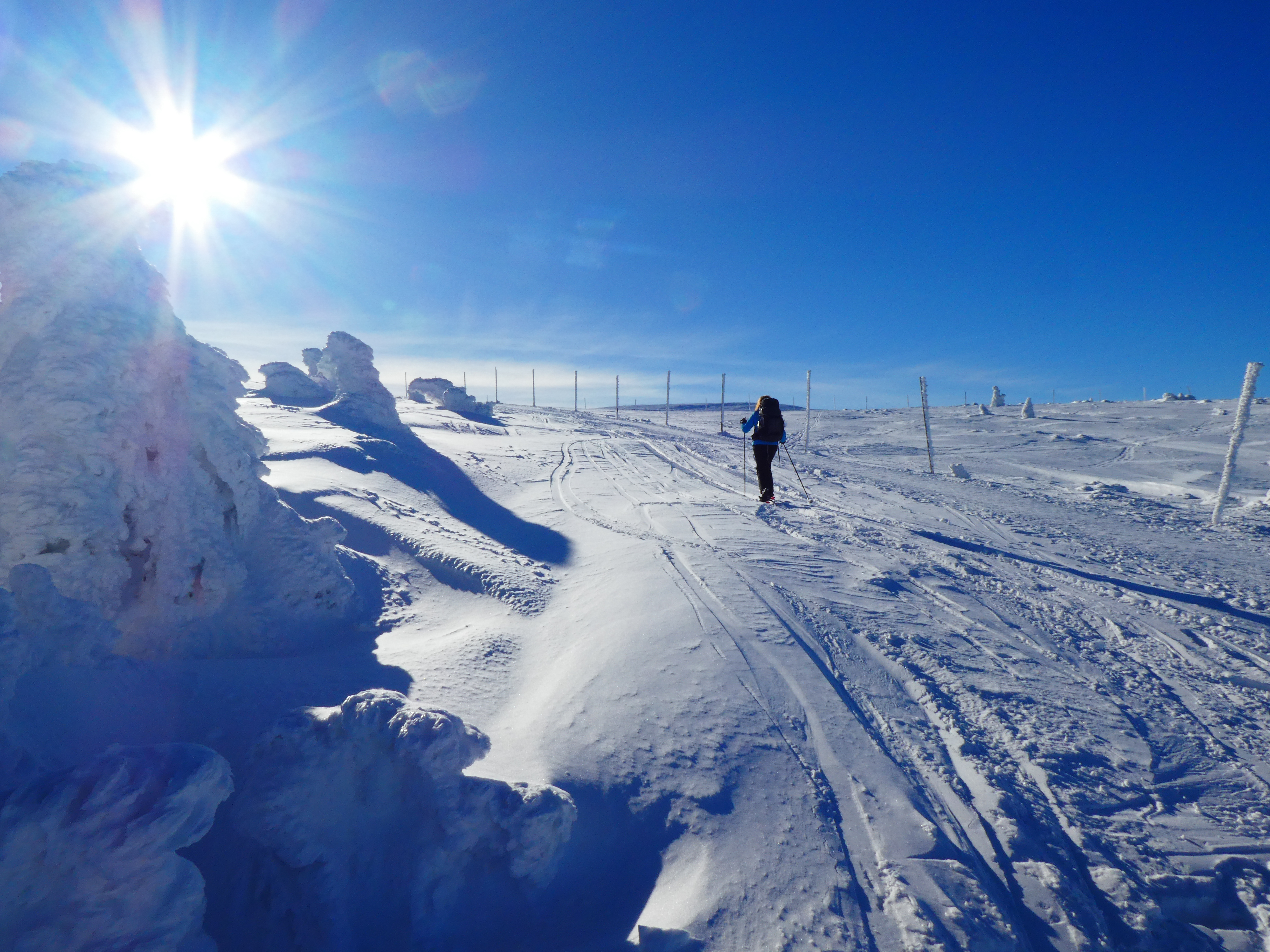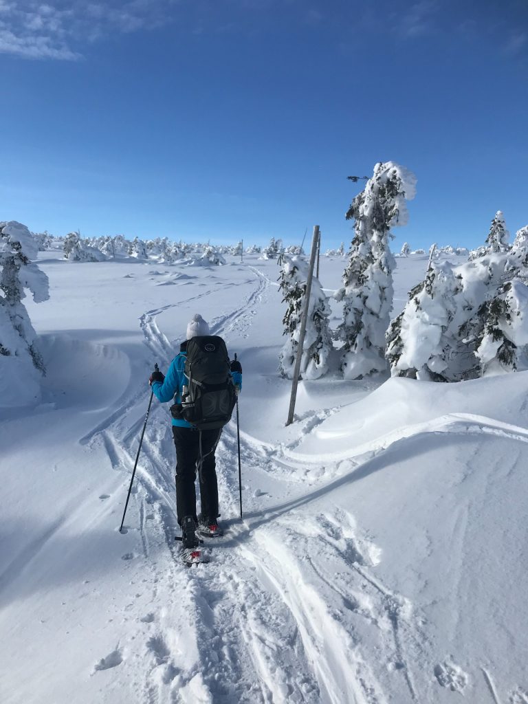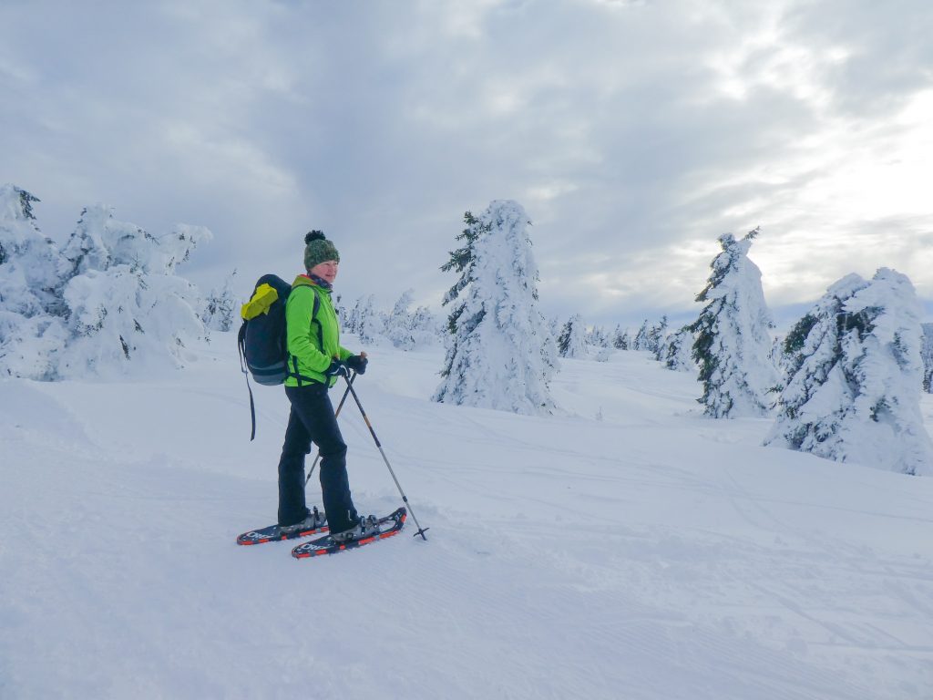 4- tägige Schneeschuhwanderung von Spindlermühle zur Dvorska-Baude, zur Teichbaude, zur Martinsbaude und zurück nach Spindlermühle. Start am Sonntag, den 5.2.2023. Nach langen suchen und warten hatten wir dann auch einen Parkplatz gefunden, am Hromovka-Lift, und der war auch noch kostenlos. Nach einer kleinen Stärkung, Rucksackpacken und Umziehen, gehen wir gegen 13:00 los, über Wanderwege und Skipiste zunächst hoch zur Planur, die Gipfelstation. Weiter auf engeren und einsameren Wegen zur Keilbaude, wo wir auf eine der Hauptloipen stoßen. Diese verlassen wir aber gleich wieder, und über einen kleinen Hügel erreichen wir ca 17:00Uhr die Dvorska-Baude. Steffi hatte sich etwas später entschlossen uns anzuschließen, hatte keinen Platz mehr bekommen auf der Dvorska , sie hat auf der Mala Rennerovka Baude genächtigt, nur wenige hundert Meter entfernt. Insgesamt hatten wir an diesen Nachmittag über 600 Höhenmeter zu überwinden.