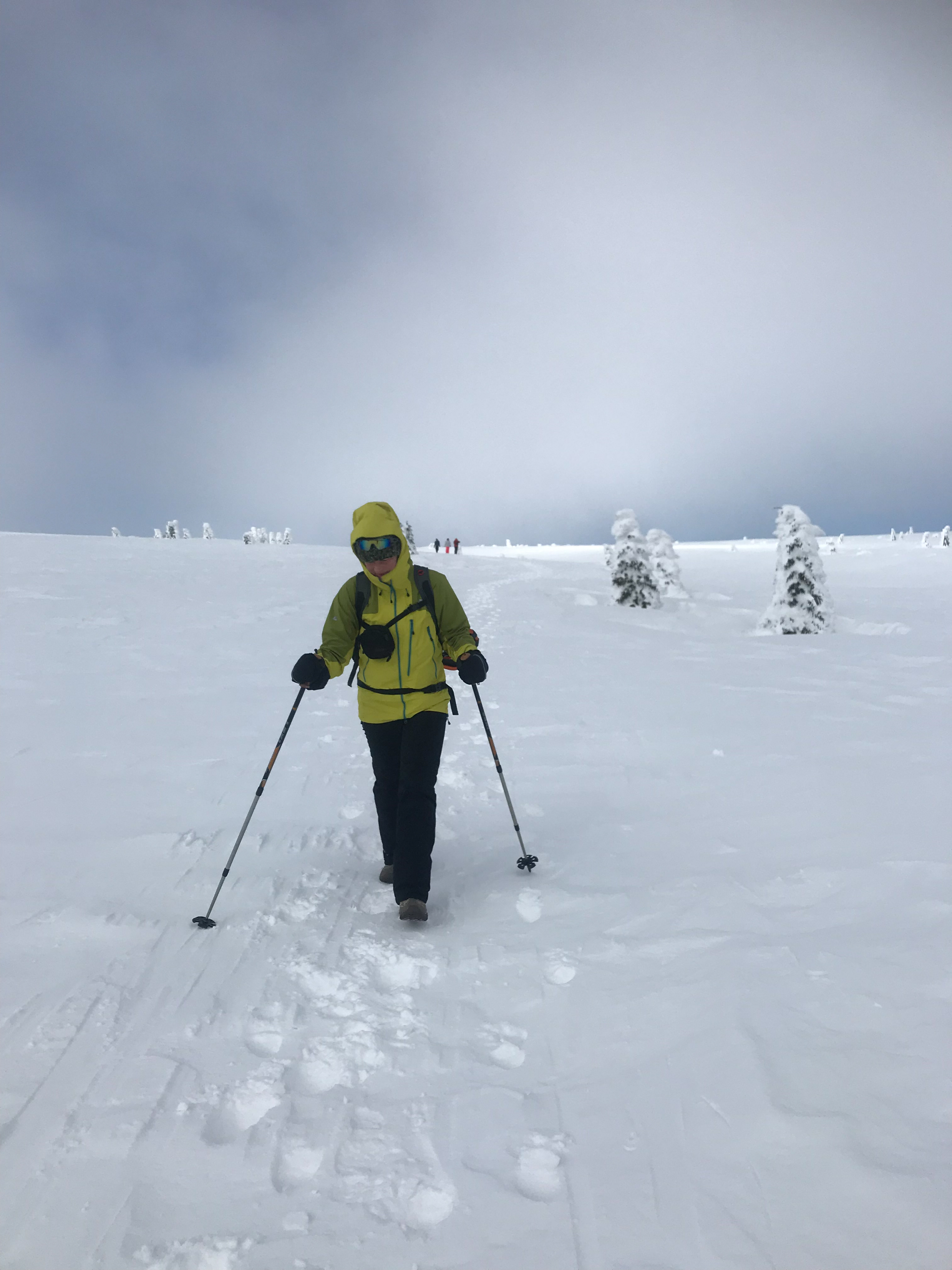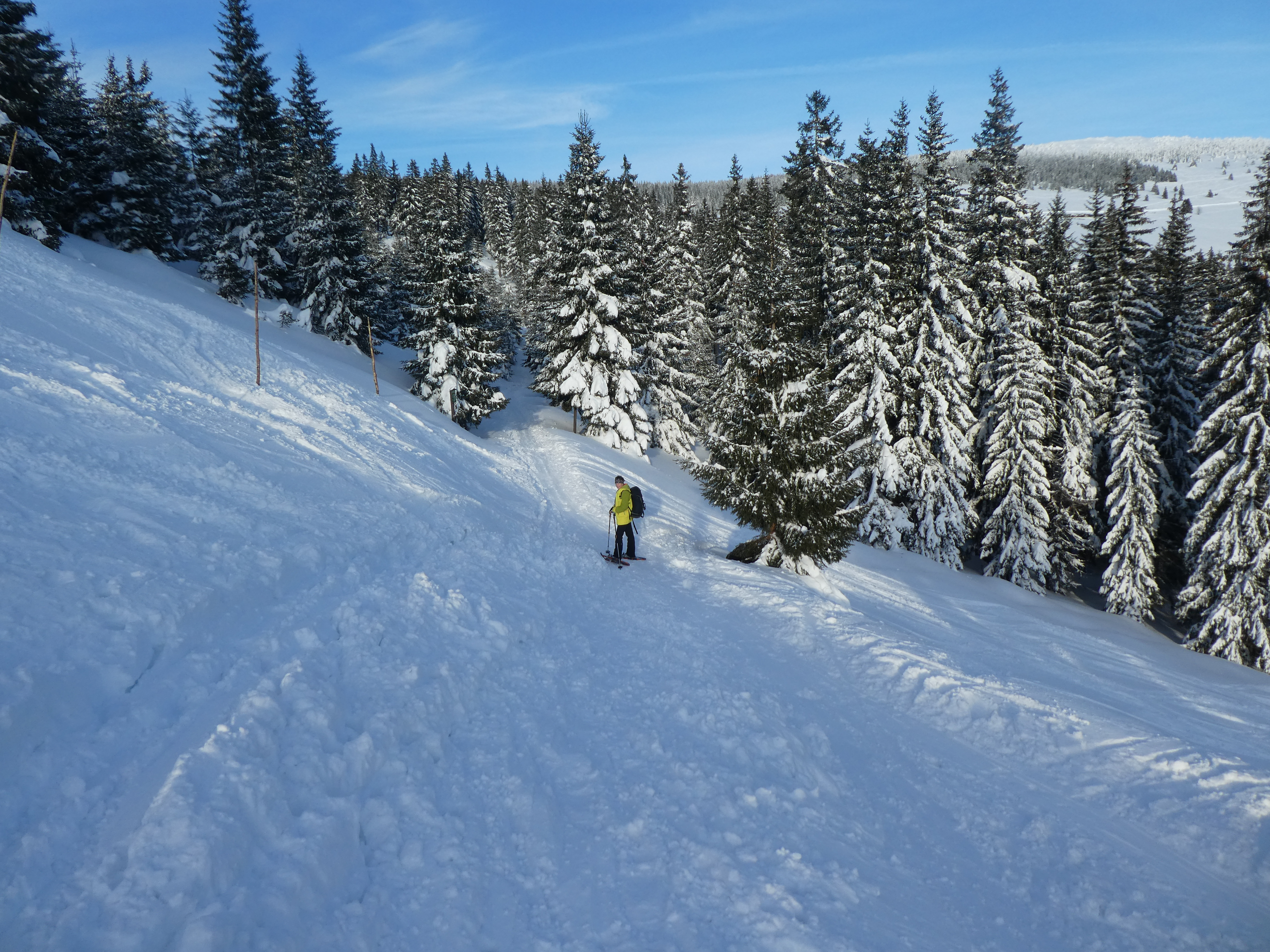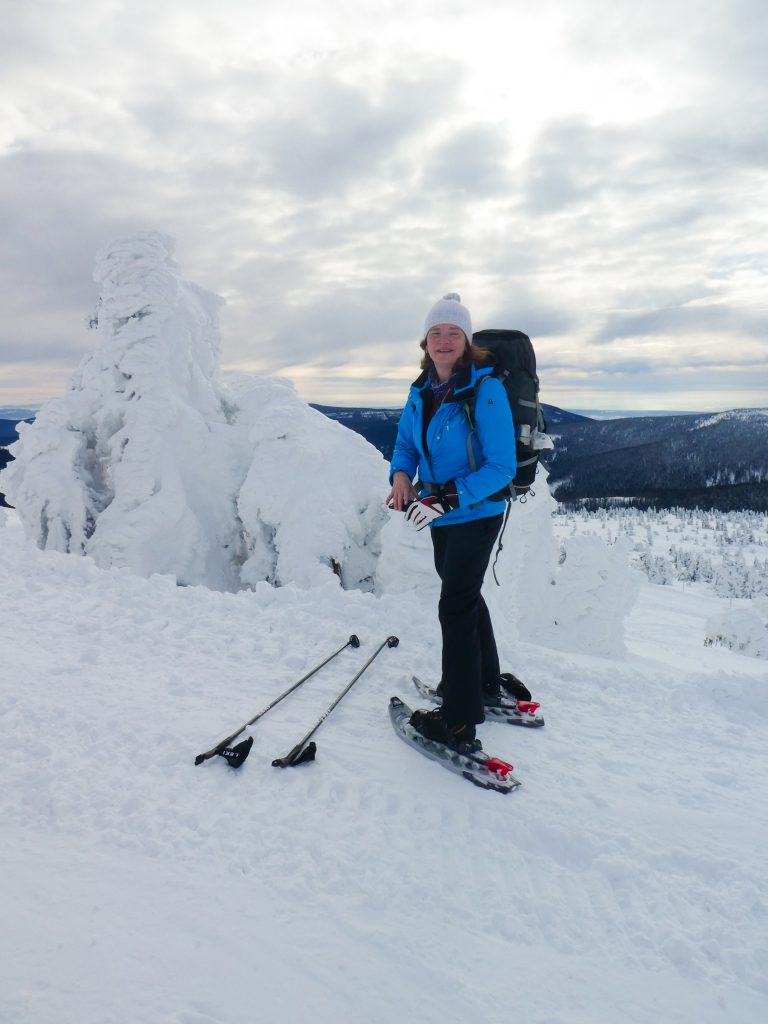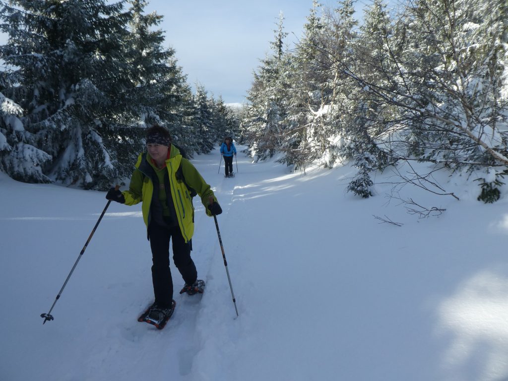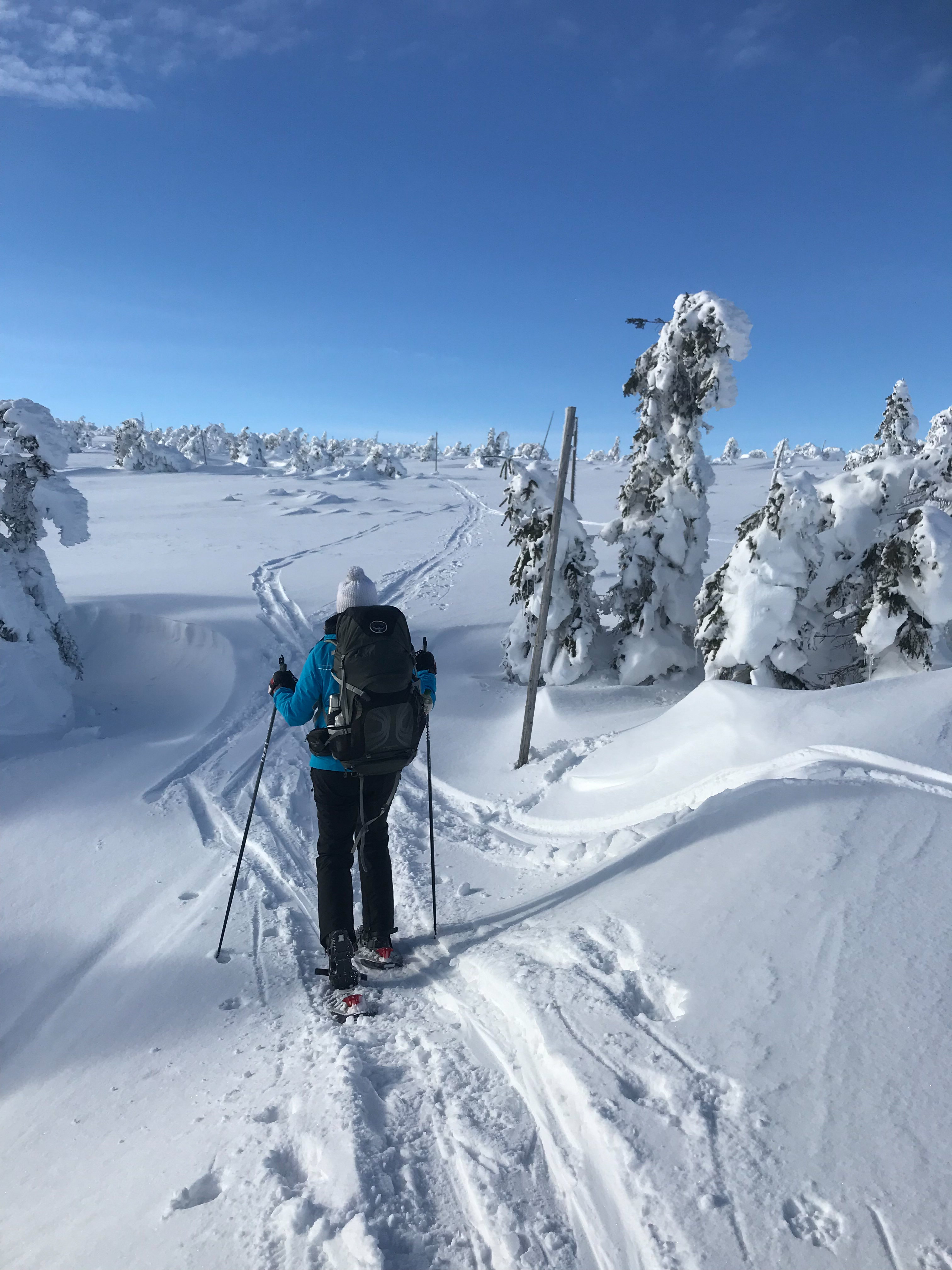4- tägige Schneeschuhwanderung von Spindlermühle zur Dvorska-Baude, zur Teichbaude, zur Martinsbaude und zurück nach Spindlermühle. Start am Sonntag, den 5.2.2023. Nach langen suchen und warten hatten wir dann auch einen Parkplatz gefunden, am Hromovka-Lift, und der war auch noch kostenlos. Nach einer kleinen Stärkung, Rucksackpacken und Umziehen, gehen wir gegen 13:00 los, über Wanderwege und Skipiste zunächst hoch zur Planur, die Gipfelstation. Weiter auf engeren und einsameren Wegen zur Keilbaude, wo wir auf eine der Hauptloipen stoßen. Diese verlassen wir aber gleich wieder, und über einen kleinen Hügel erreichen wir ca 17:00Uhr die Dvorska-Baude. Steffi hatte sich etwas später entschlossen uns anzuschließen, hatte keinen Platz mehr bekommen auf der Dvorska , sie hat auf der Mala Rennerovka Baude genächtigt, nur wenige hundert Meter entfernt. Insgesamt hatten wir an diesen Nachmittag über 600 Höhenmeter zu überwinden.