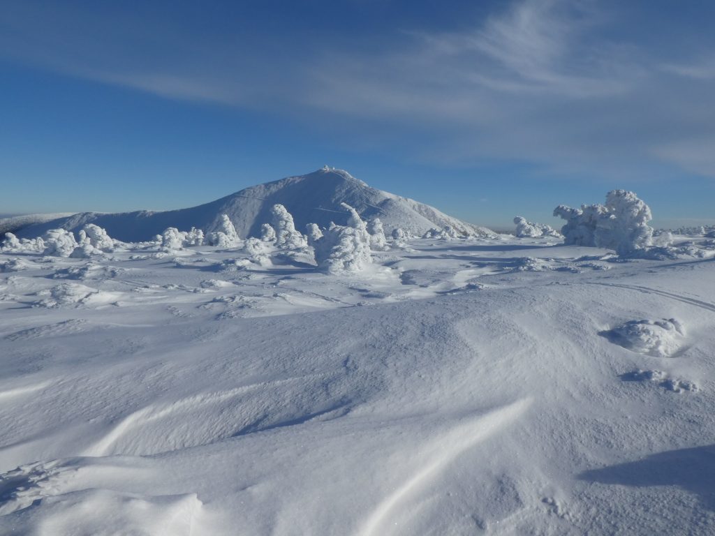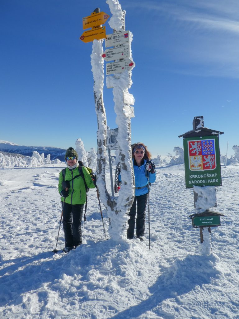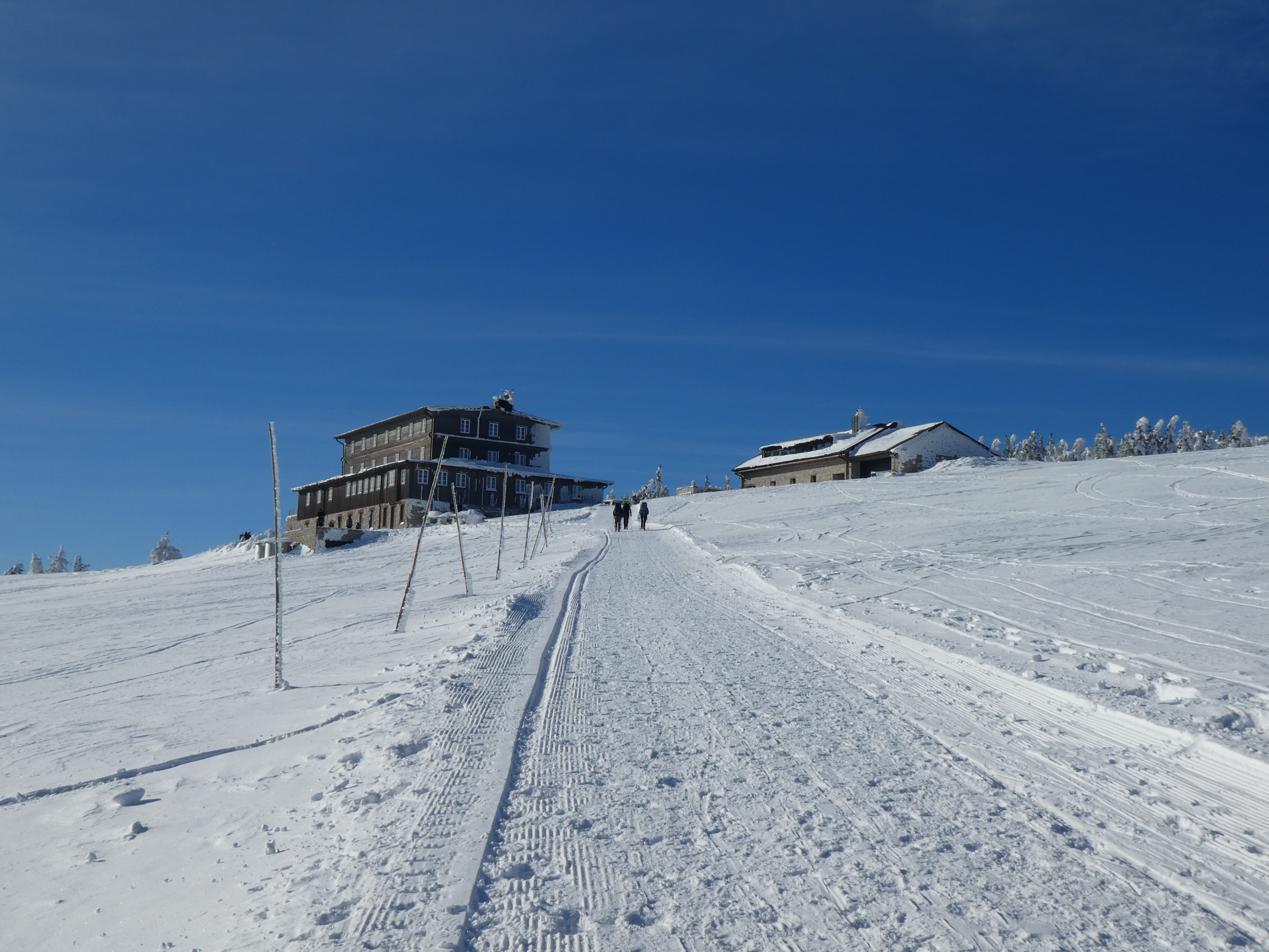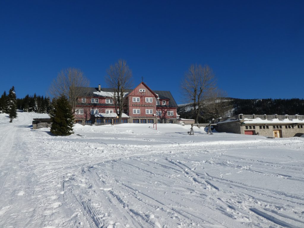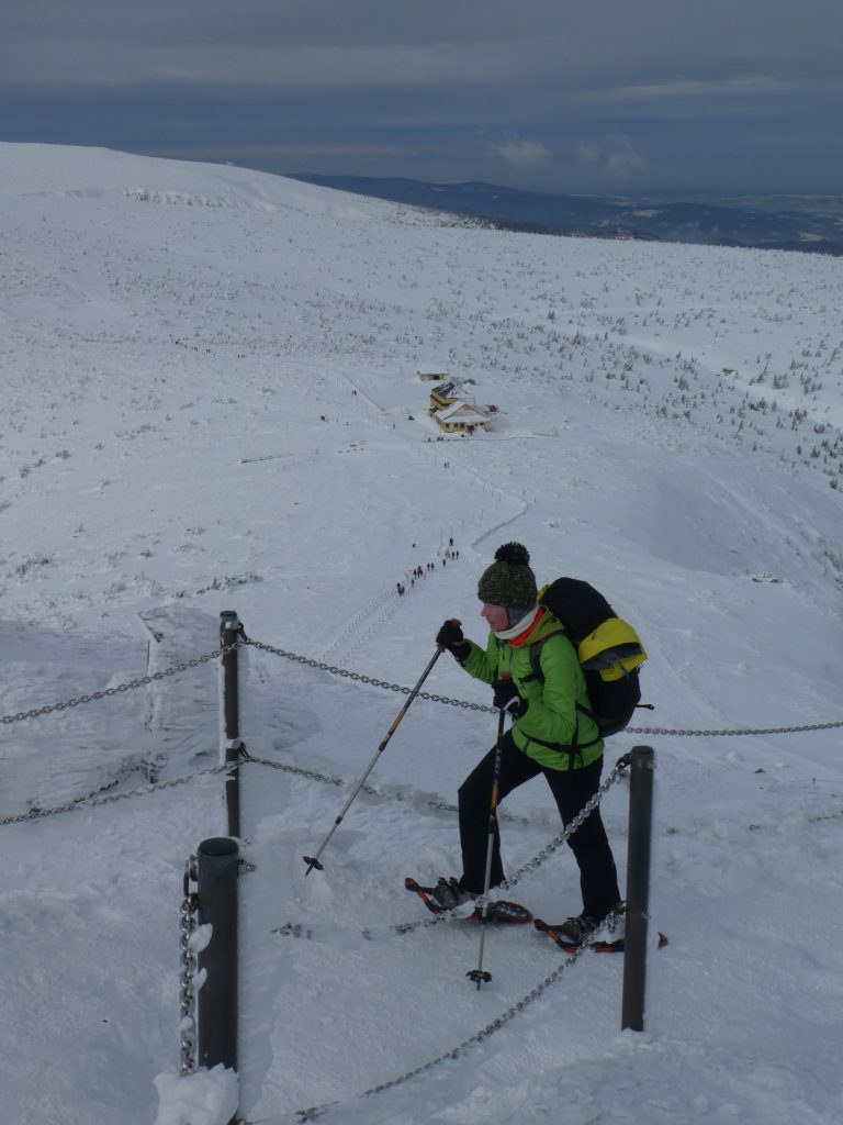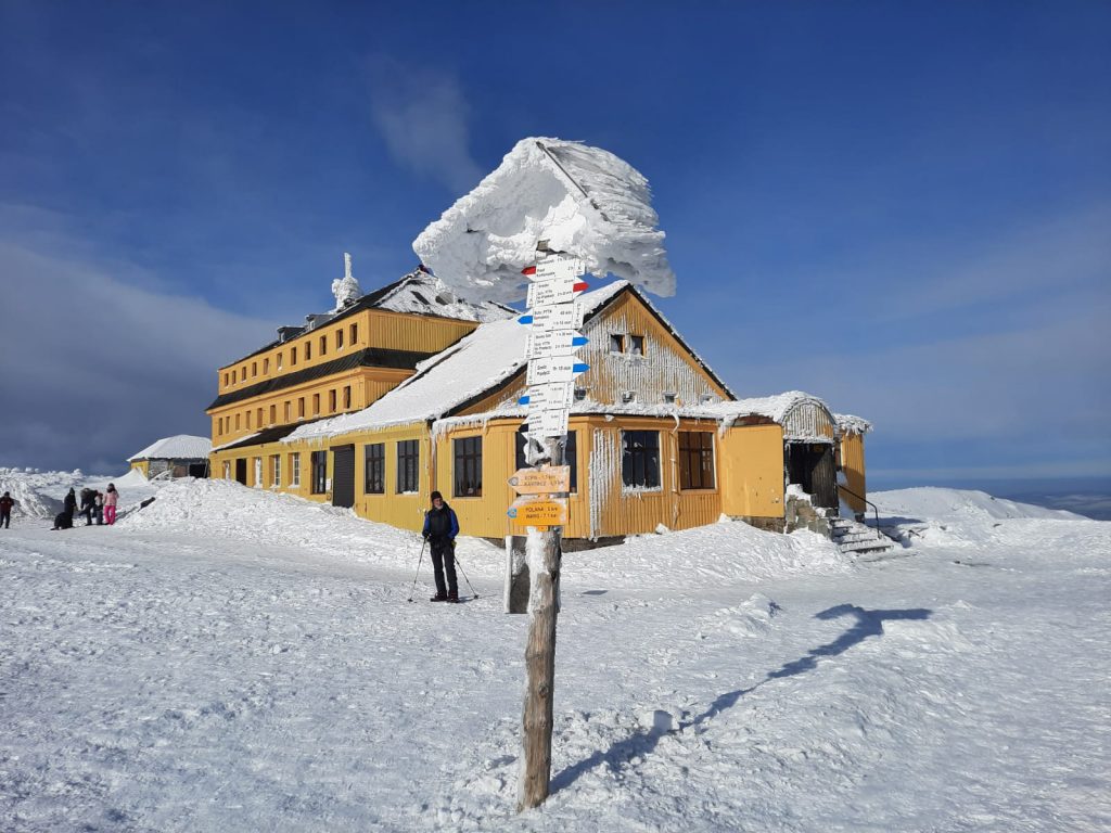 6.02.2023 Zwar mussten wir etwas warten bevor ein Tisch bzw. zwei Plätze frei wurden, aber das Frühstücksbuffet war sehr üppig und abwechslungsreich. Bei wunderschönen Winterwetter geht es über die Vyrovka- Baude (keine Übernachtungshütte mehr) zur mächtigen Wiesenbaude. Sie ist eine der ältesten und bekanntesten Hütten im Riesengebirge, aber auch momentan wohl nur zeitweise geöffnet. Wir konnten jedenfalls nicht buchen, weil geschlossen. Nun ist es nicht mehr weit bis zur Schneekoppe, der höchsten Erhebung mit 1603 Metern. Hier sind nun bedeutend mehr Touristen unterwegs. Von Tschechien geht direkt eine Seilbahn hinauf, zur Seilbahn vom polnischen Karpacz sind es auch nur ca. 30 Minuten zu Fuß. Der auffrischende Wind macht es noch kälter als es ohnehin schon ist. Nach kleinem Imbiss aus den Rucksack, steigen wir ab und machen Kaffee-Pause im Schlesierhaus. Von hier gehen wir noch einen schönen Weg hinab zur Teichbaude, unserer Übernachtung.