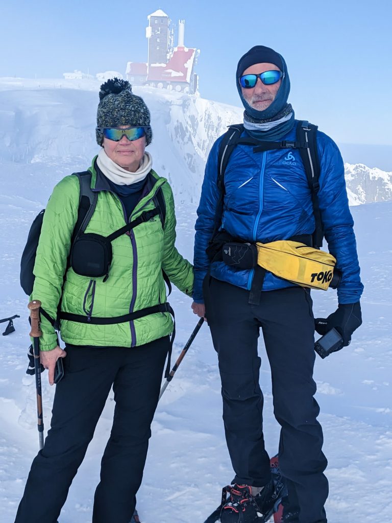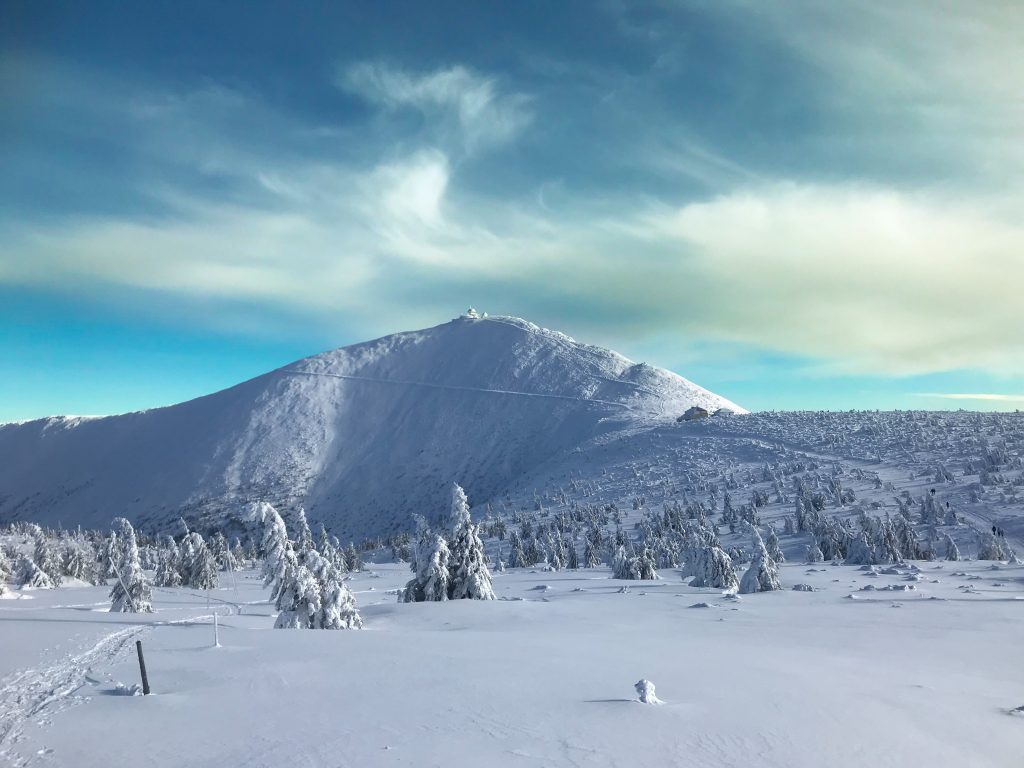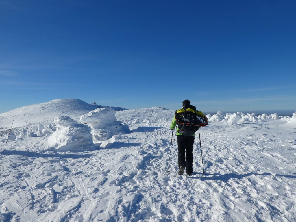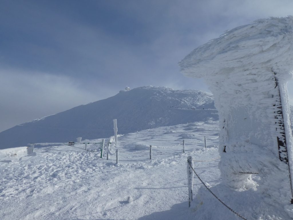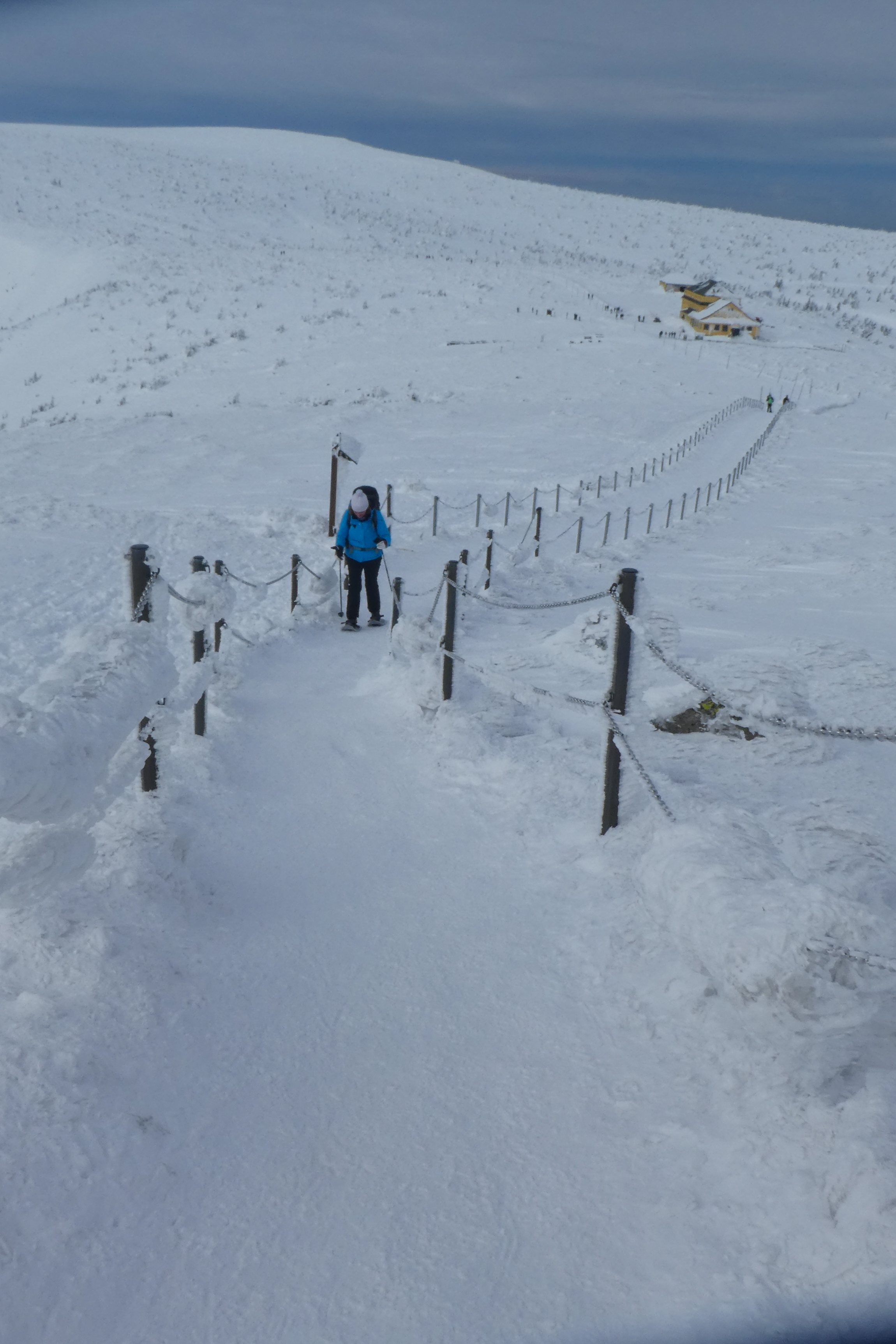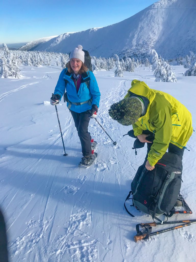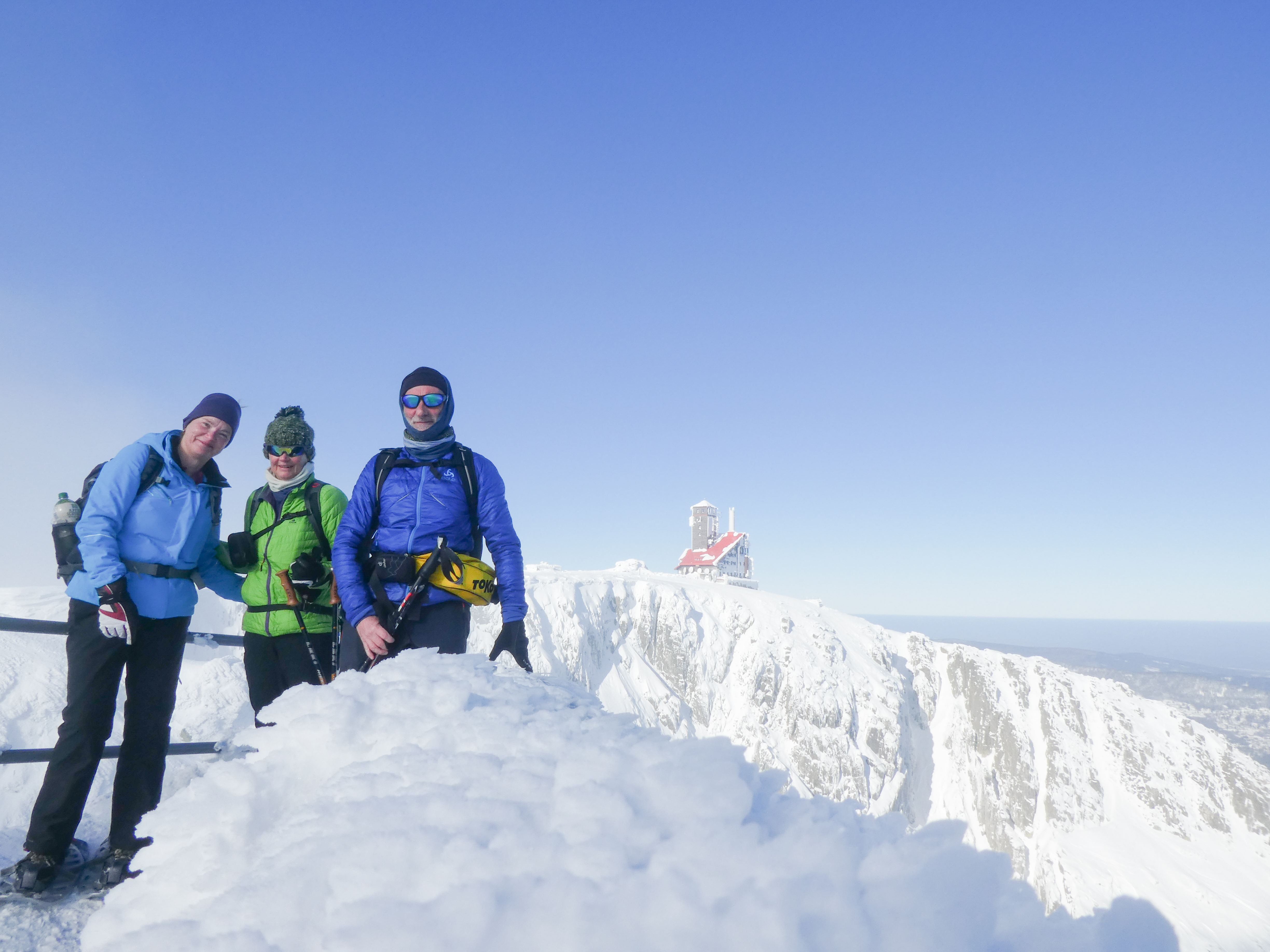 6.02.2023 Zwar mussten wir etwas warten bevor ein Tisch bzw. zwei Plätze frei wurden, aber das Frühstücksbuffet war sehr üppig und abwechslungsreich. Bei wunderschönen Winterwetter geht es über die Vyrovka- Baude (keine Übernachtungshütte mehr) zur mächtigen Wiesenbaude. Sie ist eine der ältesten und bekanntesten Hütten im Riesengebirge, aber auch momentan wohl nur zeitweise geöffnet. Wir konnten jedenfalls nicht buchen, weil geschlossen. Nun ist es nicht mehr weit bis zur Schneekoppe, der höchsten Erhebung mit 1603 Metern. Hier sind nun bedeutend mehr Touristen unterwegs. Von Tschechien geht direkt eine Seilbahn hinauf, zur Seilbahn vom polnischen Karpacz sind es auch nur ca. 30 Minuten zu Fuß. Der auffrischende Wind macht es noch kälter als es ohnehin schon ist. Nach kleinem Imbiss aus den Rucksack, steigen wir ab und machen Kaffee-Pause im Schlesierhaus. Von hier gehen wir noch einen schönen Weg hinab zur Teichbaude, unserer Übernachtung.