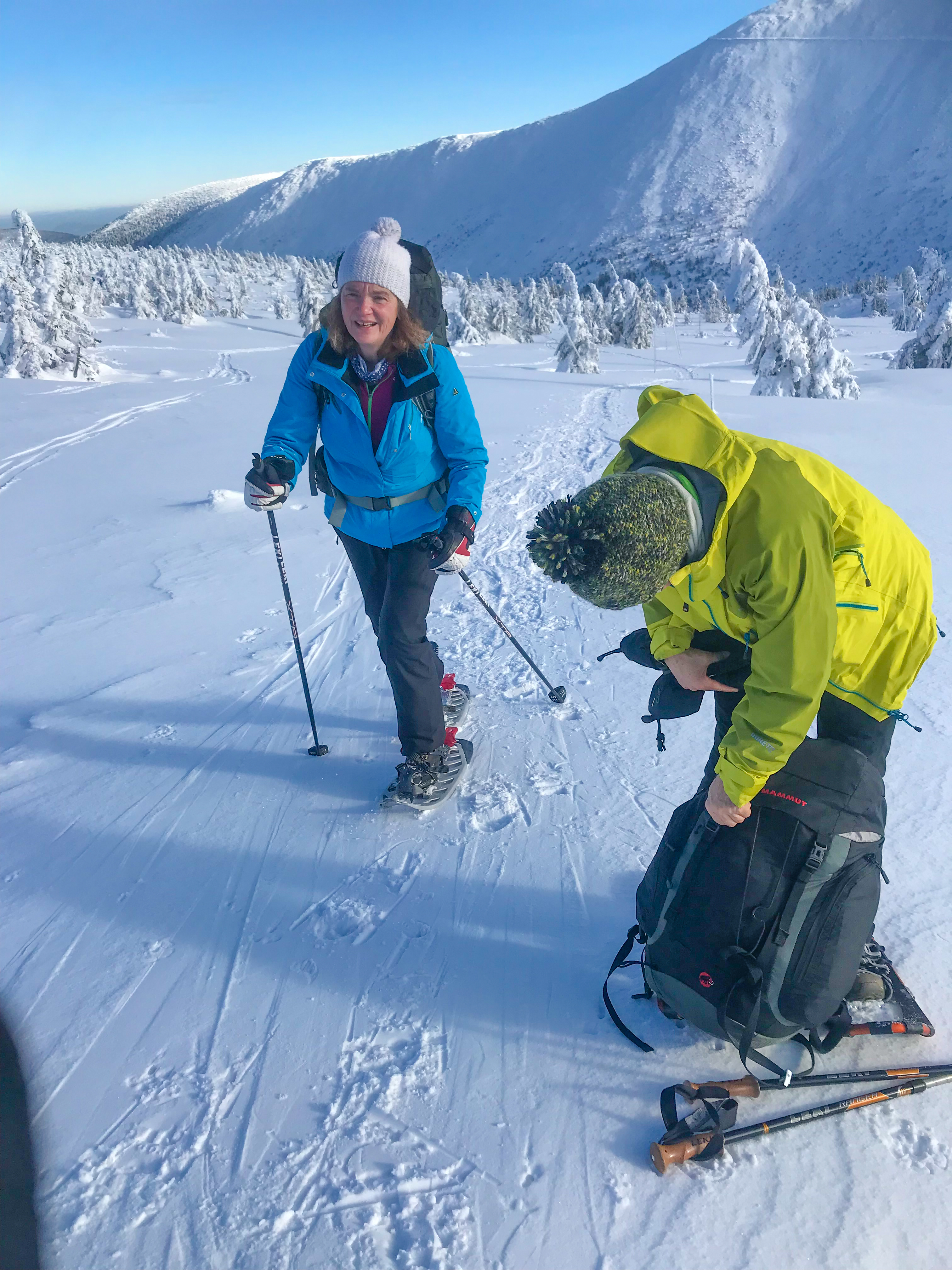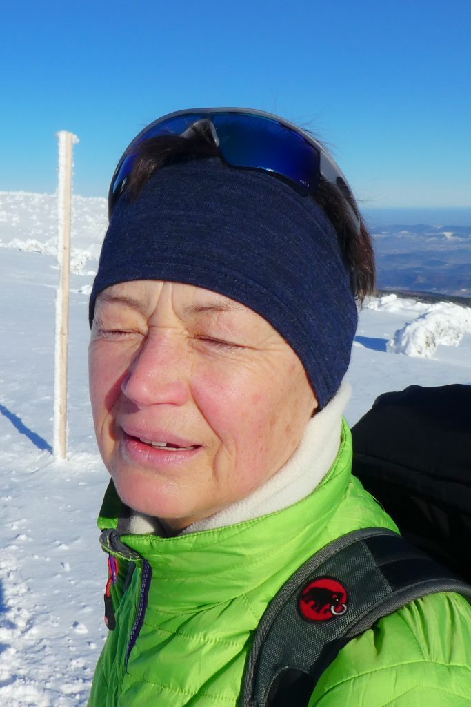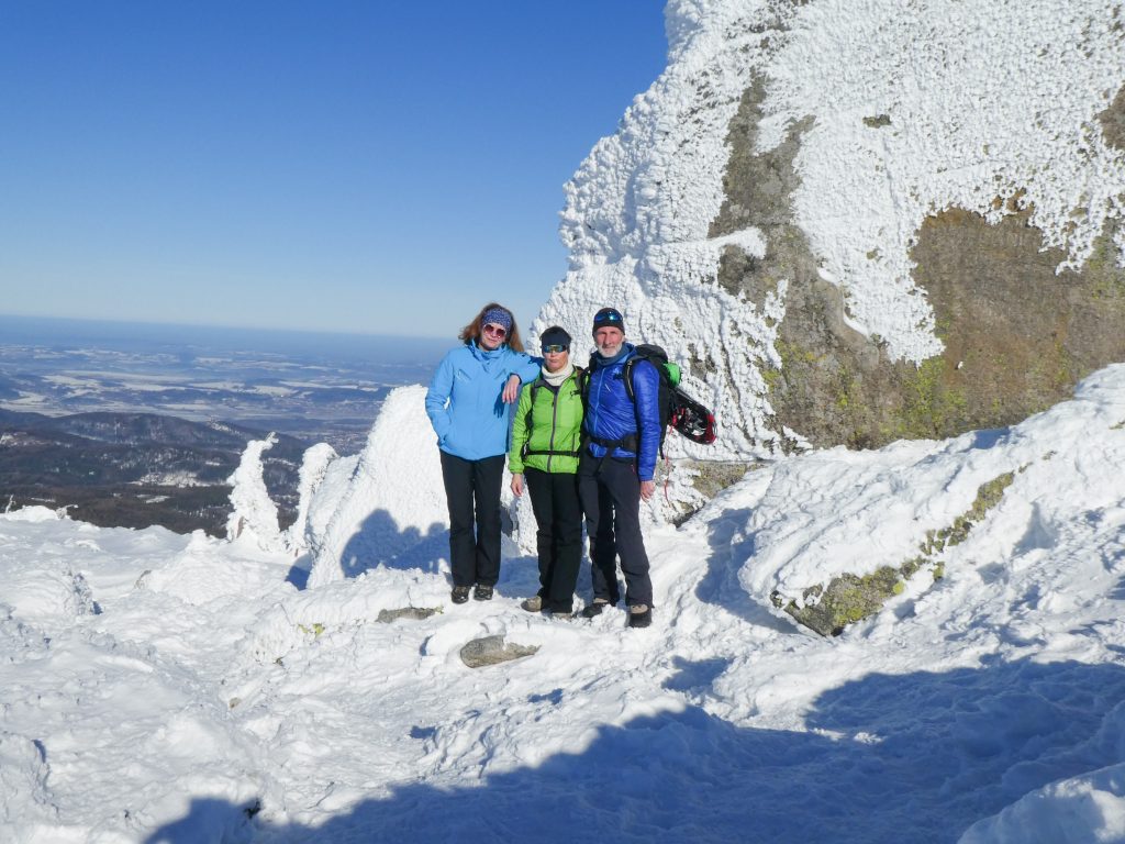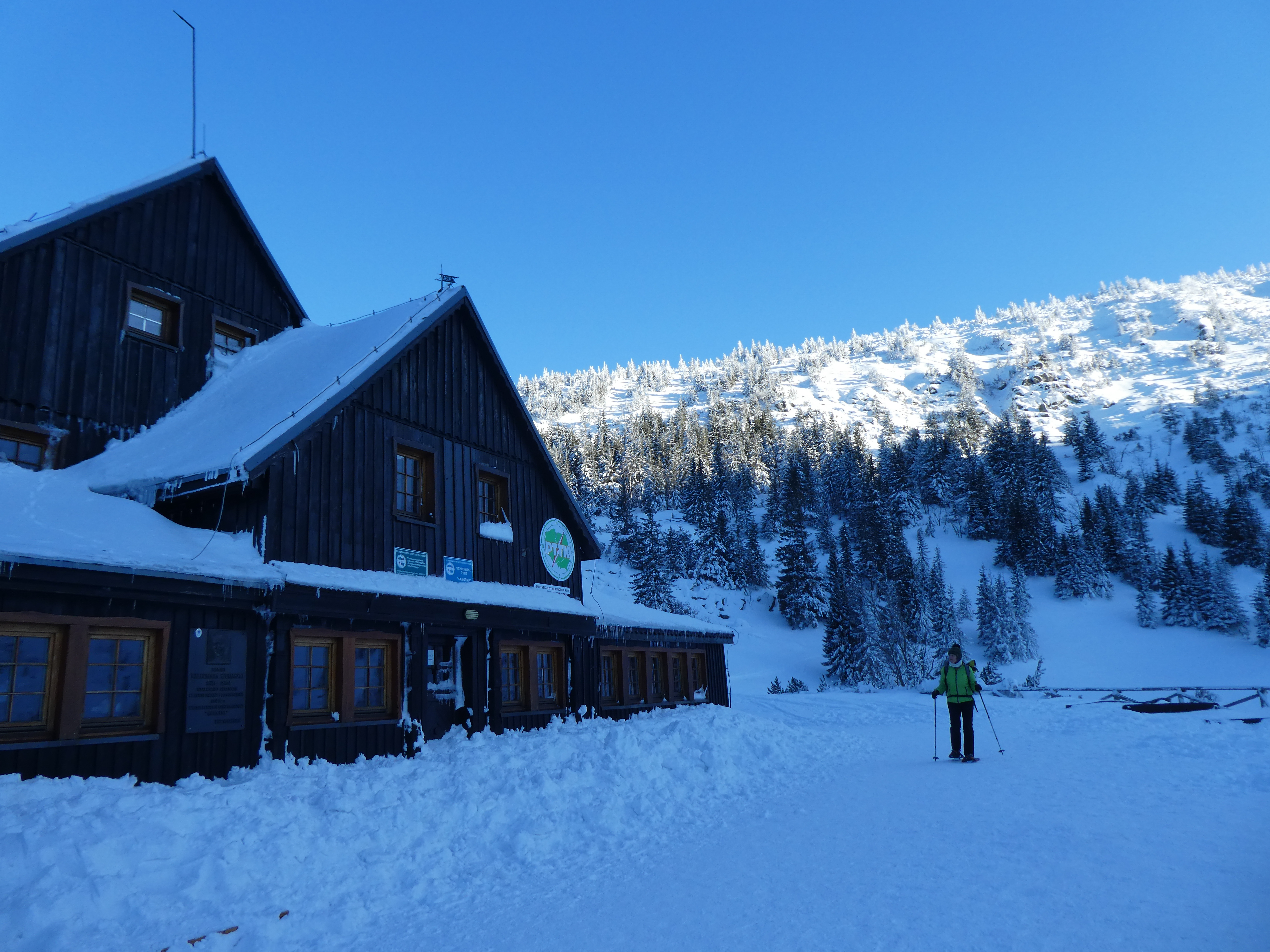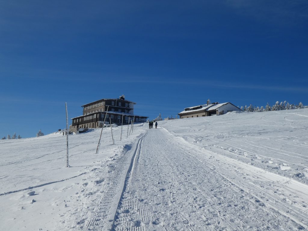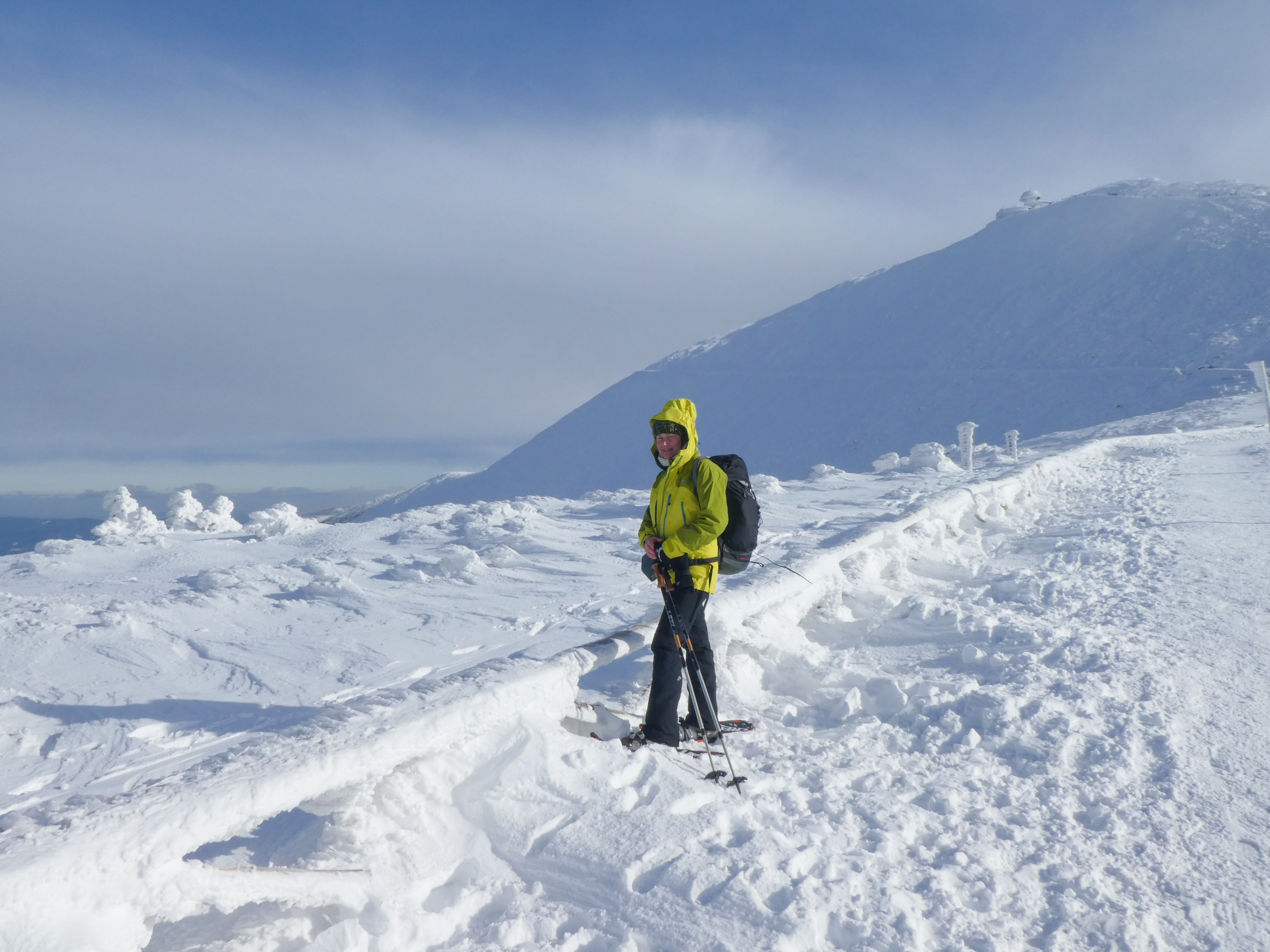 6.02.2023 Zwar mussten wir etwas warten bevor ein Tisch bzw. zwei Plätze frei wurden, aber das Frühstücksbuffet war sehr üppig und abwechslungsreich. Bei wunderschönen Winterwetter geht es über die Vyrovka- Baude (keine Übernachtungshütte mehr) zur mächtigen Wiesenbaude. Sie ist eine der ältesten und bekanntesten Hütten im Riesengebirge, aber auch momentan wohl nur zeitweise geöffnet. Wir konnten jedenfalls nicht buchen, weil geschlossen. Nun ist es nicht mehr weit bis zur Schneekoppe, der höchsten Erhebung mit 1603 Metern. Hier sind nun bedeutend mehr Touristen unterwegs. Von Tschechien geht direkt eine Seilbahn hinauf, zur Seilbahn vom polnischen Karpacz sind es auch nur ca. 30 Minuten zu Fuß. Der auffrischende Wind macht es noch kälter als es ohnehin schon ist. Nach kleinem Imbiss aus den Rucksack, steigen wir ab und machen Kaffee-Pause im Schlesierhaus. Von hier gehen wir noch einen schönen Weg hinab zur Teichbaude, unserer Übernachtung.