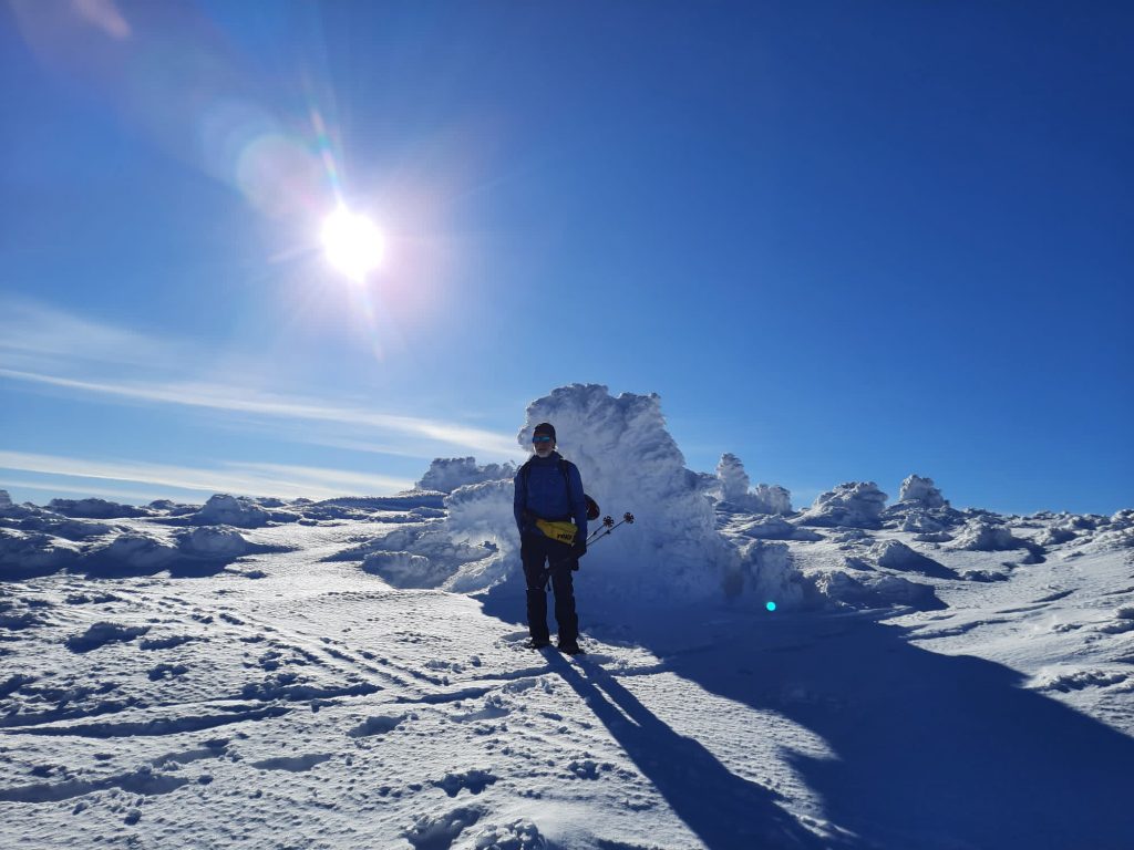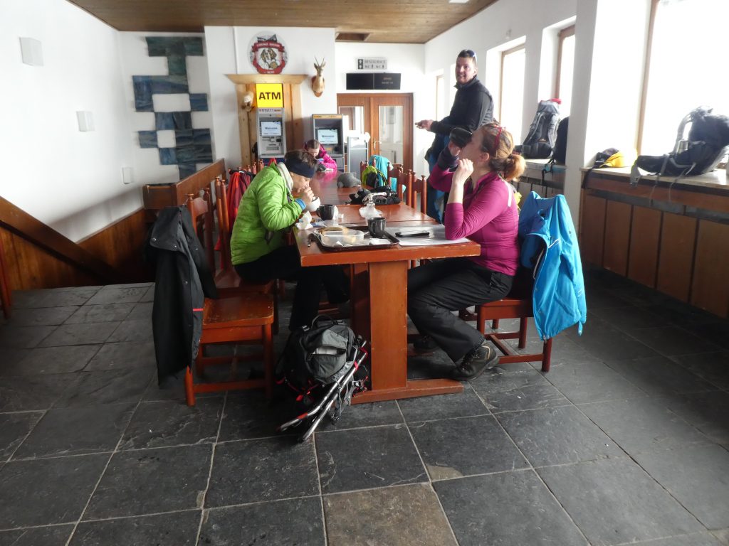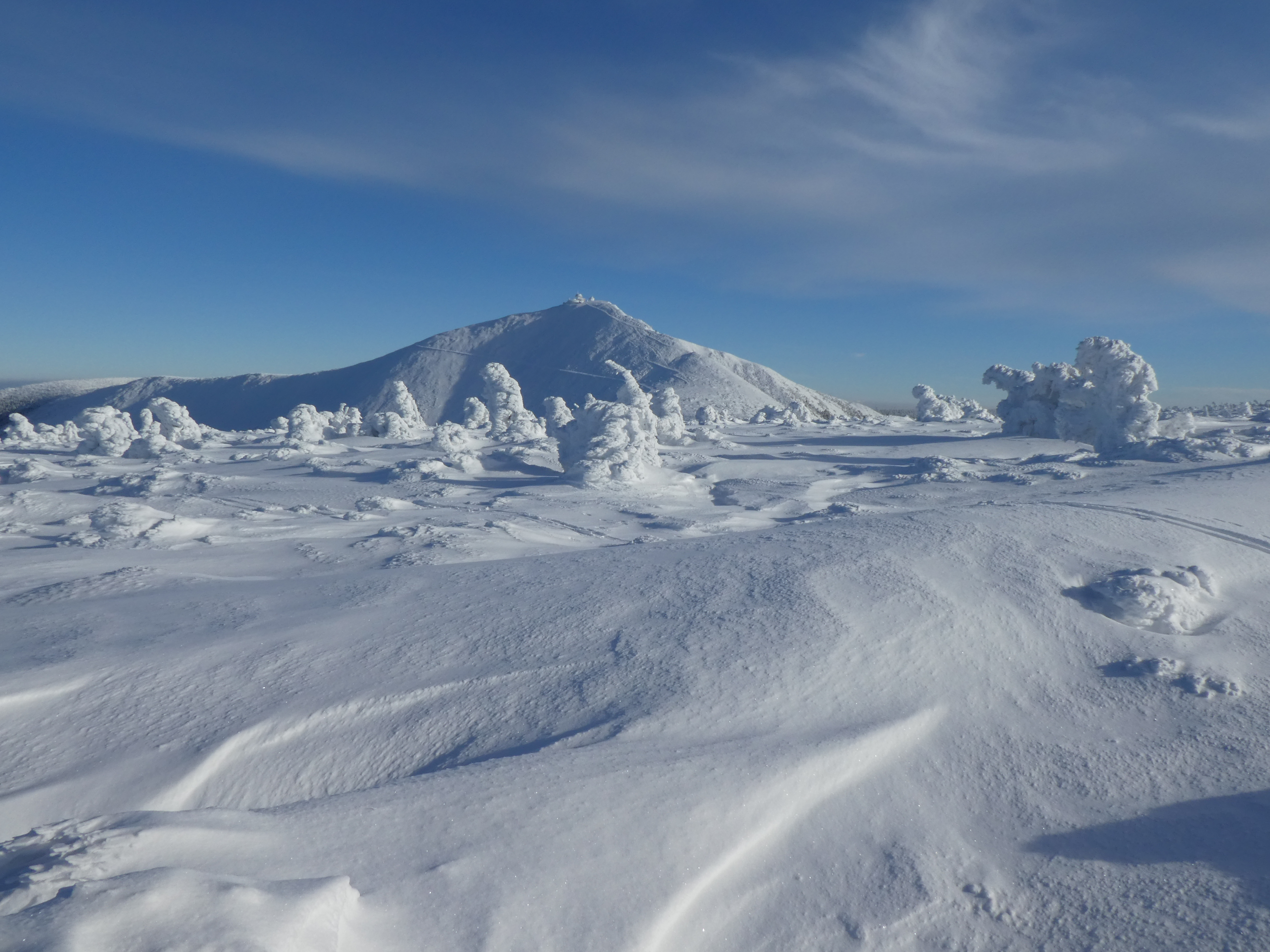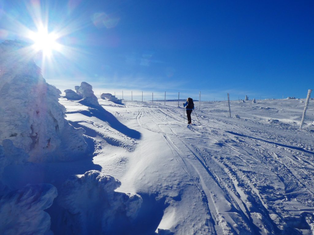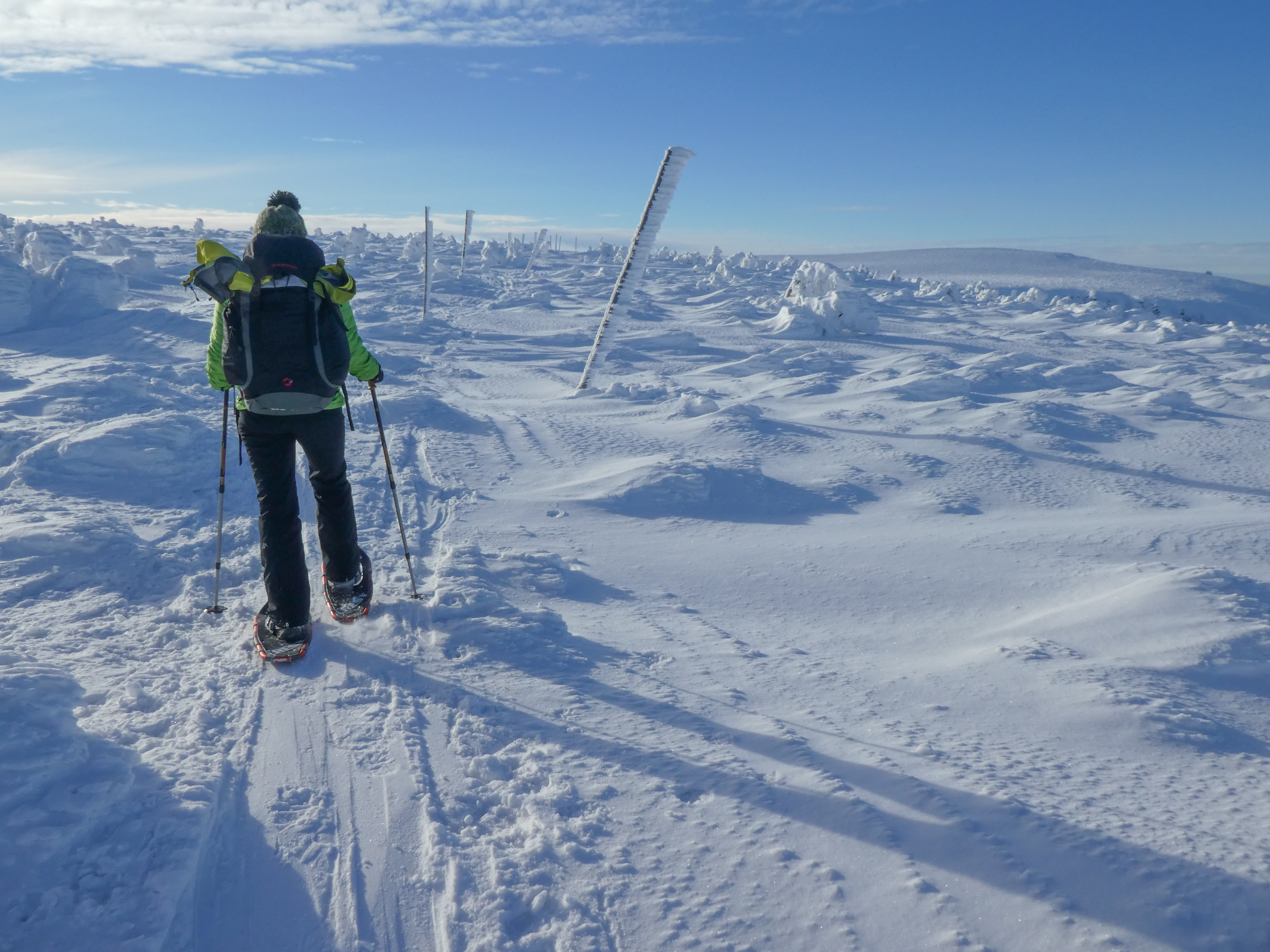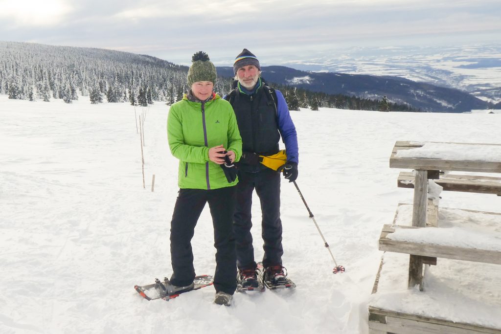 6.02.2023 Zwar mussten wir etwas warten bevor ein Tisch bzw. zwei Plätze frei wurden, aber das Frühstücksbuffet war sehr üppig und abwechslungsreich. Bei wunderschönen Winterwetter geht es über die Vyrovka- Baude (keine Übernachtungshütte mehr) zur mächtigen Wiesenbaude. Sie ist eine der ältesten und bekanntesten Hütten im Riesengebirge, aber auch momentan wohl nur zeitweise geöffnet. Wir konnten jedenfalls nicht buchen, weil geschlossen. Nun ist es nicht mehr weit bis zur Schneekoppe, der höchsten Erhebung mit 1603 Metern. Hier sind nun bedeutend mehr Touristen unterwegs. Von Tschechien geht direkt eine Seilbahn hinauf, zur Seilbahn vom polnischen Karpacz sind es auch nur ca. 30 Minuten zu Fuß. Der auffrischende Wind macht es noch kälter als es ohnehin schon ist. Nach kleinem Imbiss aus den Rucksack, steigen wir ab und machen Kaffee-Pause im Schlesierhaus. Von hier gehen wir noch einen schönen Weg hinab zur Teichbaude, unserer Übernachtung.