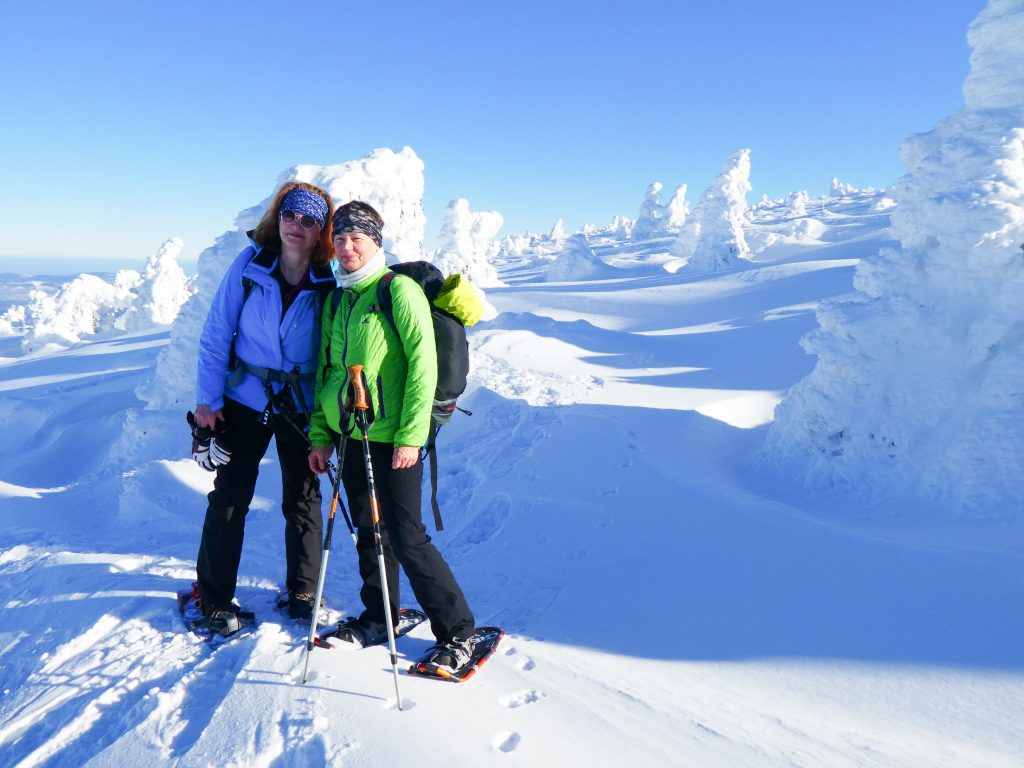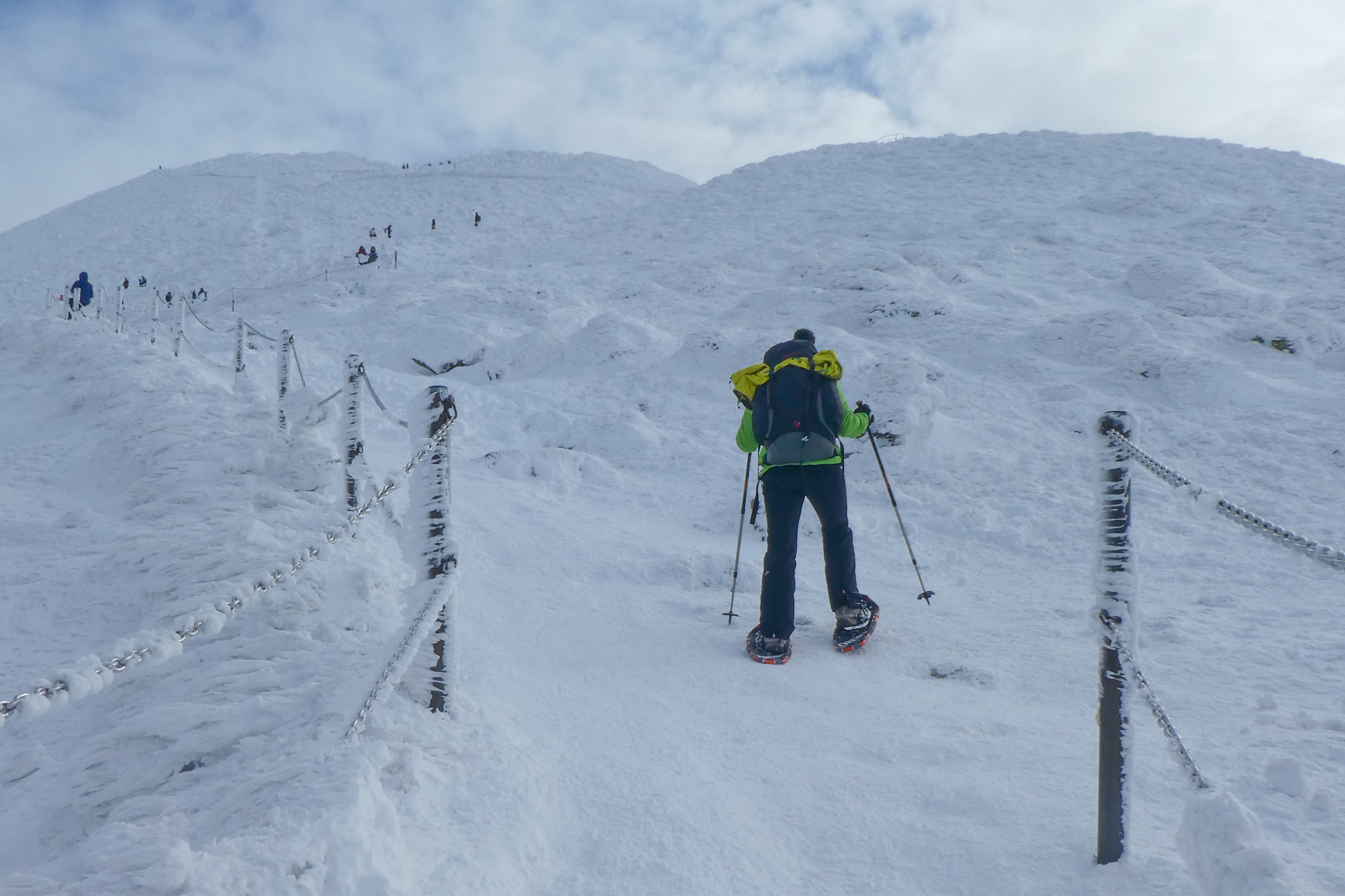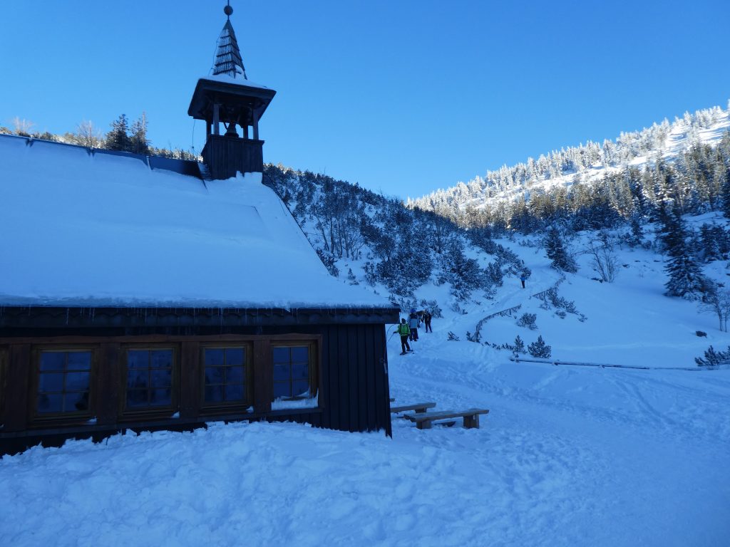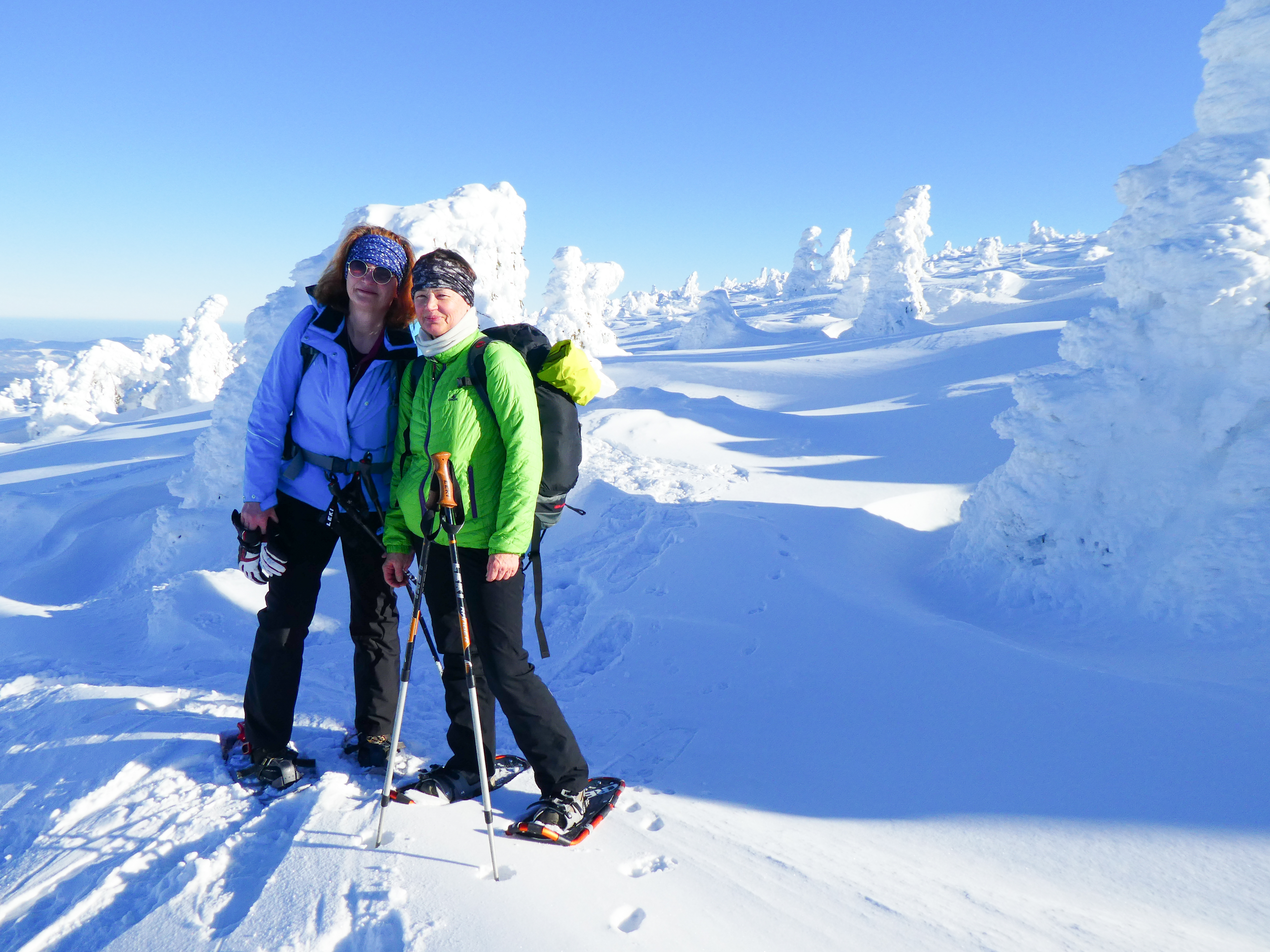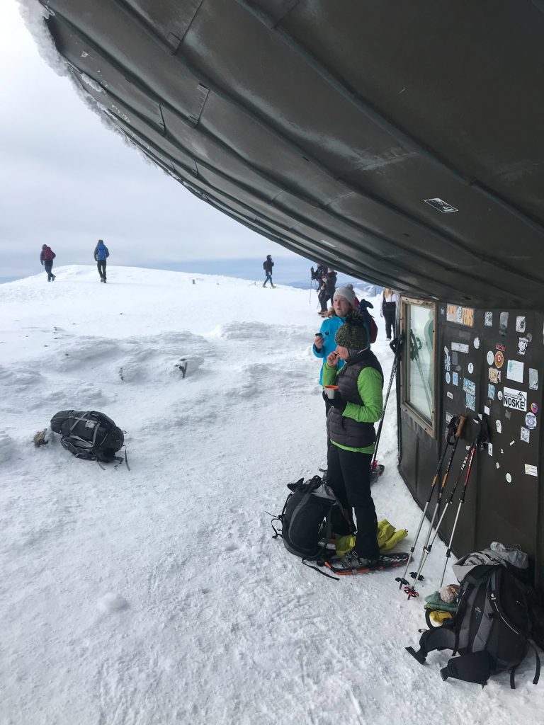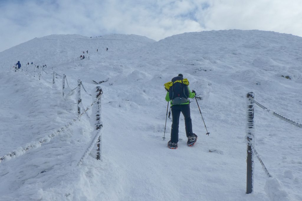 6.02.2023 Zwar mussten wir etwas warten bevor ein Tisch bzw. zwei Plätze frei wurden, aber das Frühstücksbuffet war sehr üppig und abwechslungsreich. Bei wunderschönen Winterwetter geht es über die Vyrovka- Baude (keine Übernachtungshütte mehr) zur mächtigen Wiesenbaude. Sie ist eine der ältesten und bekanntesten Hütten im Riesengebirge, aber auch momentan wohl nur zeitweise geöffnet. Wir konnten jedenfalls nicht buchen, weil geschlossen. Nun ist es nicht mehr weit bis zur Schneekoppe, der höchsten Erhebung mit 1603 Metern. Hier sind nun bedeutend mehr Touristen unterwegs. Von Tschechien geht direkt eine Seilbahn hinauf, zur Seilbahn vom polnischen Karpacz sind es auch nur ca. 30 Minuten zu Fuß. Der auffrischende Wind macht es noch kälter als es ohnehin schon ist. Nach kleinem Imbiss aus den Rucksack, steigen wir ab und machen Kaffee-Pause im Schlesierhaus. Von hier gehen wir noch einen schönen Weg hinab zur Teichbaude, unserer Übernachtung.