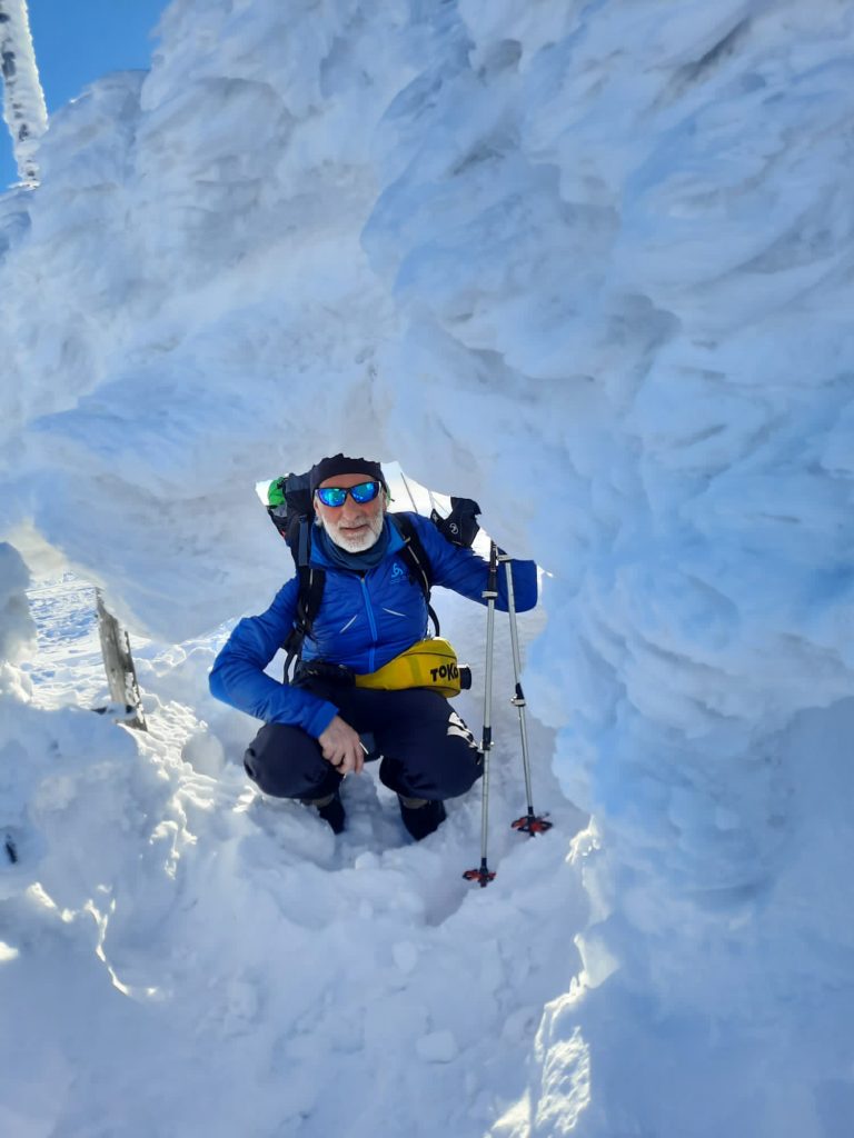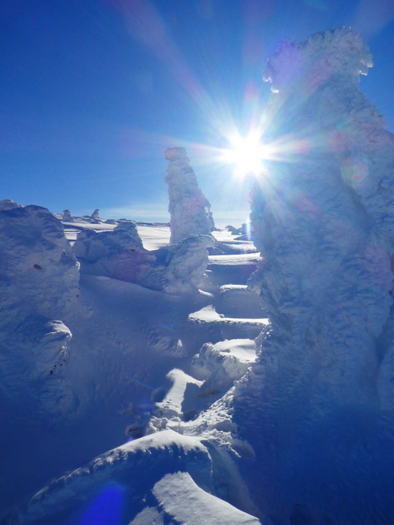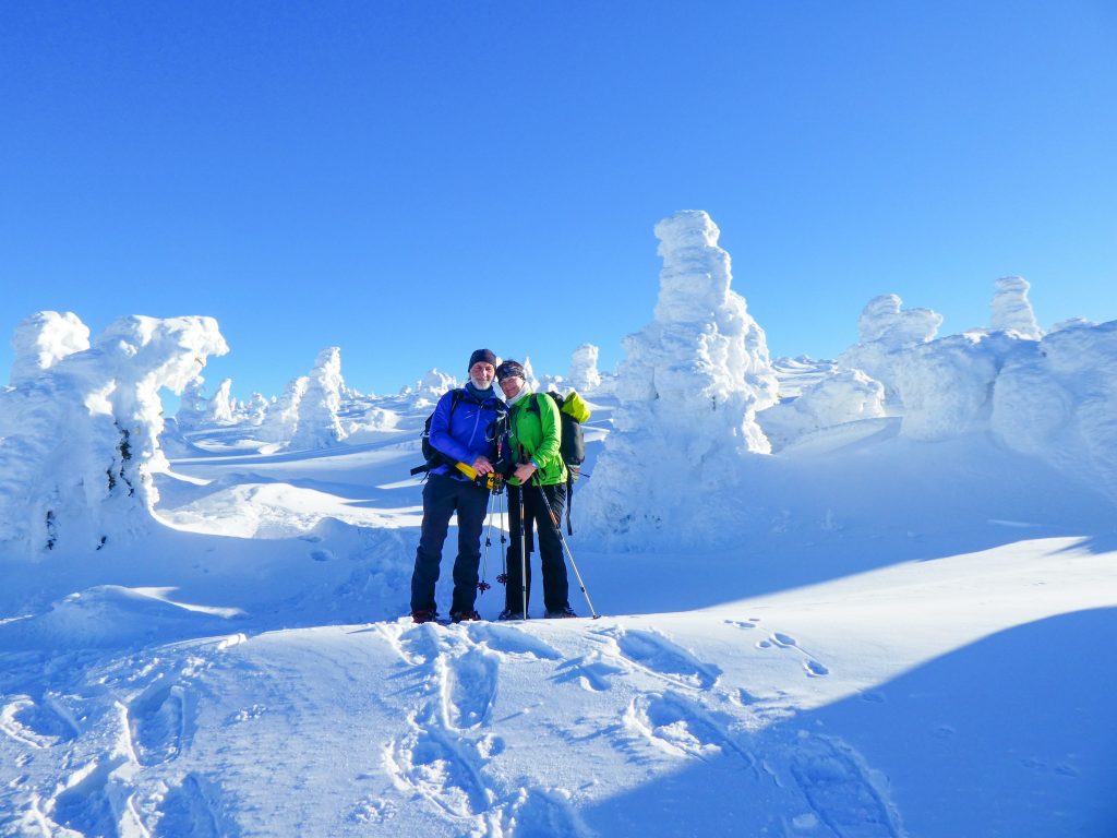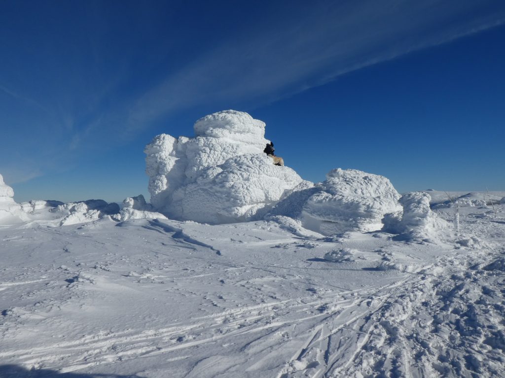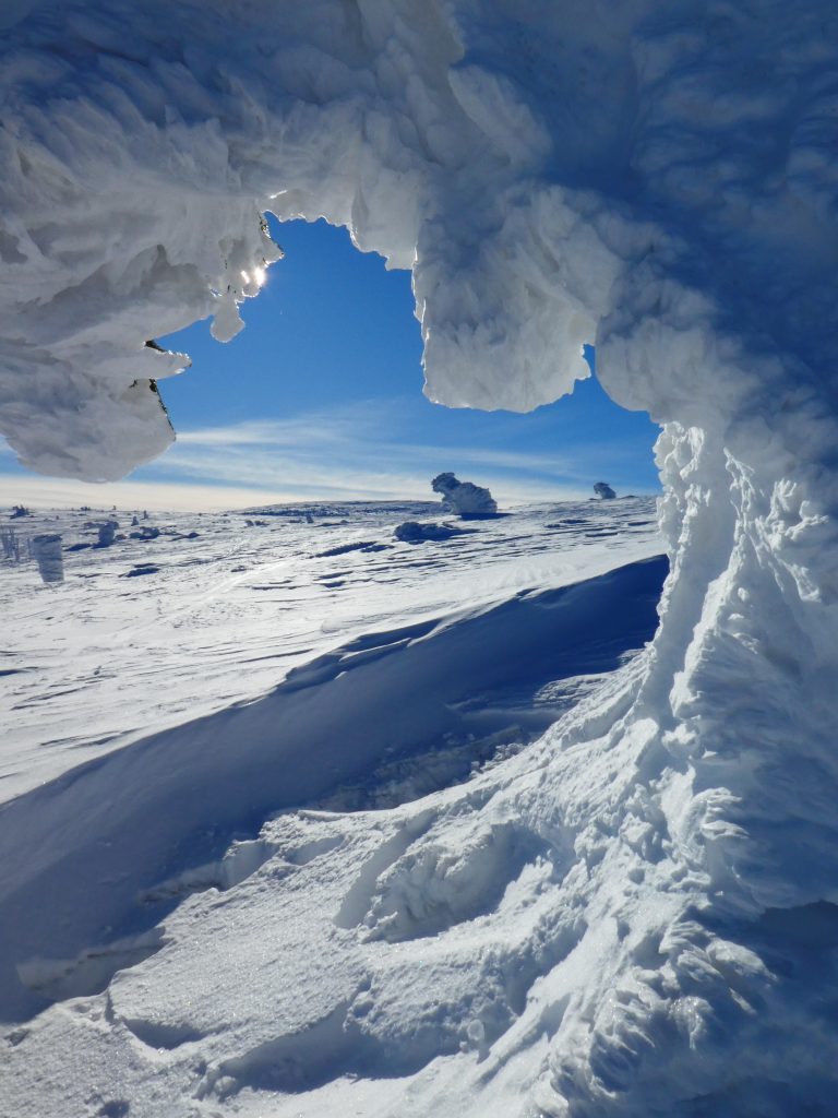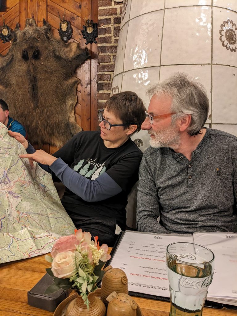 7.02.2023 Anneroses Geburtstag! Die Teichbaude, wie das Schlesierhaus, auf polnischer Seite, war gemütlich und das Essen gut. Die Hütte ist etwas abgelegen, 200 Höhenmeter unterhalb des Hauptkamm. Diese 200 Meter geht es nun am Morgen wieder hinauf. Bei wunderschönen kalten, sonniges Winterwetter wandern wir vorbei an beeindruckenden Eisformationen Richtung Spindler-Pass. Dort machen wir eine kleine Mittagspause, bevor es weiter geht über die Petersbaude zur Martinsbaude. In der Martinsbaude treffen wir dann auch auf andere deutsche Touristen, meist Langläufer. Das Essen ist wieder sehr gut und das Bier und der Wein natürlich auch auch.
