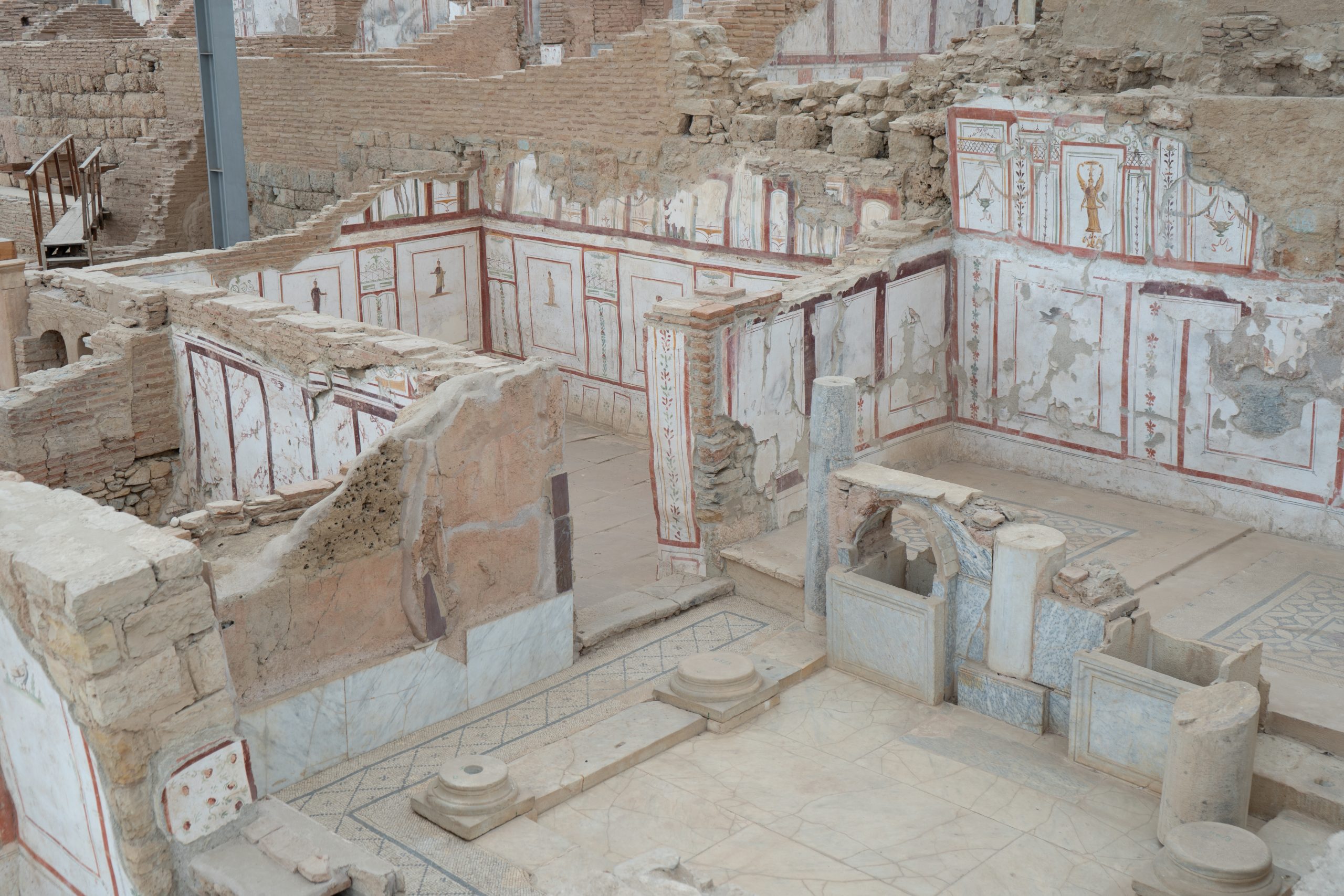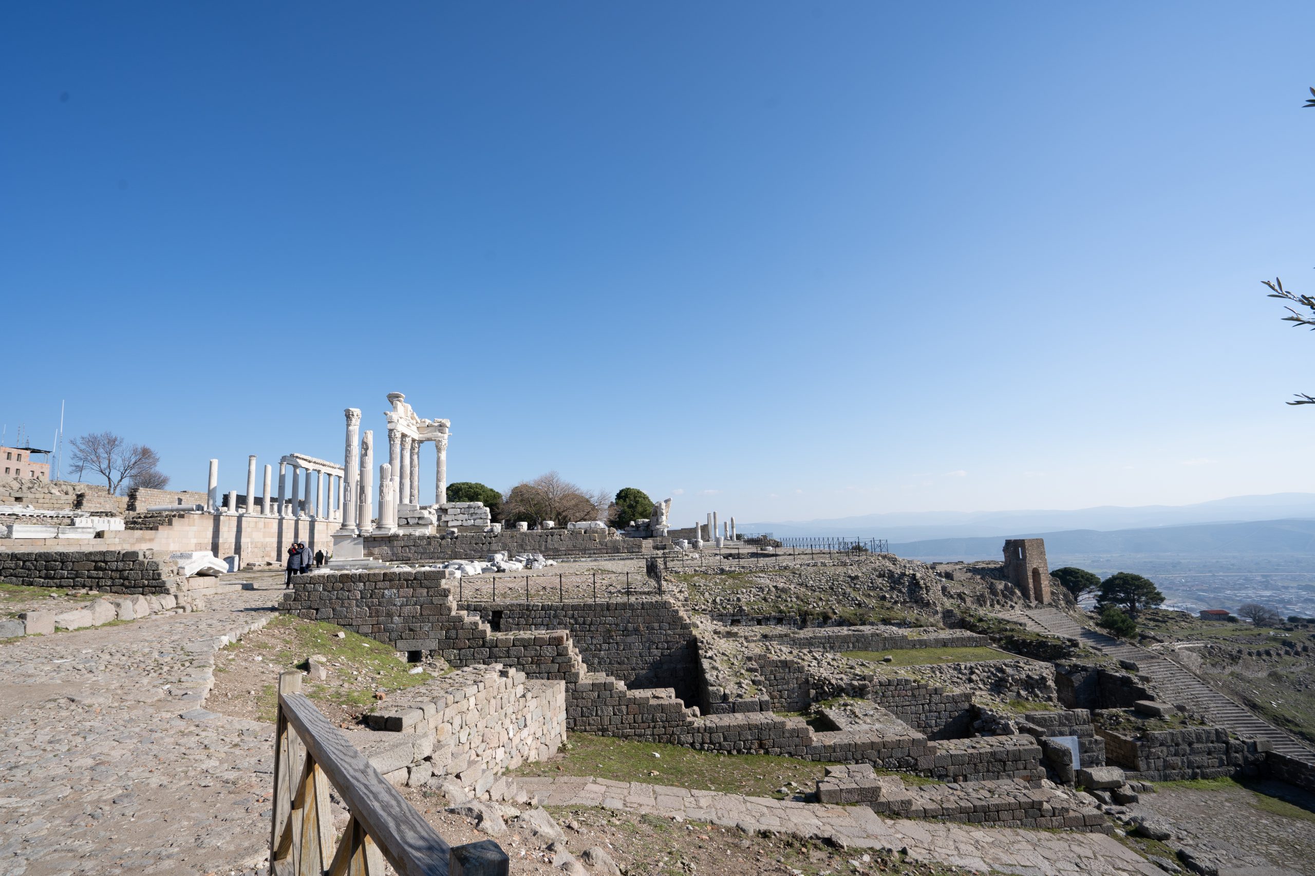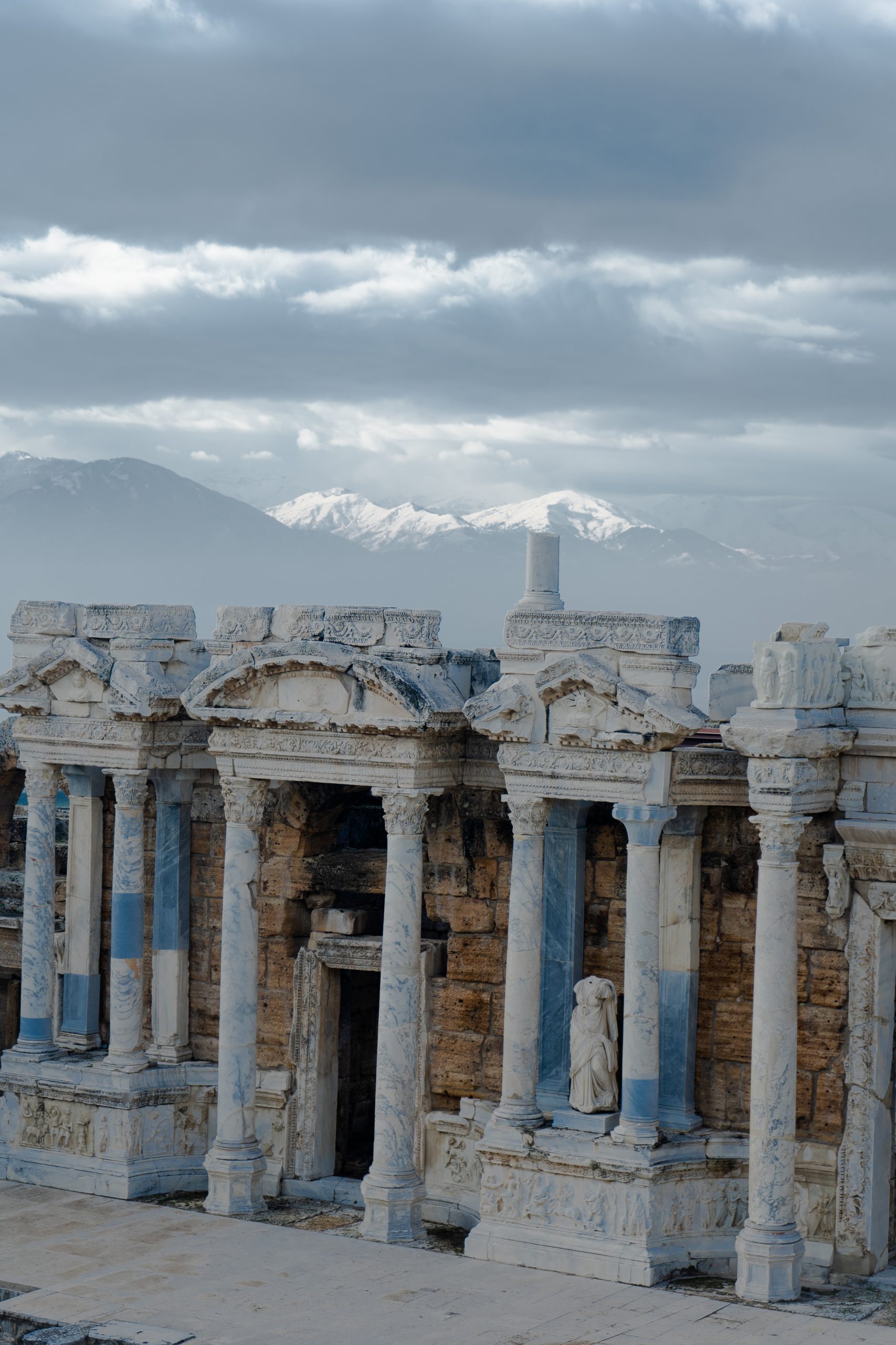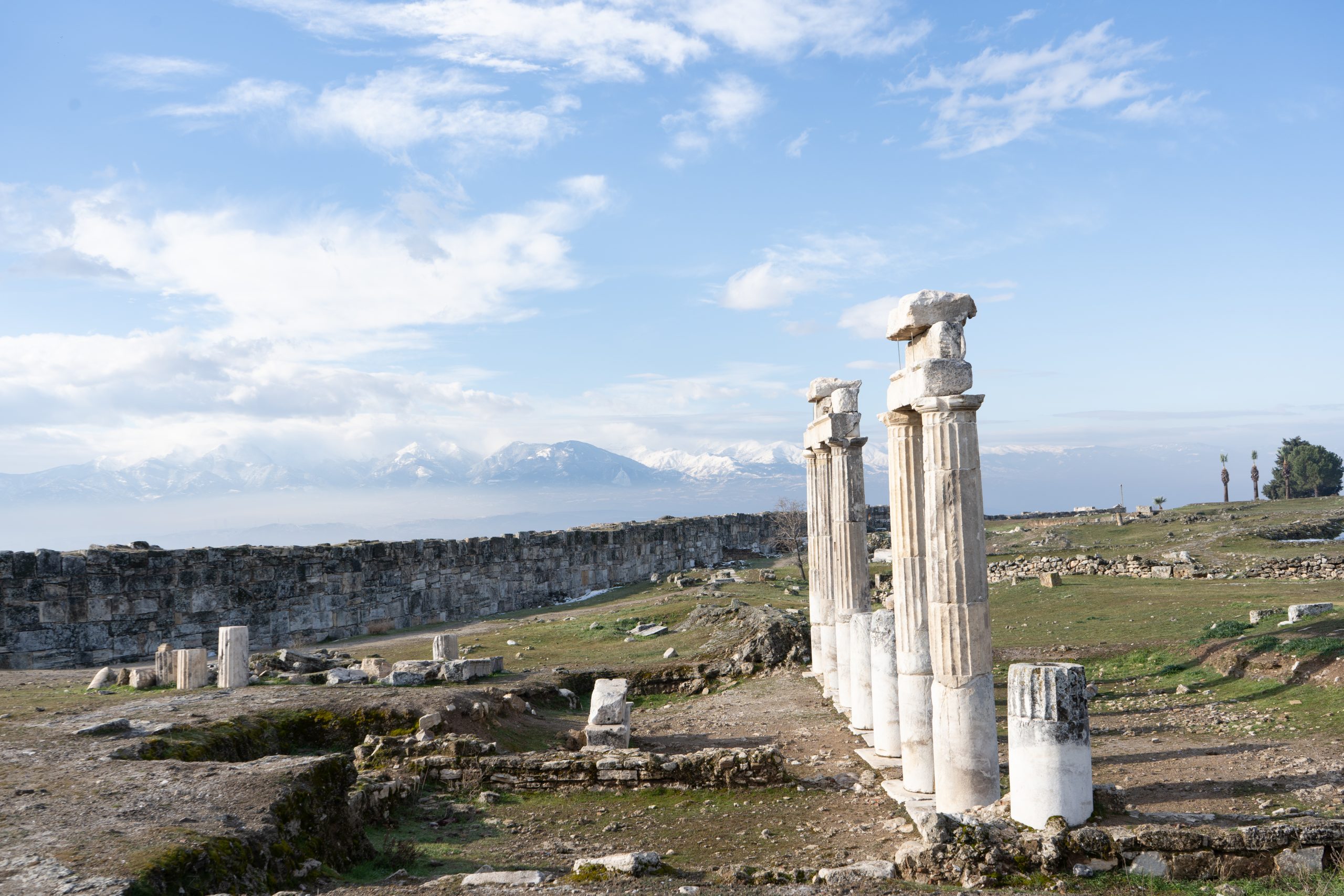 Hierapolis, ein großen weites Ruinenfeld mit Blick auf die verschneiten Berge