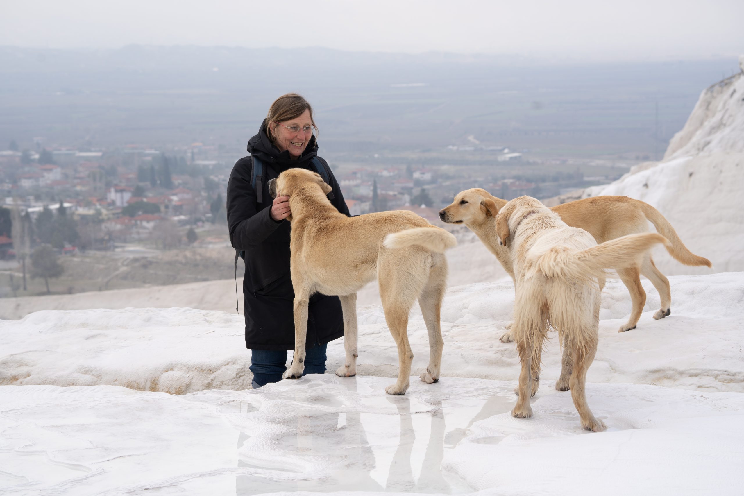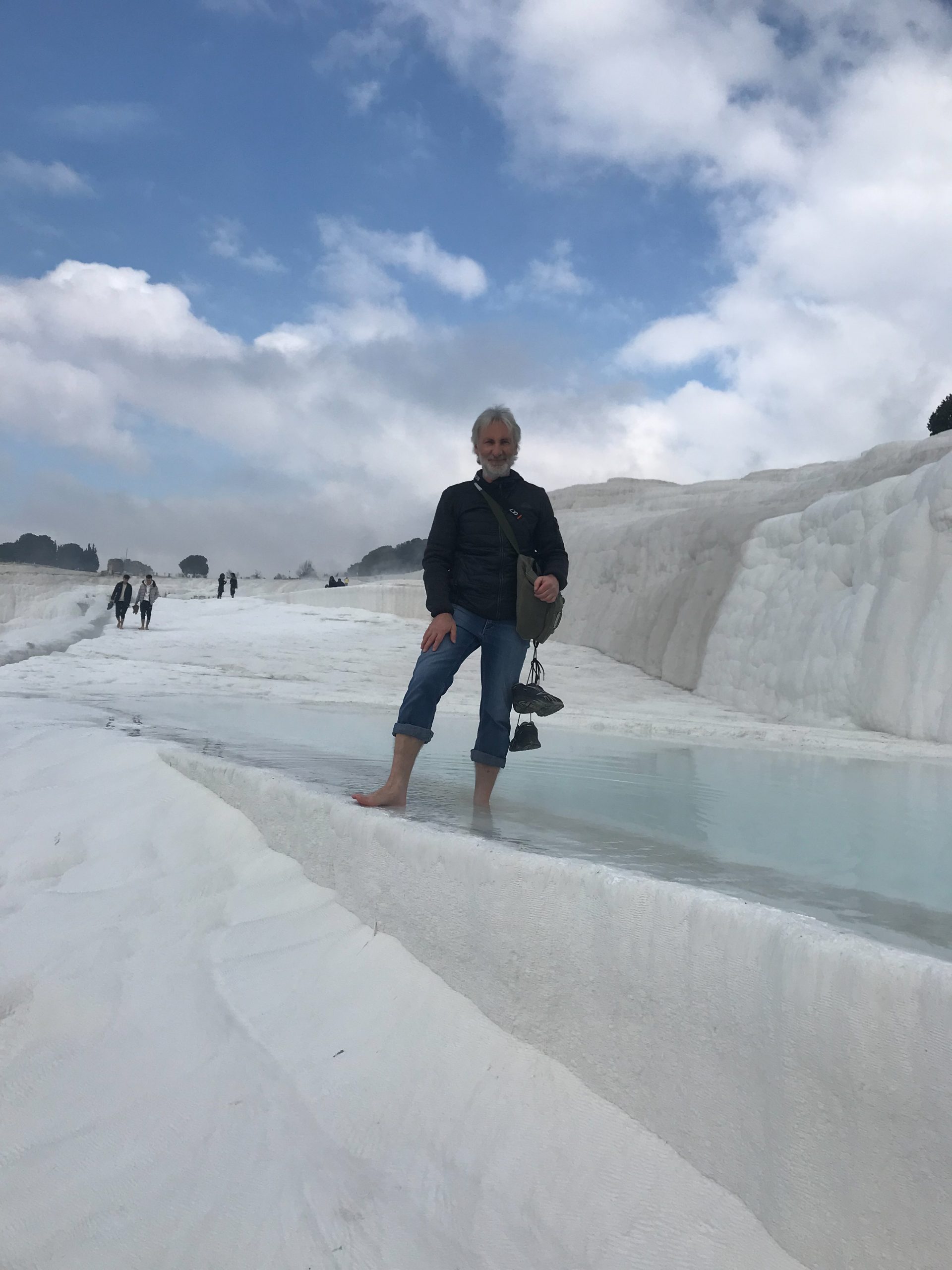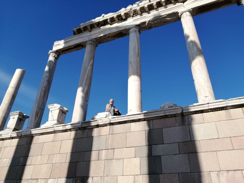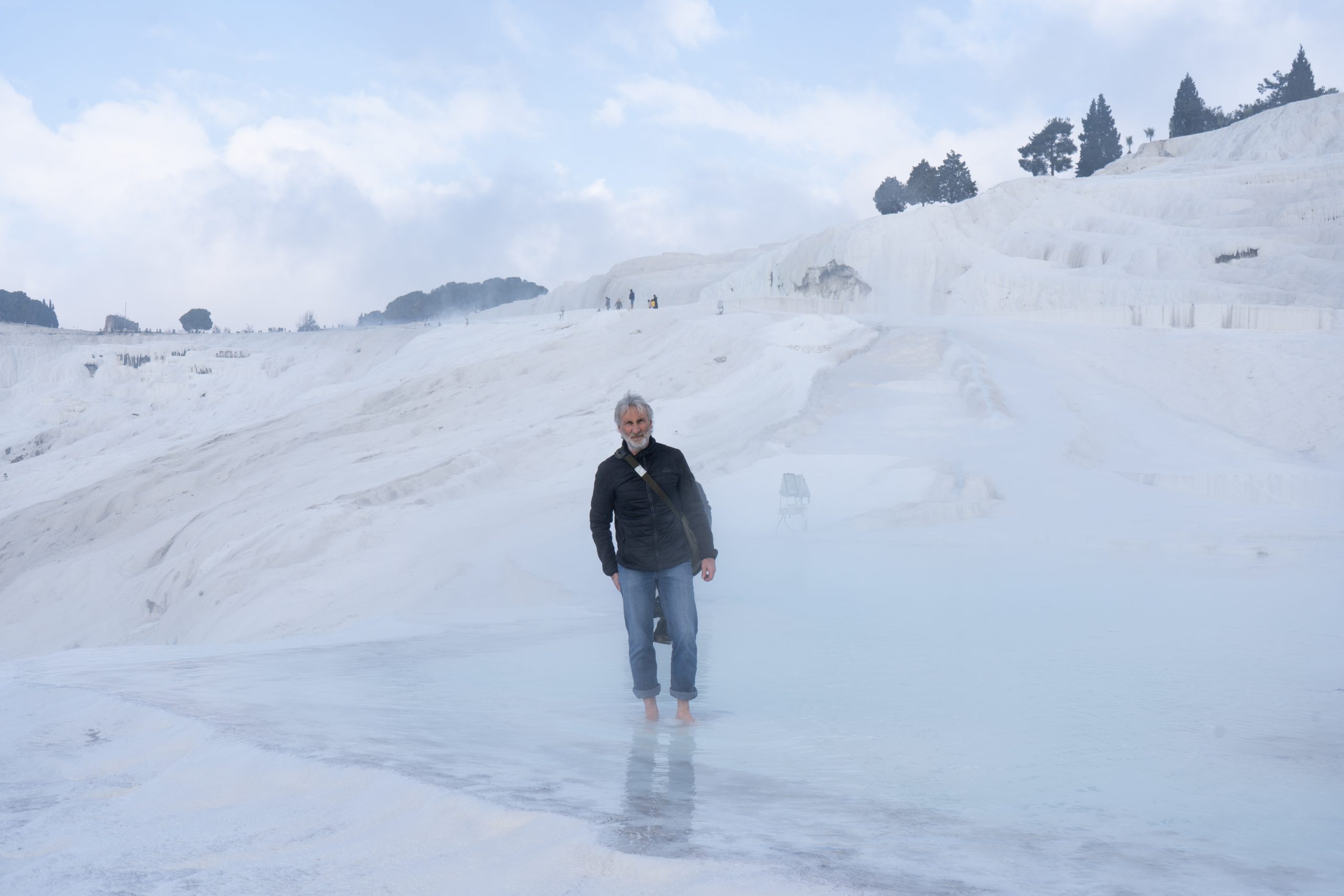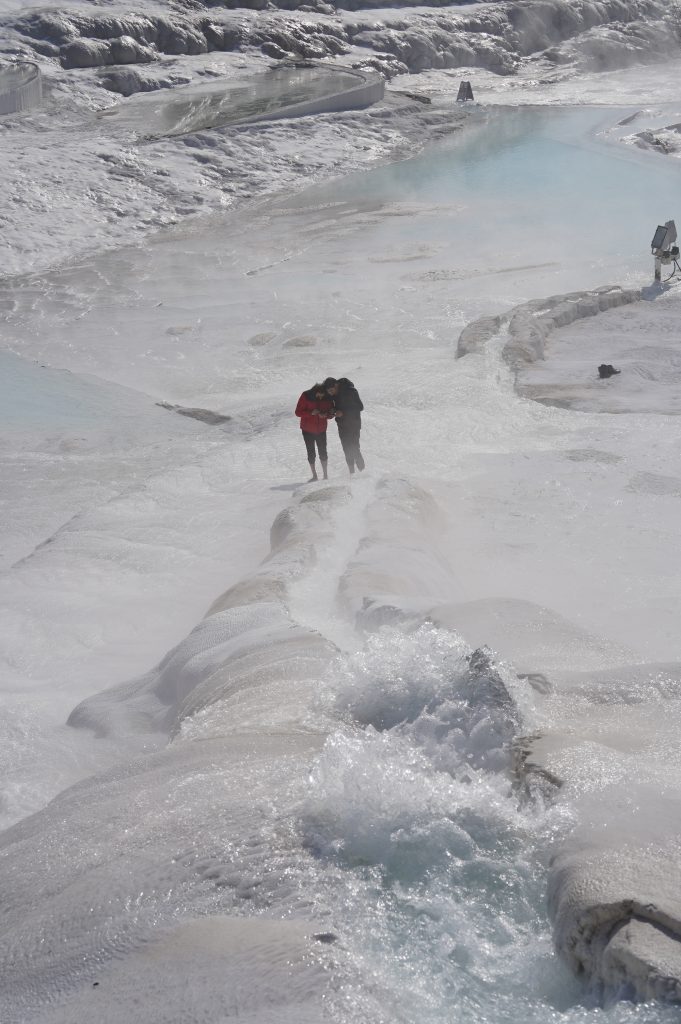 Am nächsten Morgen gehe ich in das antike Thermalbad (Hilli hat sich den Zeh angeschlagen und kann kaum laufen) . Das Bad befindet sich mitten auf den Ruinen von Hierapolis. Bei den noch sehr kalten Außentemperaturen tat das warme Wasser besonders gut. Es hilft ja auch für alles.