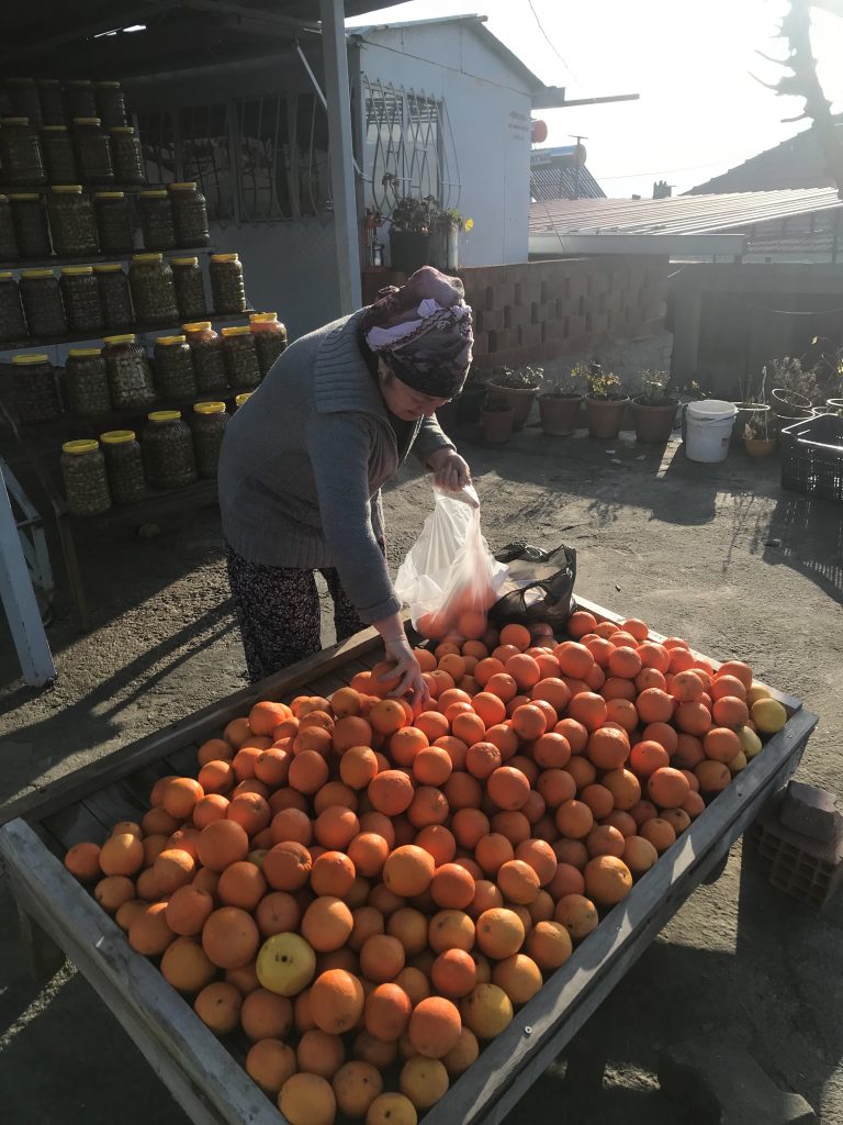 Auf dem Weg nach Pamukkale fahren wir durch das weite Mäander-Tal. Hier werden großflächig Orangen, Mandarinen, Zitronen und Oliven angebaut. Olivenbäume findet man einfach überall. Bei diesen Stand am Straßenrand habe ich super saftige Orangen gekauft. Das Kilo etwa 30 cent.