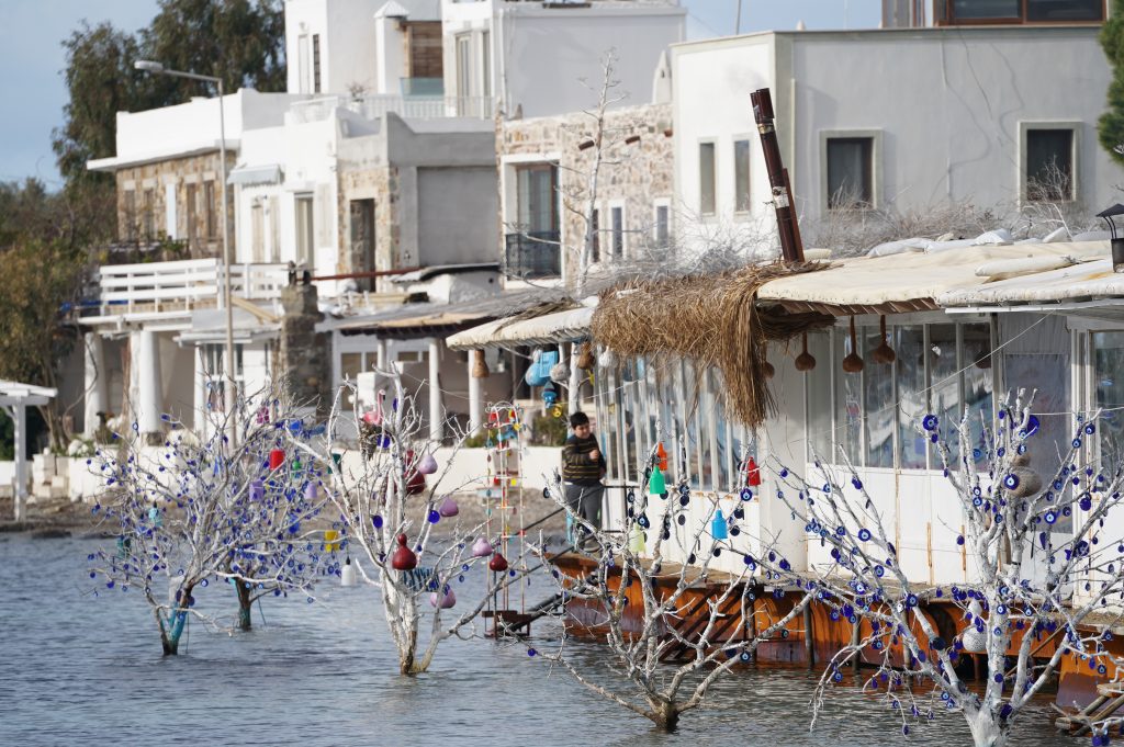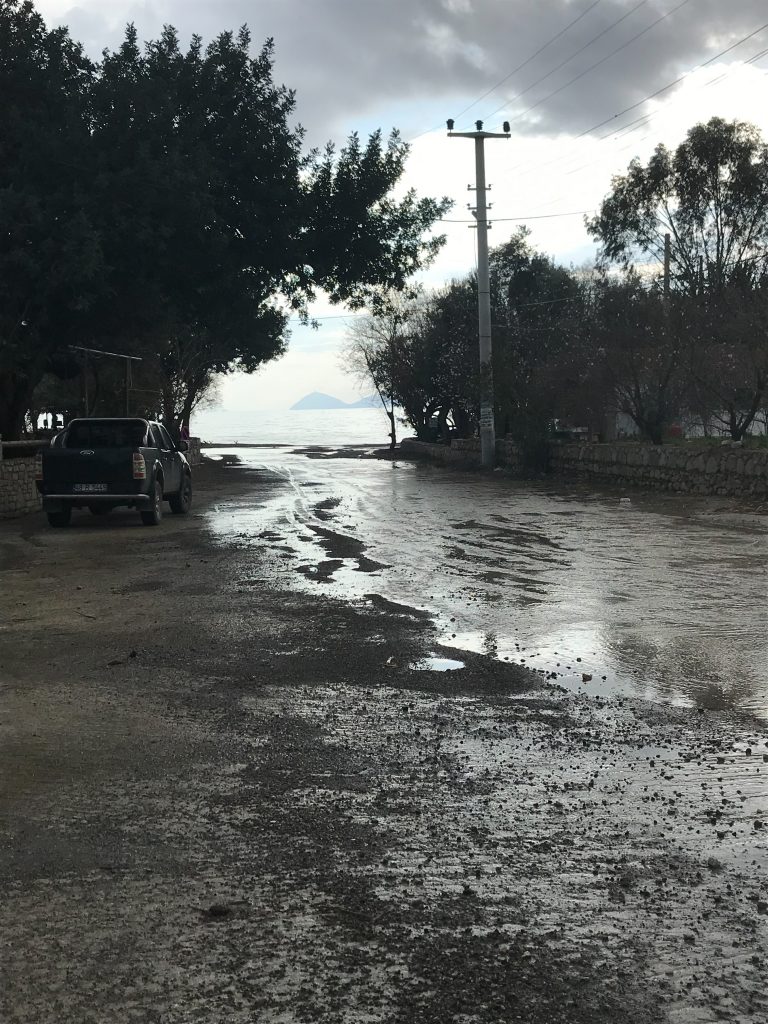 Von Pamukkale geht auf die Halbinsel Bodrum, zunächst nach Gumüslük. Dachte dort etwas Wandern oder Radeln zu können. Aber das Wetter ist unbeständig, gewittert oft mit Starkregen und Hagel. Auf dem Weg nach Bodrum war schon viel Land unter Wasser.