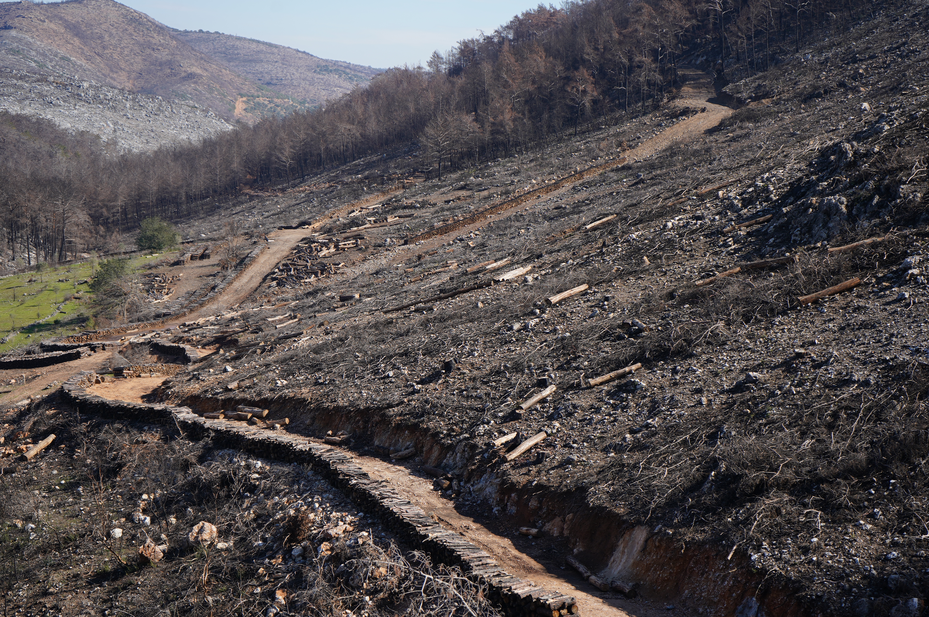 Hier hatte es wohl gebrannt. Eine Menge verkohltes Holz wird herausgeholt.