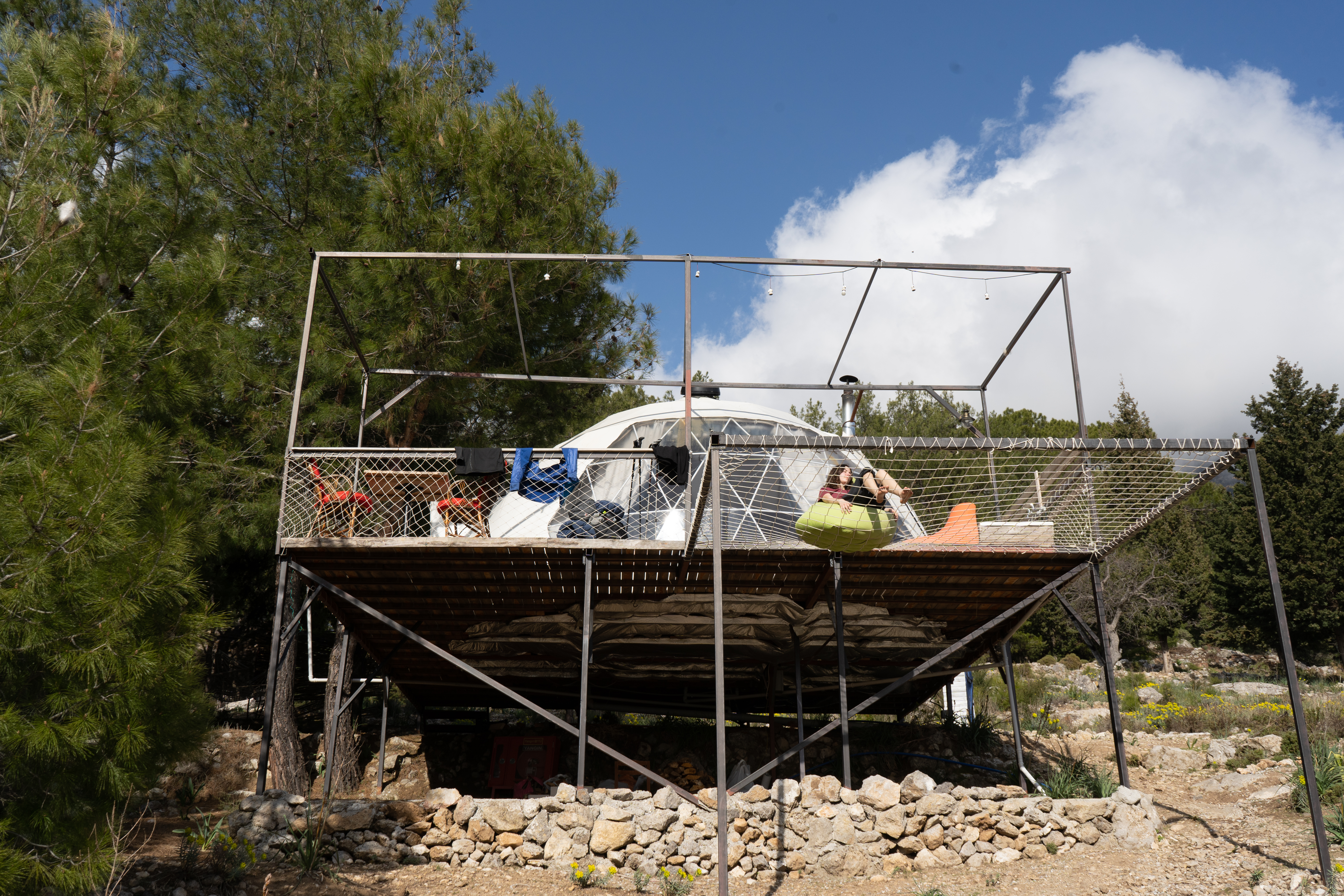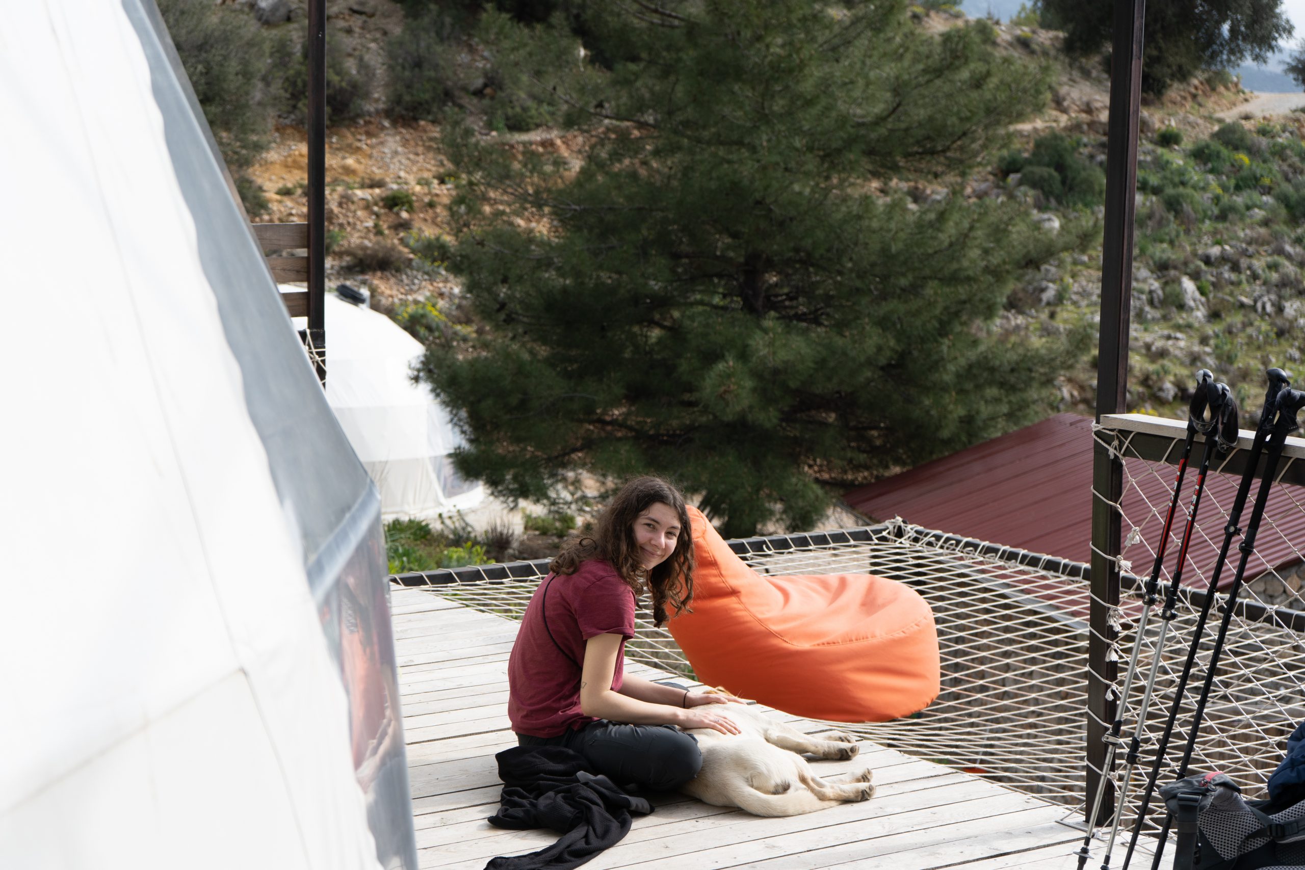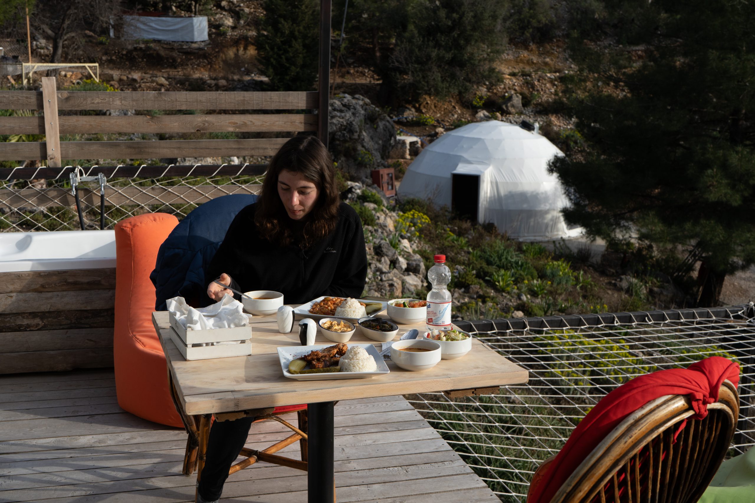 Wir laufen um Alinca herum zu unserer gebuchten Unterkunft Turkdomes Glamping
