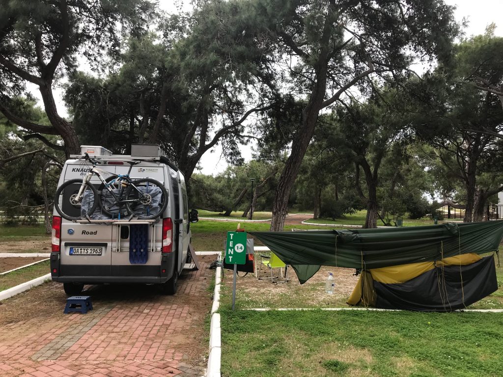 In der Nacht regnet es doch recht stark. Das Zelt schwimmt förmlich im Wasser, aber es hält dicht. Josi schläft wie ein Stein und bleibt trocken. Wir packen schnell ein und fahren nach Antalya, von dort fliegt Josi morgen nach Frankfurt.